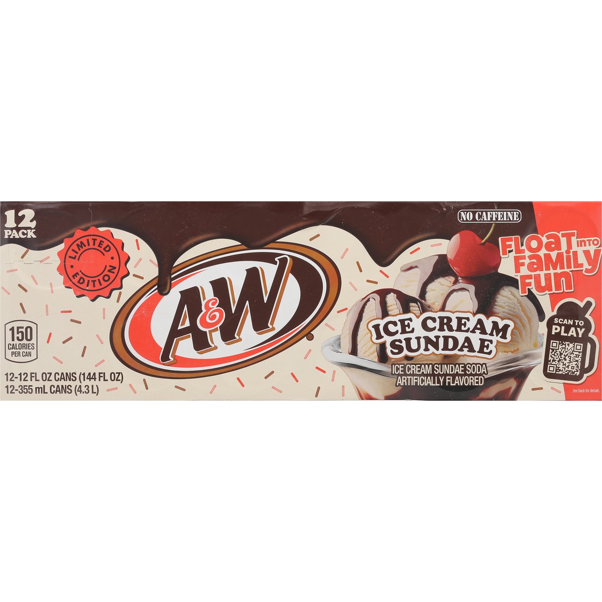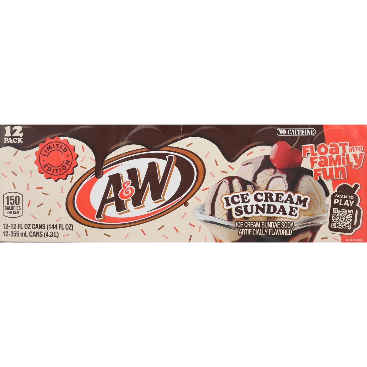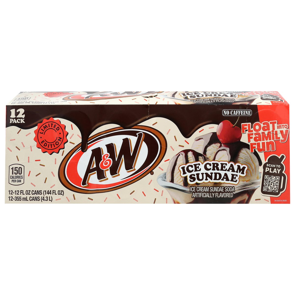 Limited Edition Ice cream sundae soda artificially flavored. 150 calories per can. No caffeine. Caffeine free. Float into family fun. rootbeer.com. how2recycle.info. Scan to play. Scan the QR code to build the ultimate digital float and you could instantly with family night prizes. Try this recipe at home. Breyers float recipe A&W ultimate float 2 scoops of Breyers Vanilla Chocolate Strawberry 6 oz of A&W Ice Cream Sundae Soda Garnish with sprinkles.