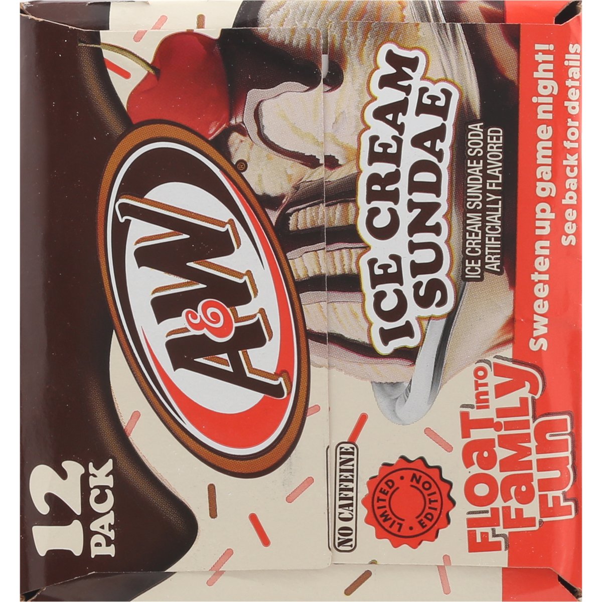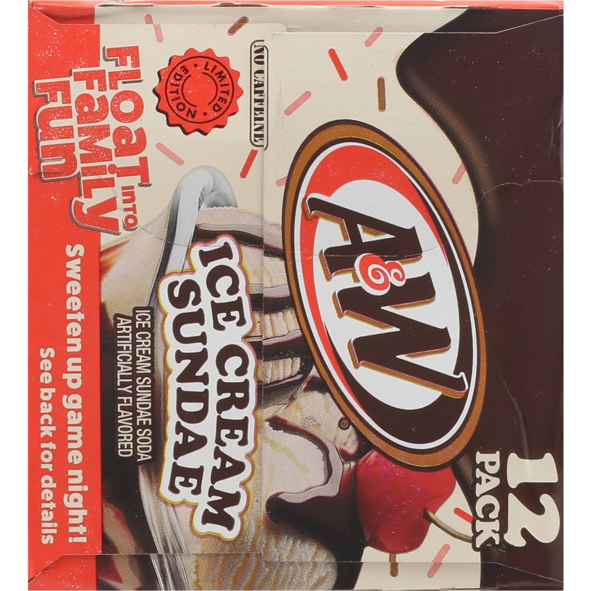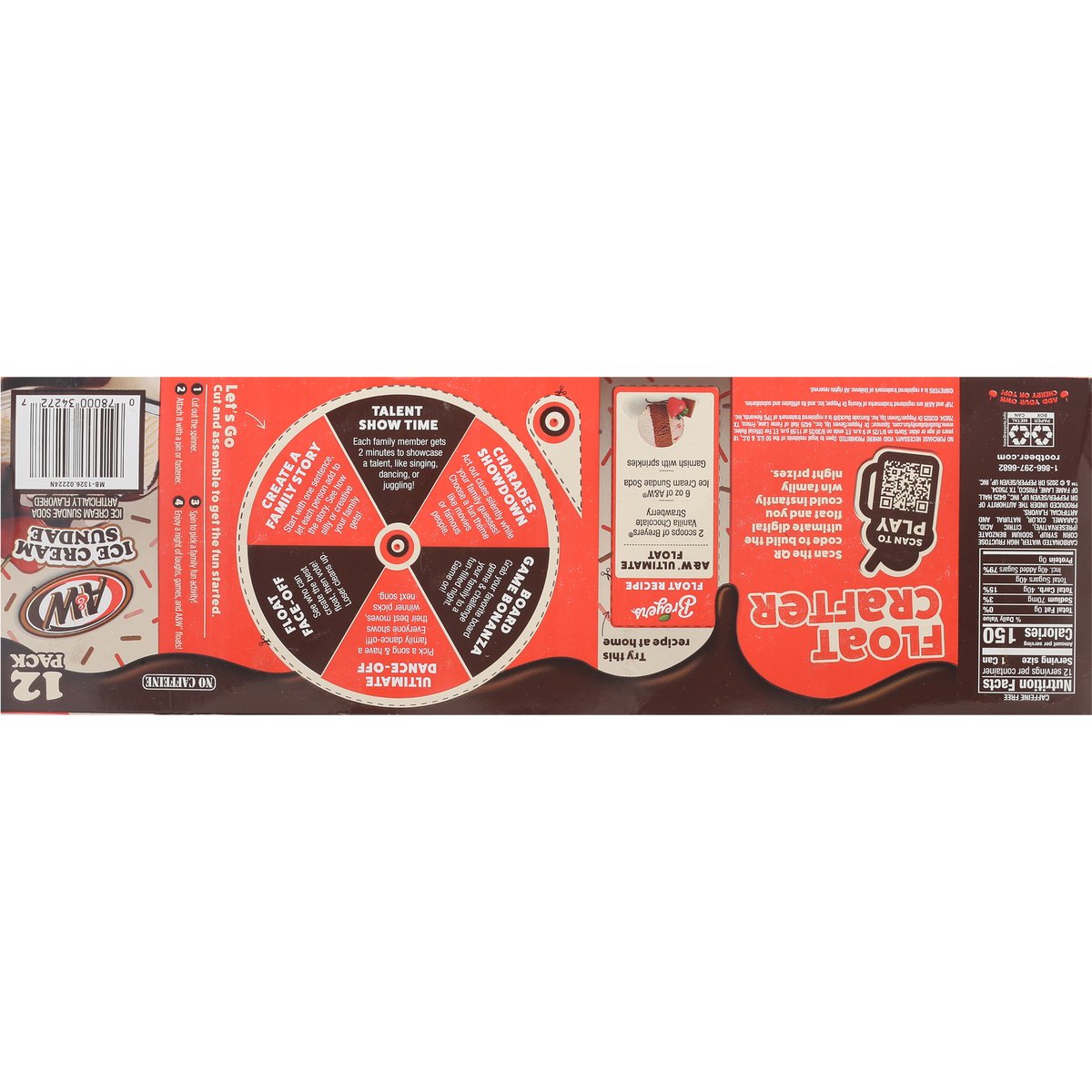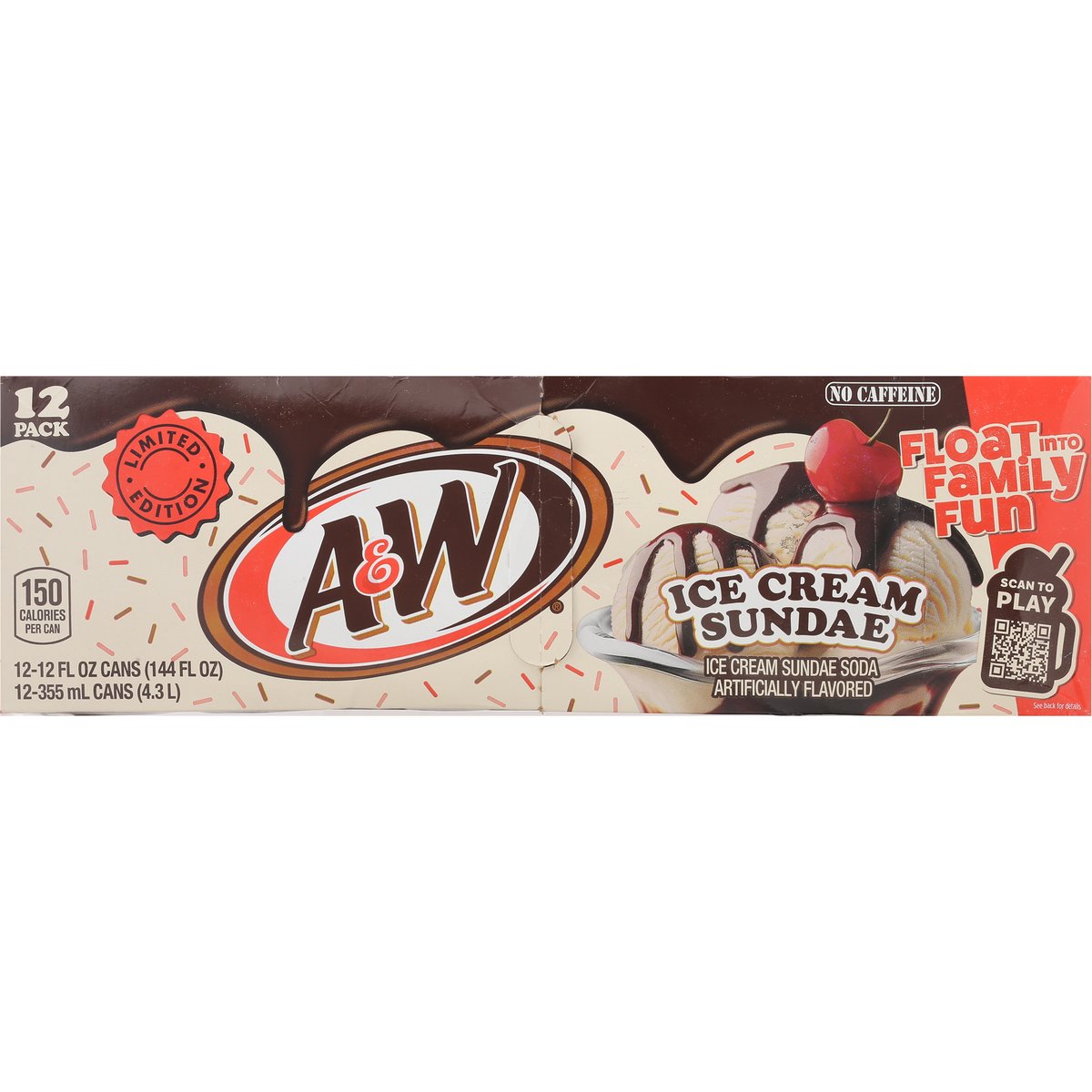 Limited Edition Ice cream sundae soda artificially flavored. 150 calories per can. No caffeine. Caffeine free. Float into family fun. rootbeer.com. how2recycle.info. Scan to play. Scan the QR code to build the ultimate digital float and you could instantly with family night prizes. Try this recipe at home. Breyers float recipe A&W ultimate float 2 scoops of Breyers Vanilla Chocolate Strawberry 6 oz of A&W Ice Cream Sundae Soda Garnish with sprinkles.