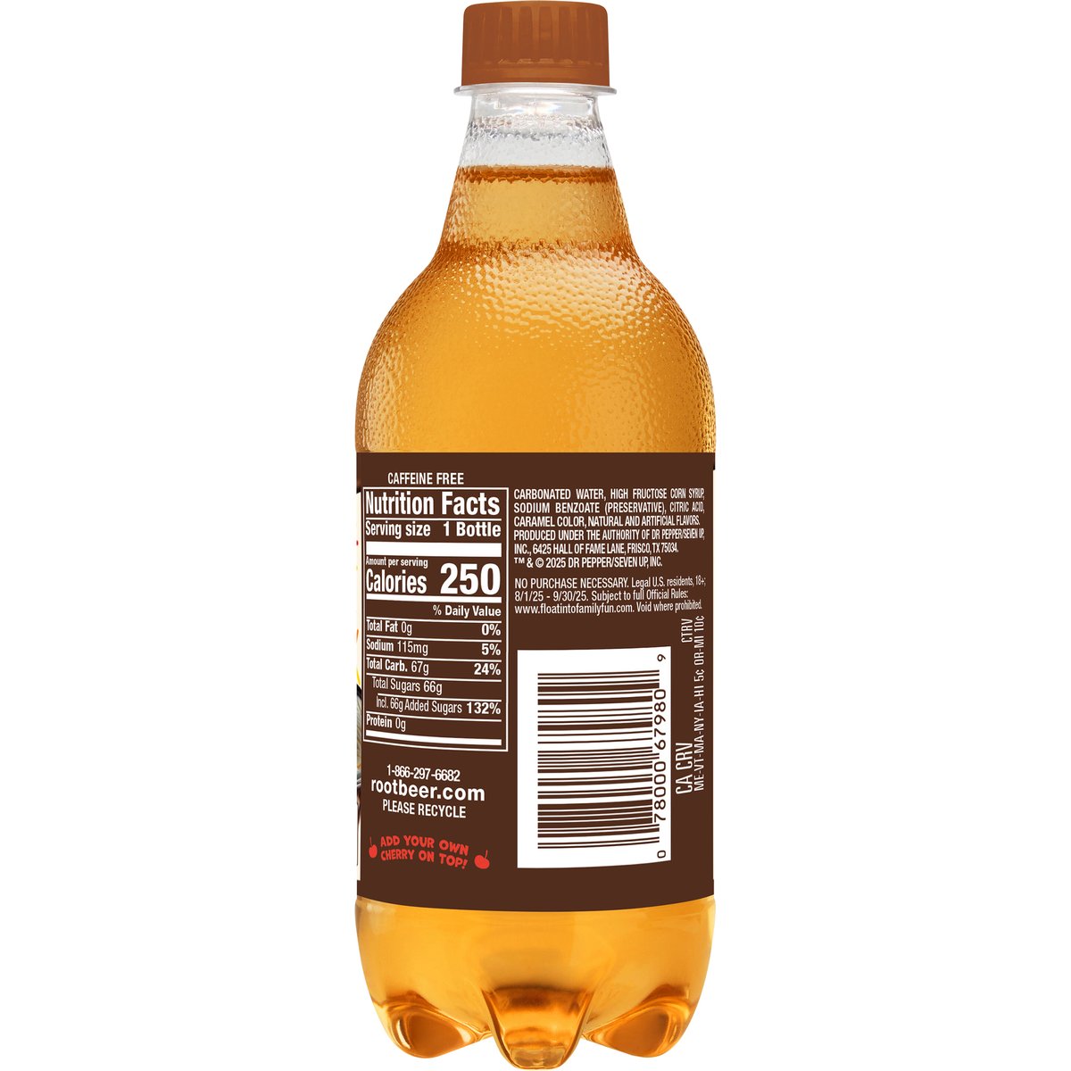 Artificially flavored. 250 calories per bottle. No caffeine. Float into family fun. Add your own cherry on top. rootbeer.com. Scan to play. 1-866-275-2787. Please recycle.