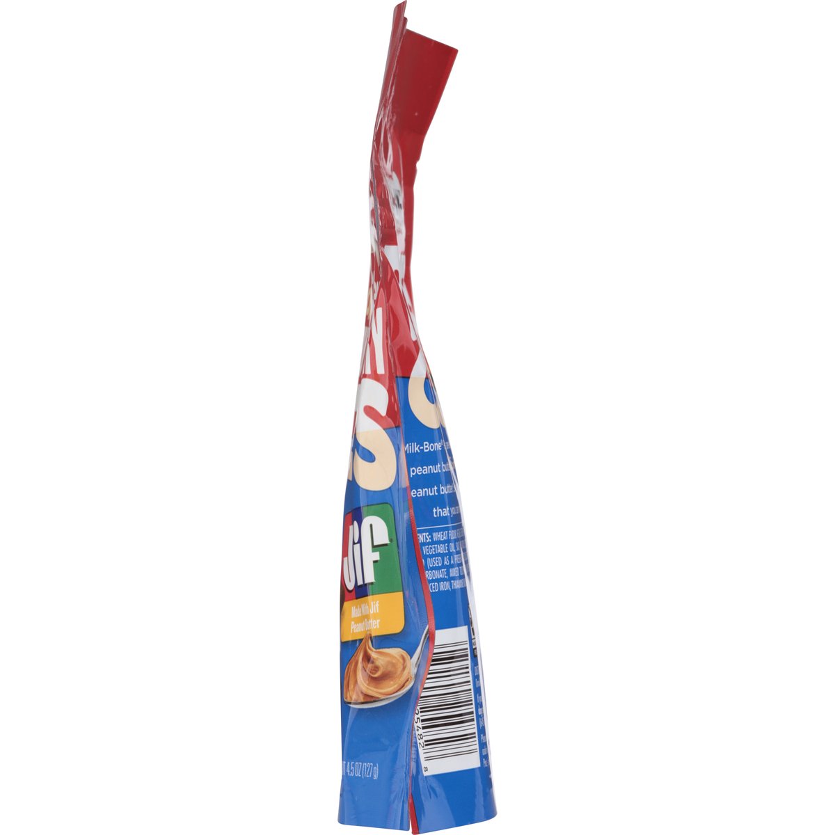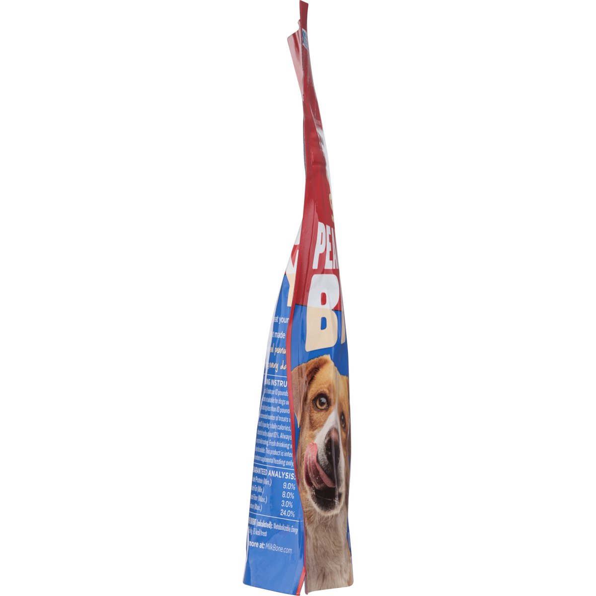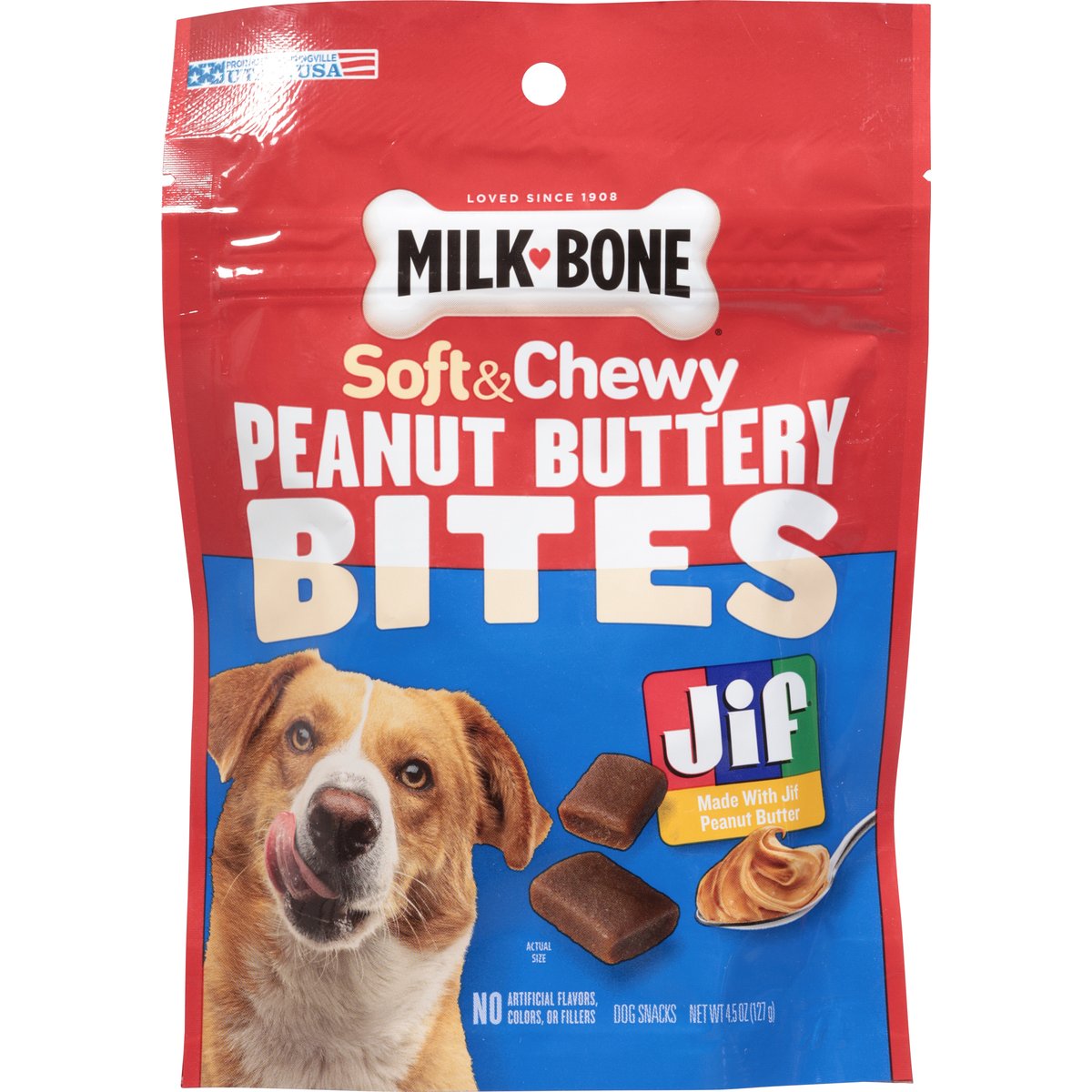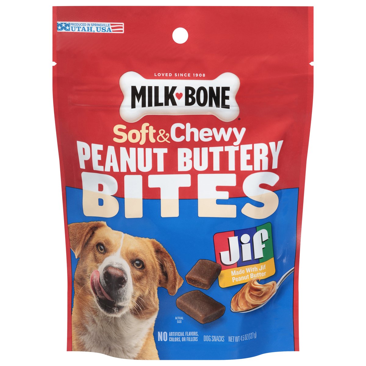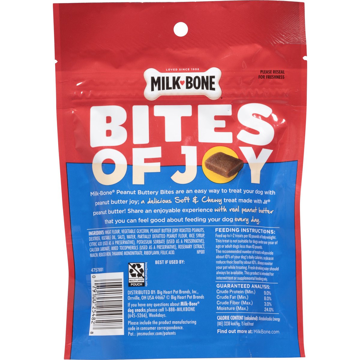 Calorie Content (calculated): Metabolizable energy (ME) 3238 kcal/kg; 15 kcal/treat. No artificial flavors, colors, or fillers. Loved since 1908. Soft & chewy. Bites of Joy: Milk-Bone Peanut Buttery Bites are an easy way to treat your dog with peanut butter joy; a delicious soft & chewy treat made with Jif peanut butter! Share an enjoyable experience with real peanut butter that you can feel good about feeding your dog every day. how2recycle.info. MilkBone.com. If you have any questions about Milk-Bone dog snacks, please call 1-800-Milkbone (645-5266), weekdays. Find out more at: MilkBone.com. Please reseal for freshness. Produced in Springville. Utah, USA.