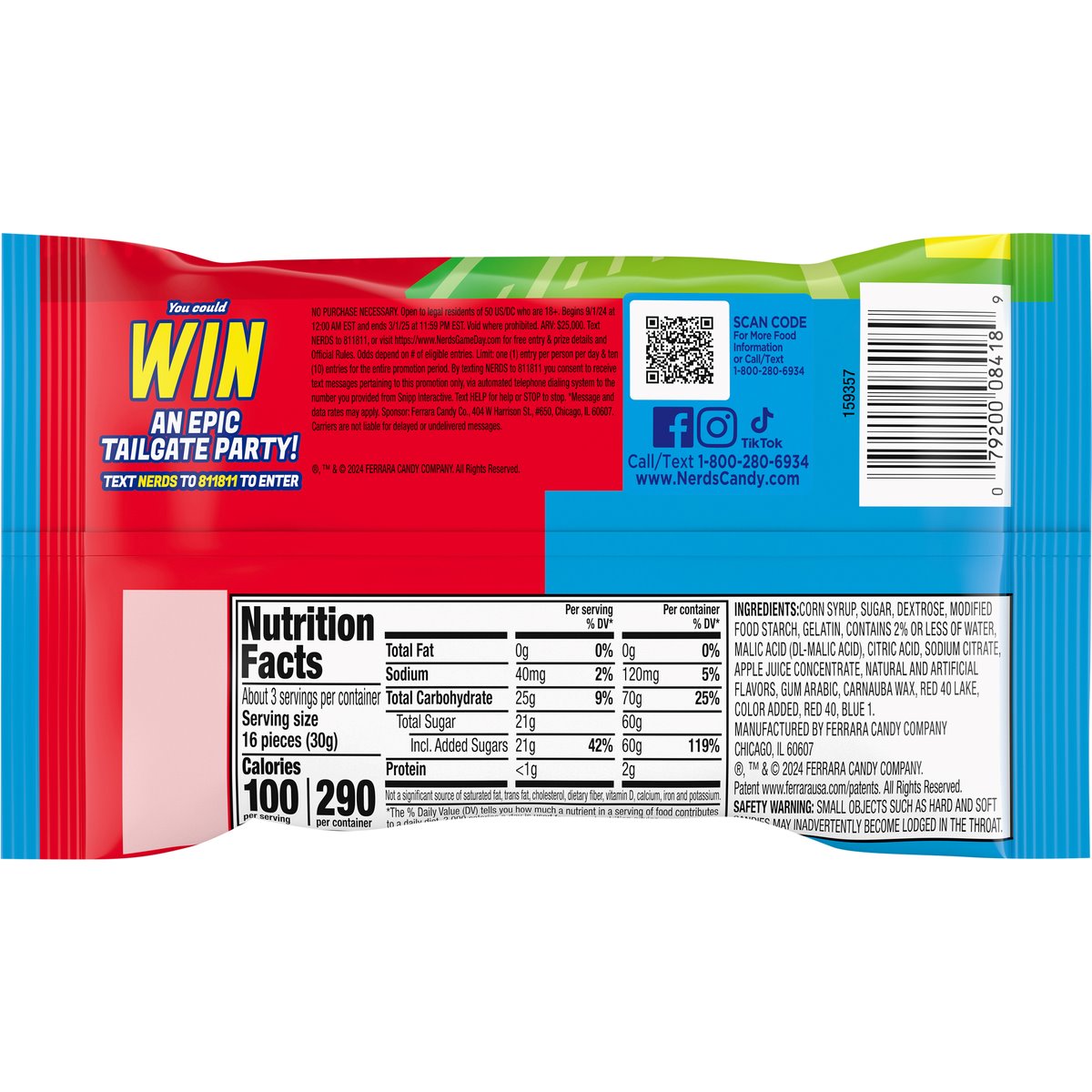 Limited Time Naturally and artificially flavored. 100 calories per serving. About 3 servings per package. www.nerdscandy.com. Scan code for more food information or call/text 1-800-280-6934. Facebook. Instagram. Tiktok. Call/Text 1-800-280-6934. www.NerdsCandy.com. You could win an epic tailgate party! See back for details. Nerds make the rivalry sweeter. You could win an epic tailgate party! Text NERDS to 811811 to enter. Tangy & crunchy. Sweet & gummy inside. No purchase necessary. Open to legal residents of 50 US/DC who are 18+. Begins 9/1/24 at 12:00 AM EST and ends 3/1/25 at 11:59 PM EST. Void where prohibited. ARV: $25,000. Text NERDS to 811811, or visit ttps://www.nerdsgameday.com for free entry & prize details and official rules. Odds depend on (hashtag) of eligible entries. Limit: One (1) entry per person per day & ten (10) entries for the entire promotion period. By texting NERDS to 811811 you consent to receive to text messages pertaining to this promotion only, via automated telephone dialing system to the number you provided from Snipp Interactive. Text HELP for help or STOP to stop.