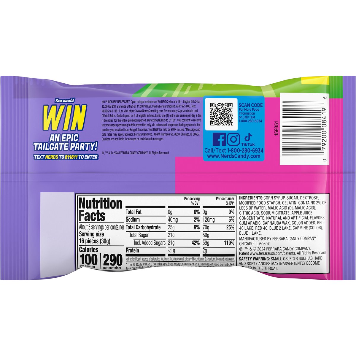 Limited Time Naturally and artificially flavored. 100 calories per serving. About 3 servings per package. Tangy & crunchy outside. Sweet & gummy inside. www.nerdscandy.com. Scan code for more food information or call/text 1-800-280-6934. Facebook. Instagram. Tiktok. Call/Text 1-800-280-6934. www.nerdscandy.com. You could win an epic tailgate party! See back for details. Nerds make the rivalry sweeter. You could win an epic tailgate party! Text Nerds to 811811 to enter. No purchase necessary. Open to legal residents of 50 US/DC who are 18+. Begins 9/1/24 at 12:00 AM EST and ends 3/1/25 at 11:59 PM EST. Void where prohibited. ARV: $25,000. Text Nerds to 811811, or visit ttps://www.nerdsgameday.com for free entry & prize details and official rules. Odds depend on (hashtag) of eligible entries. Limit: One (1) entry per person per day & ten (10) entries for the entire promotion period. By texting Nerds to 811811 you consent to receive to text messages pertaining to this promotion only, via automated telephone dialing system to the number you provided from Snipp Interactive. Text help for help or stop to stop.