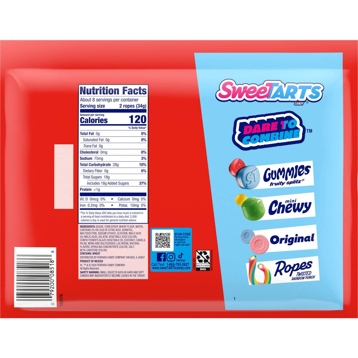 Limited Edition Red, white & blue tropical punch. Naturally and artificially flavored. 120 calories per serving. Limited edition. Soft & chewy. Red, white & blue. www.sweetartscandy.com. how2recycle.info. Scan code for more food information or call 1-866-793-3827. Facebook. Instagram. TikTok. Call/text 1-866-793-3827. www.sweetartscandy.com. Dare to Combine: Gummies fruity splitz; mini Chewy; Original; Ropes twisted rainbow punch. Product of Mexico.