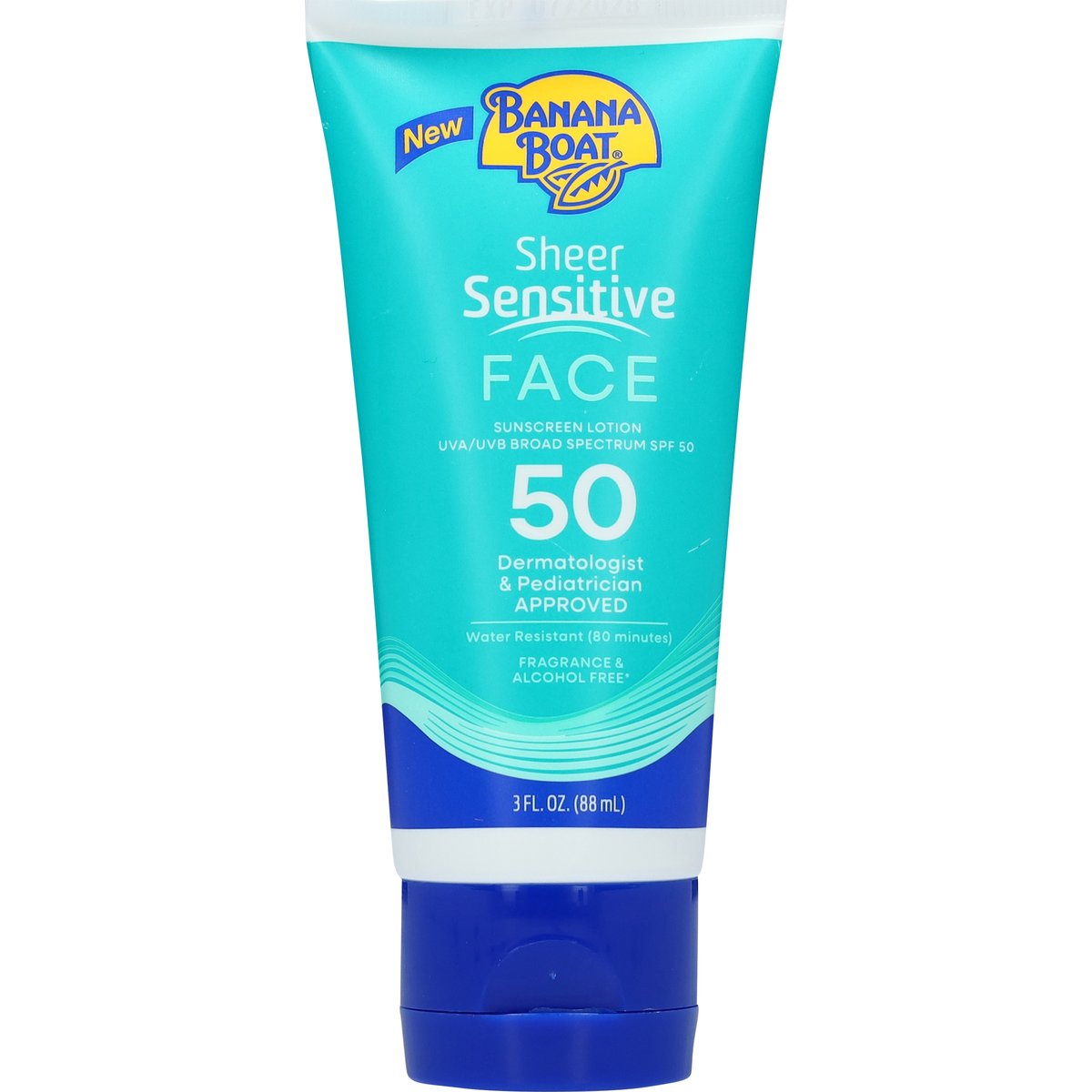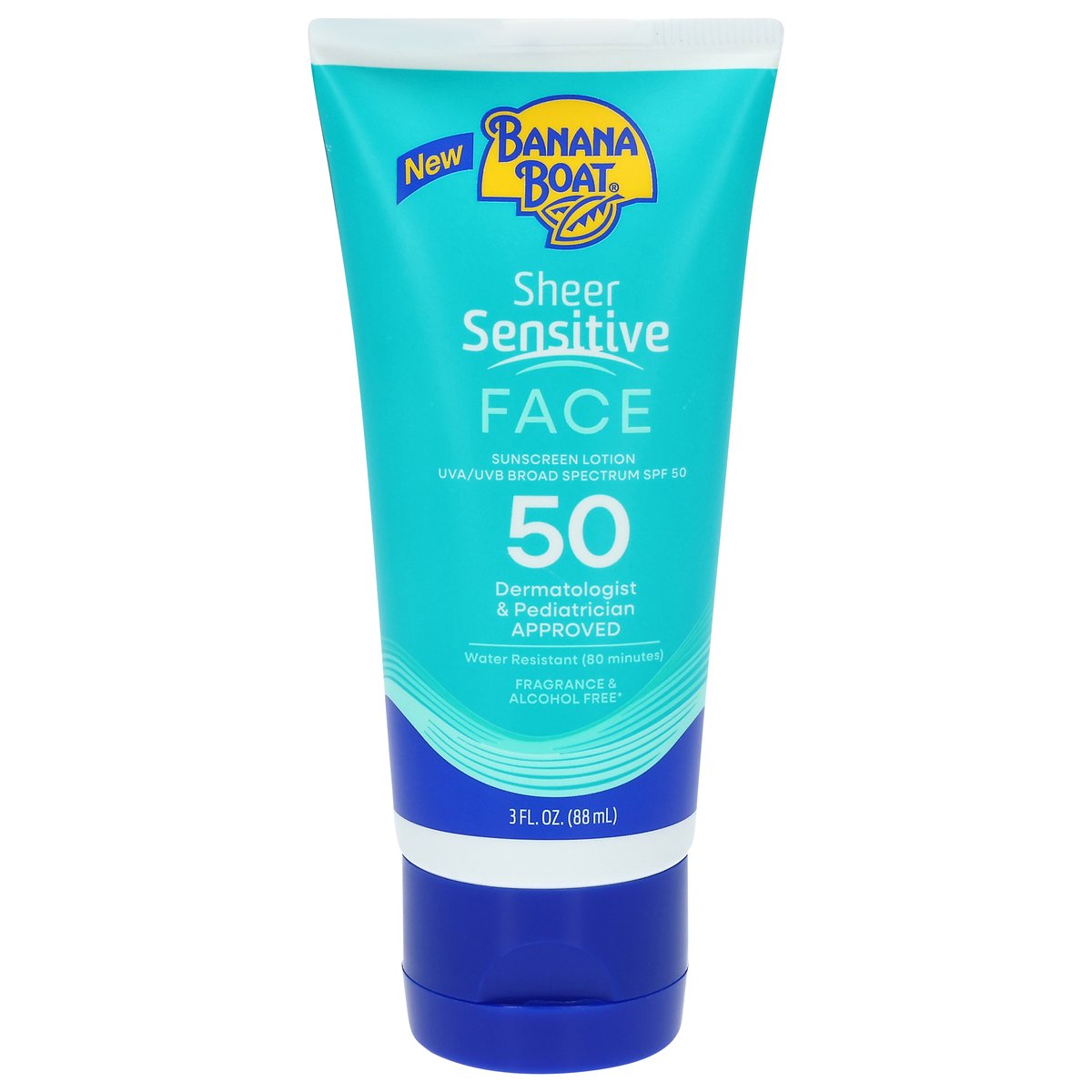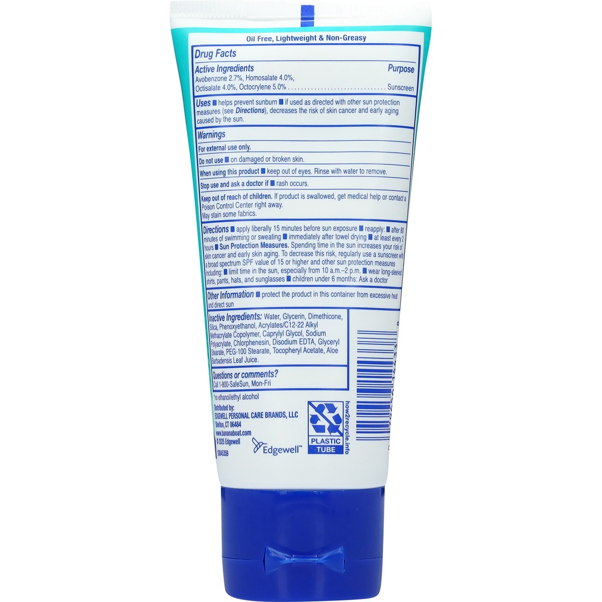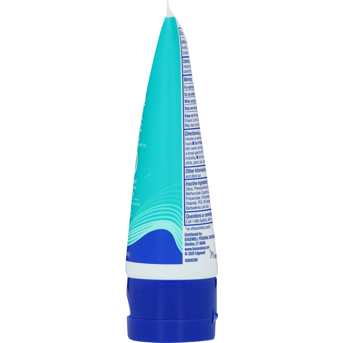 Other Information: Protect the product in this container from excessive heat and direct sun. New. UVA/UVB broad spectrum SPF 50. Dermatologist & pediatrician approved. Water resistant (80 minutes). Fragrance & alcohol free*. Oil free, lightweight & non-greasy. * No ethanol/ethyl alcohol. www.bananaboat.com. how2recycle.info. Questions or comments? Call 1-800-SafeSun, Mon-Fri.