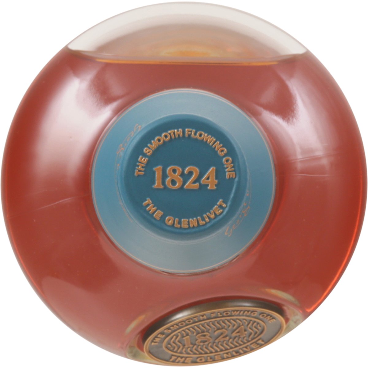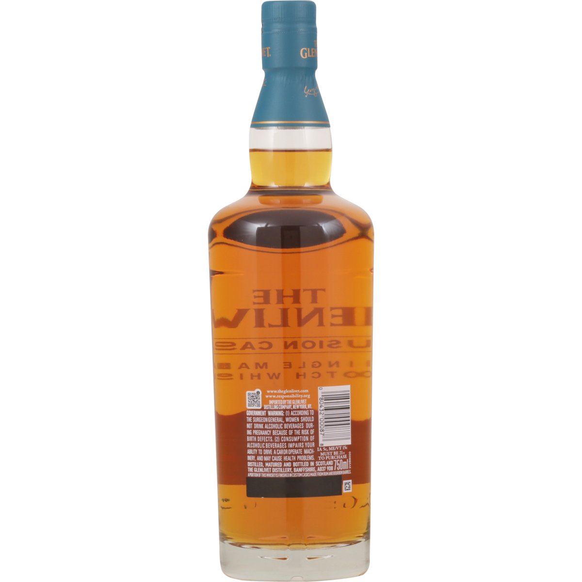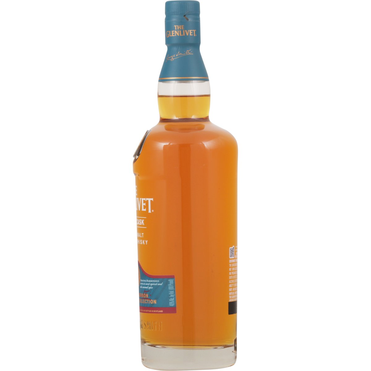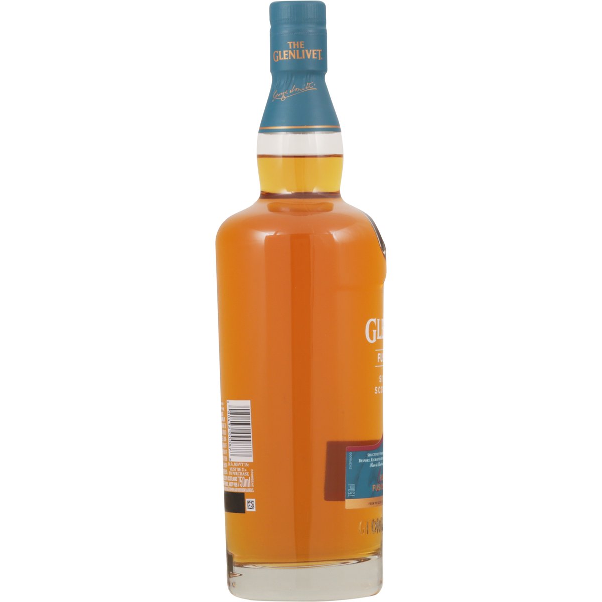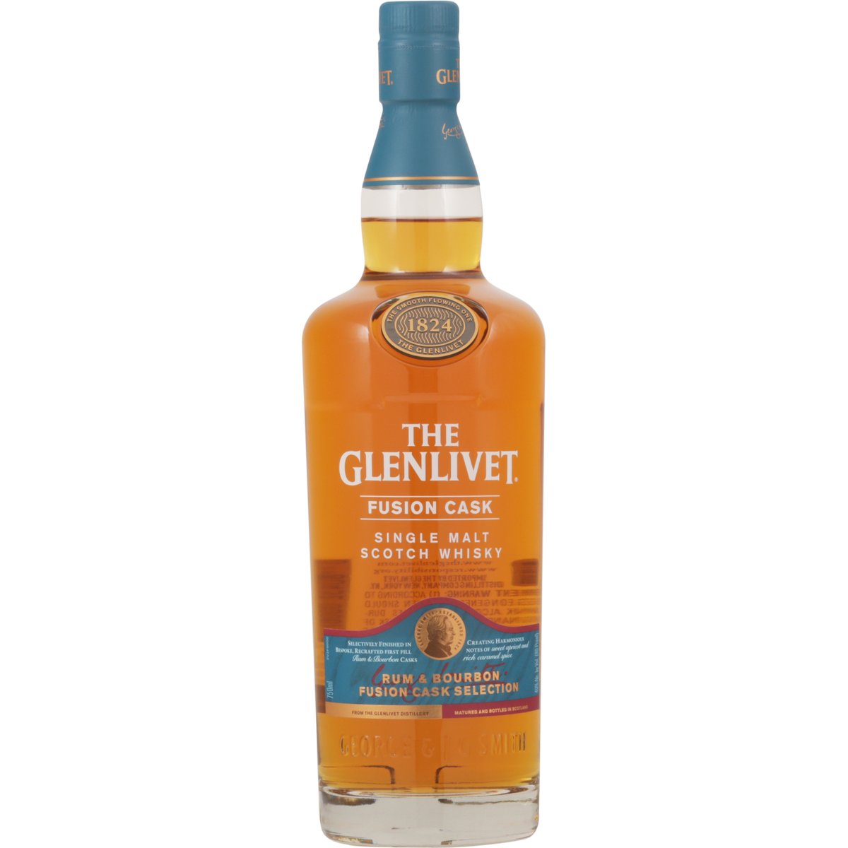 Single malt scotch whisky. 1824. The smooth flowing one. The Glenlivet. Selectively finished in bespoke, recrafted first fill. Rum & bourbon casks. Creating harmonious notes of sweet apricot and rich caramel spice. Rum & bourbon fusion cask selection. From the Glenlivet Distillery. A portion of this whisky is finished in custom casks made from rum and bourbon barrels. www.theglenlivet.com. www.responsibility.org. 40% Alc. by Vol. 80 Matured and bottled in Scotland.