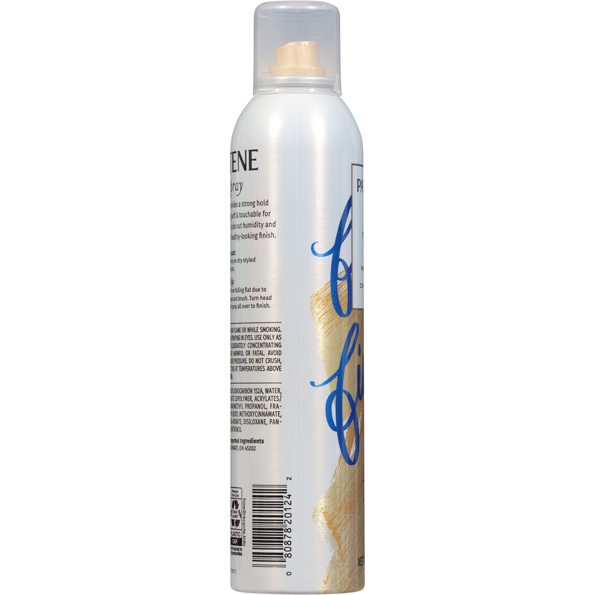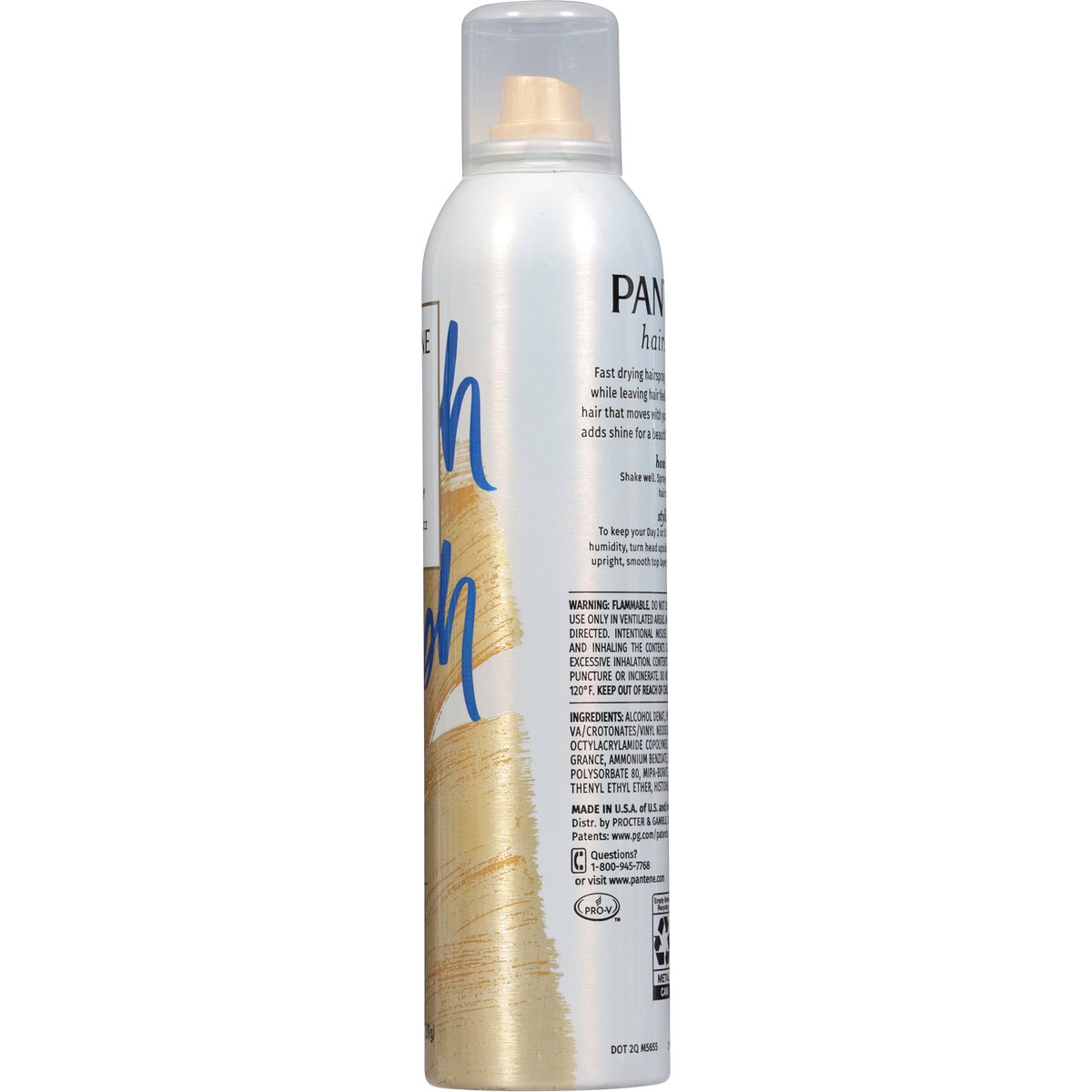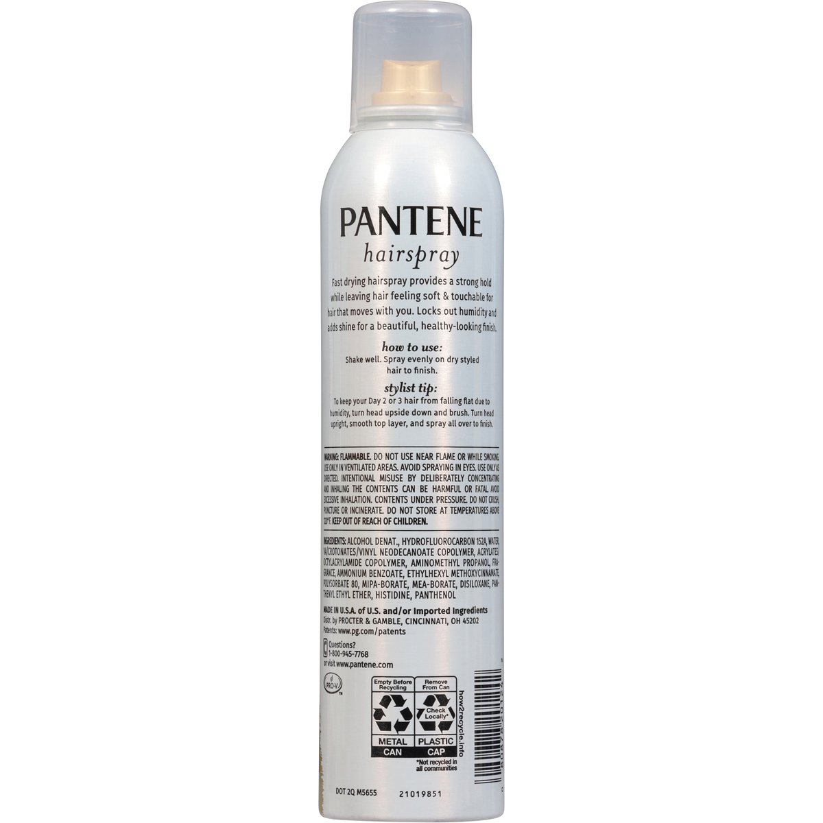 Controls frizz. Fast drying hairspray provides a strong hold while leaving hair feeling soft & touchable for hair that moves with you. Locks out humidity and adds shine for a beautiful, healthy-looking finish. www.pantene.com. how2recycle.info. Questions? 1-800-945-7768 or visit www.pantene.com. Made in U.S.A. of U.S. and/or imported ingredients.