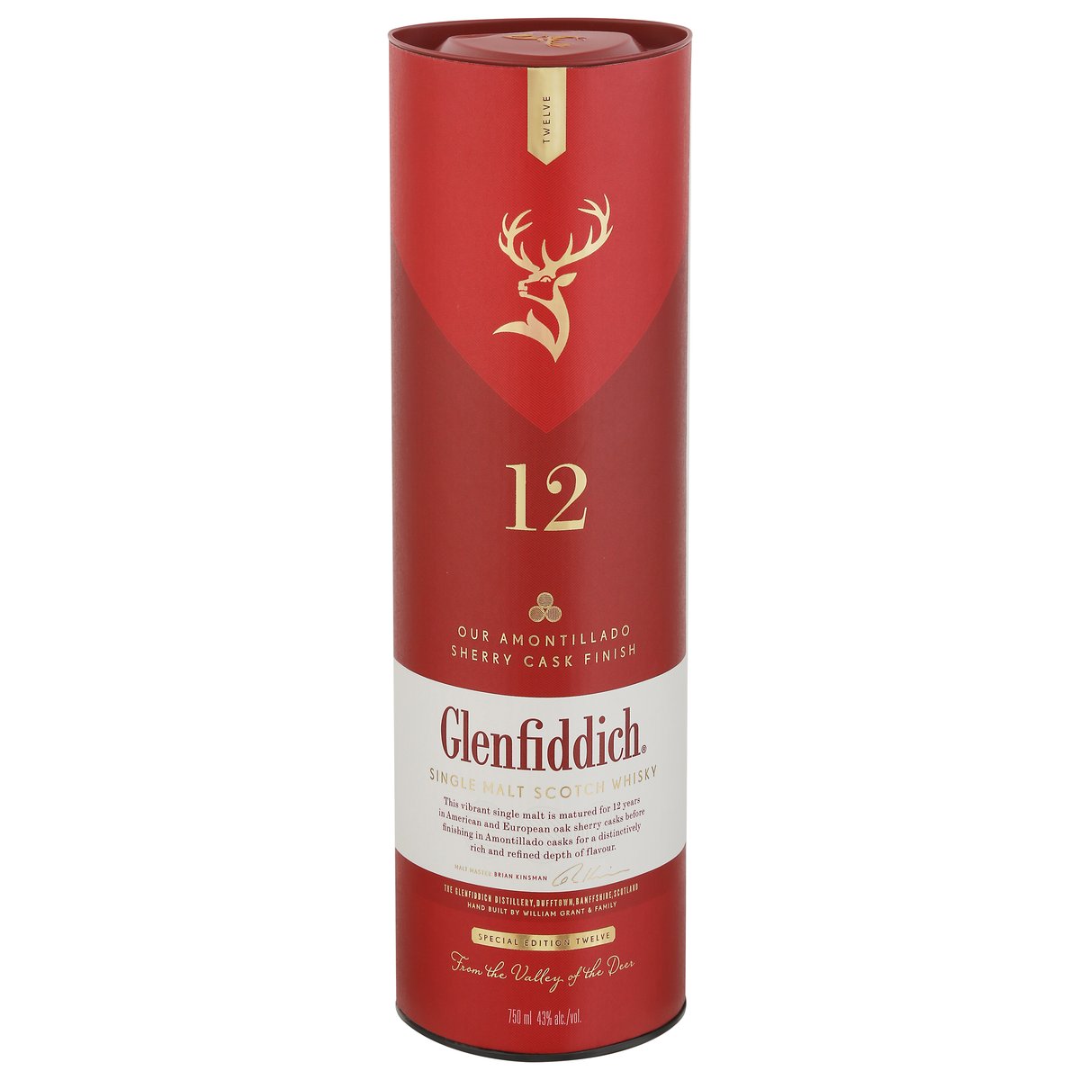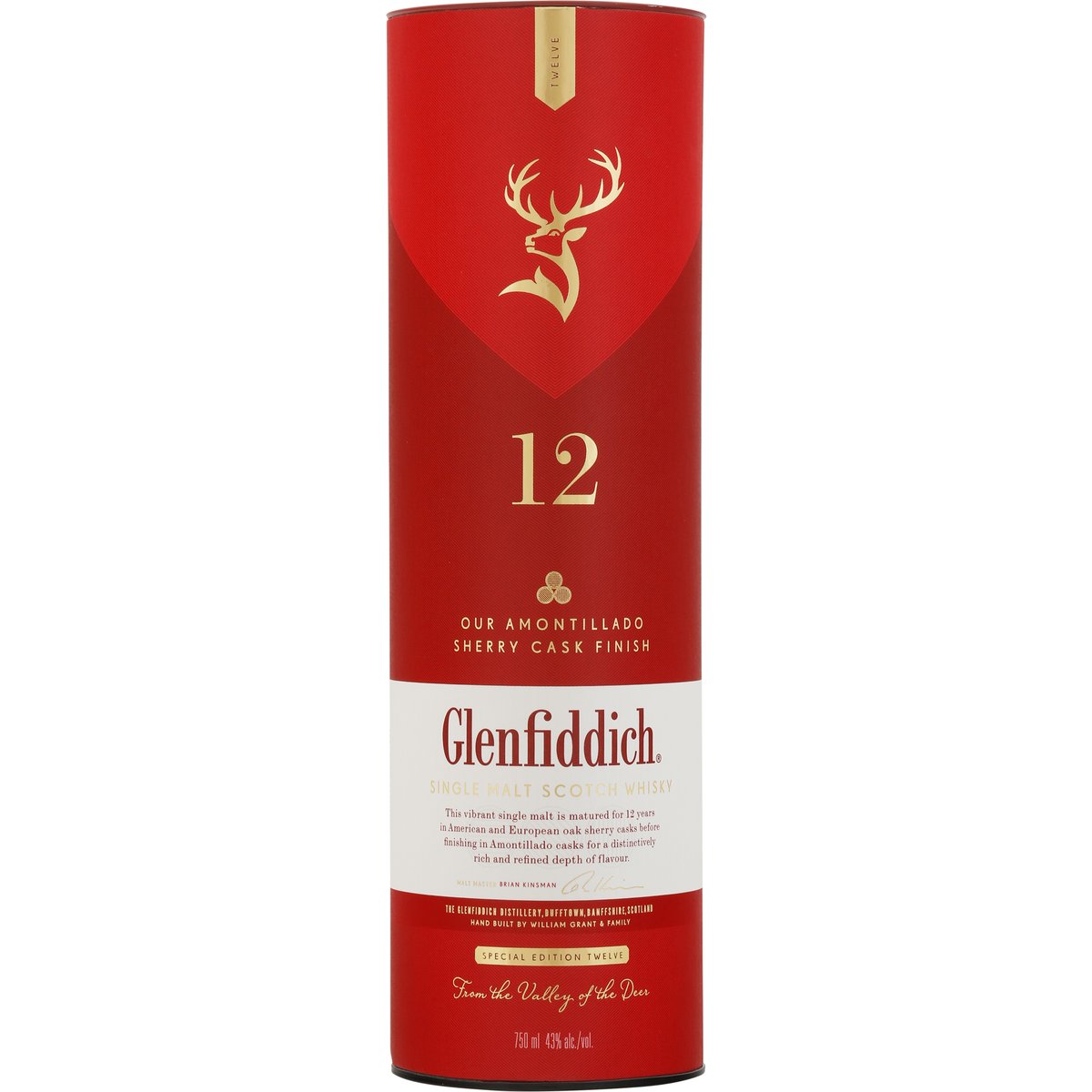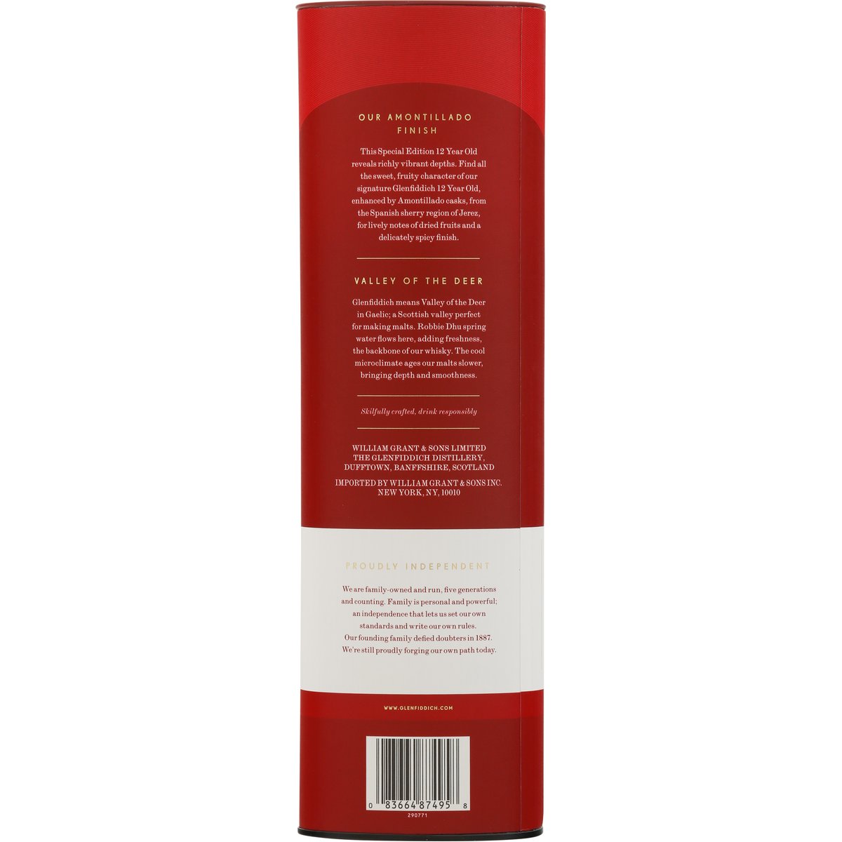 Special Edition Twelve This vibrant single malt is matured for 12 years in American and European oak sherry casks before finishing in Amontillado casks for a distinctively rich and refined depth of flavour. Our amontillado sherry cask finish. Malt Master, Brian Kinsman. Hand built by William Grant & family. From the valley of the deer. Our Amontillado Finish: This Special Edition 12 Year Old reveals richly vibrant depths. Find all the sweet, fruity character of our signature Glenfiddich 12 Year Old, enhanced by Amontillado casks, from the Spanish sherry region of Jerez, for lively notes of dried fruits and a delicately spicy finish. Valley of the Deer: Glenfiddich means Valley of the Deer in Gaelic; a Scottish valley perfect for making malts. Robbie Dhu spring water flows here, adding freshness, the backbone of our whisky. The cool microclimate ages our malts slower, bringing depth and smoothness. Skillfully crafted, drink responsibly. Proudly Independent: We are family-owned and run, five generations and counting. Family is personal and powerful; an independence that lets us set our own standards and write our own rules. Our founding family defied doubters in 1887. We're still proudly forging our own path today. Independent family-run distillers since 1887. www.glenfiddich.com. 43% Alc./Vol. 86 The Glenfiddich Distillery, Dufftown, Banffshire, Scotland. Product of Scotland.