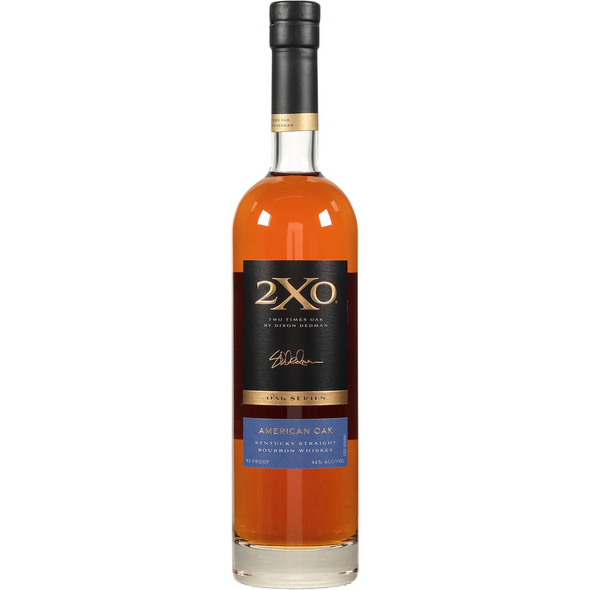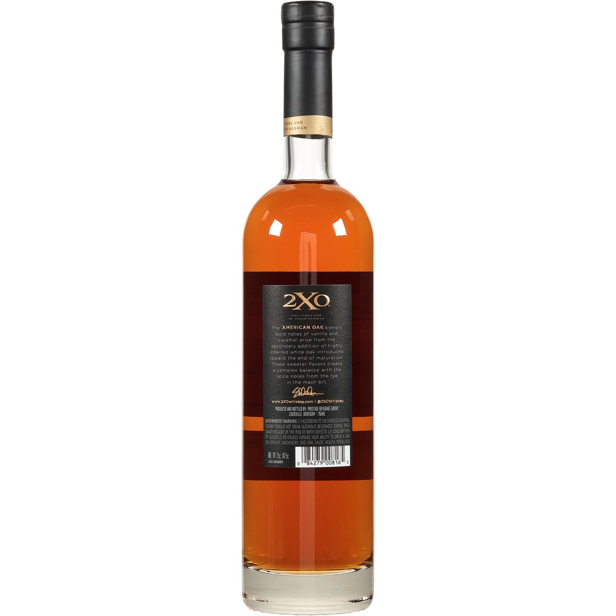 Kentucky straight Bourbon whiskey. Two times oak by Dixon Dedman. Oak series. The American Oak blend's bold notes of vanilla and caramel arise from the secondary addition of highly charred white oak introduced toward the end of maturation. These sweeter flavors create a complex balance with the spice notes from the rye in the mash bill. www.2XOwhiskey.com. @2XOwhiskey. 46% alc/vol. 92 Poduced and Bottled by: Prestige Beverage Group, Louisville, Kentucky.