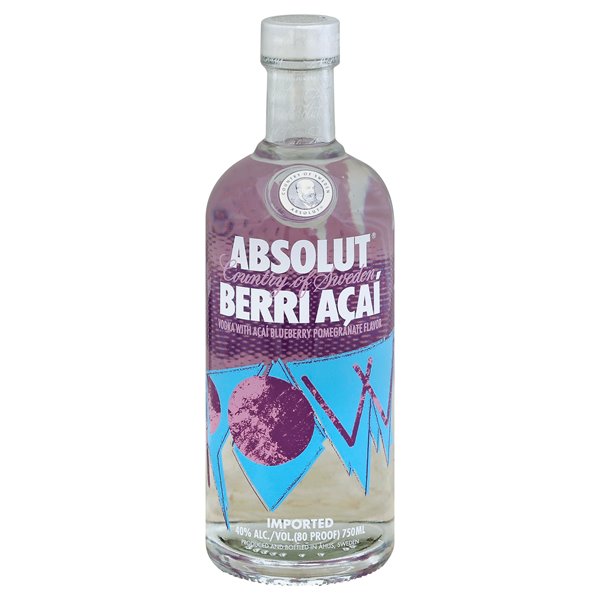 Vodka with acai blueberry pomegranate flavor. Imported. absolut.com. 40%. Enjoy with Absolut responsibility. 40% alc./vol. (80 proof). Country of Sweden. Produced and bottled in Ahus, Sweden.
