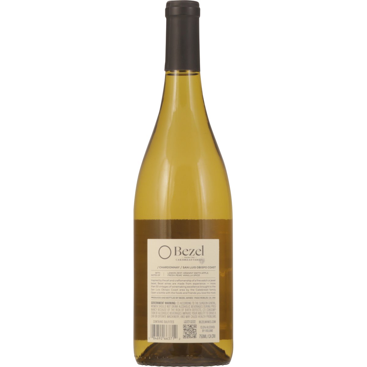 From the Cakebread family. With notes of lemon zest, granny smith apple, fresh pear, vanilla spice. Inspired by the art and craftsmanship of a fine watch or jewel bezel, Bezel wines are made from experience - more than 50 vintages of winemaking excellence brought to the San Luis Obispo Coast area by the Cakebread family. Open a bottle with the foods and friends you love the most. bezelwines.com. Learn more about Bezel. 13.5% alcohol by volume. 27 Produced and bottled by Bezel Wines - Paso Robles, CA, USA.