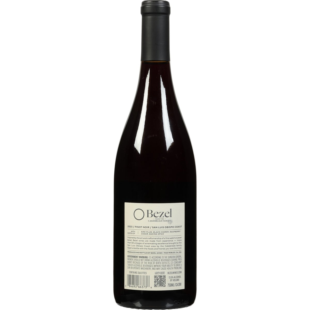 Bezel from the Cakebread family. With notes of ripe plum, black cherry, raspberry cedar, baking spice. Inspired by the art and craftsmanship of a fine watch or jewel bezel, Bezel wines are made from experience - more than 50 vintages of winemaking excellence brought to the San Luis Obispo Coast area by the Cakebread family. Open a bottle with the foods and friends you love the most. bezelwines.com. Learn more about Bezel. 13.5% alcohol by volume 27 Produced and bottled by Bezel Wines Paso Robles, CA, USA.