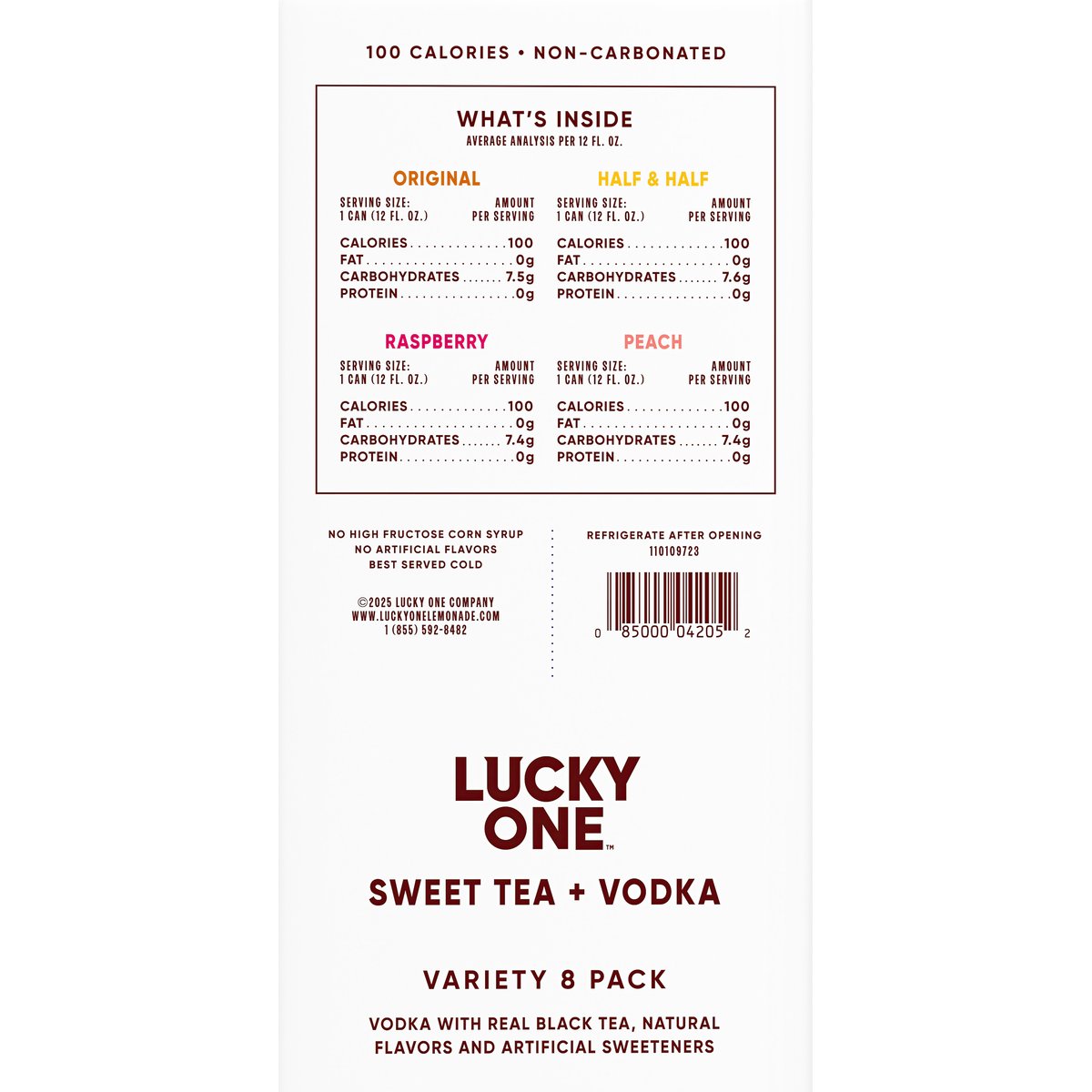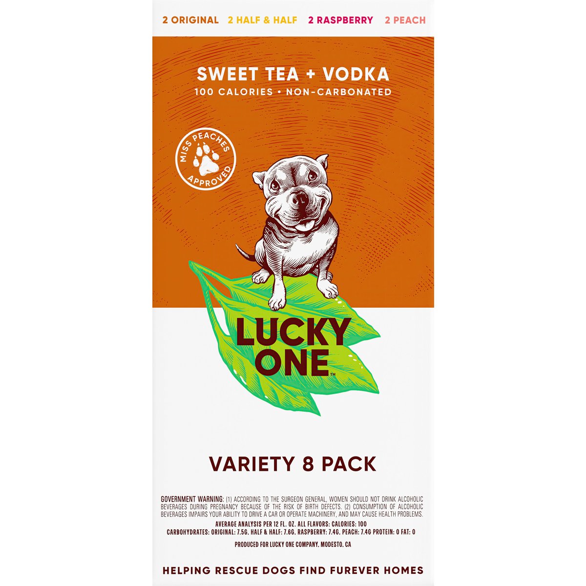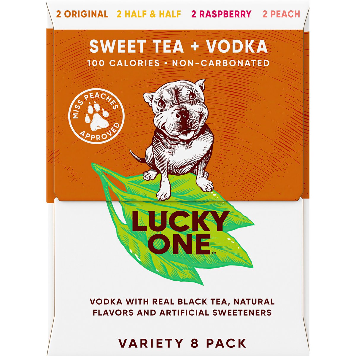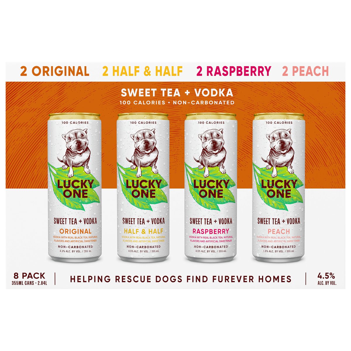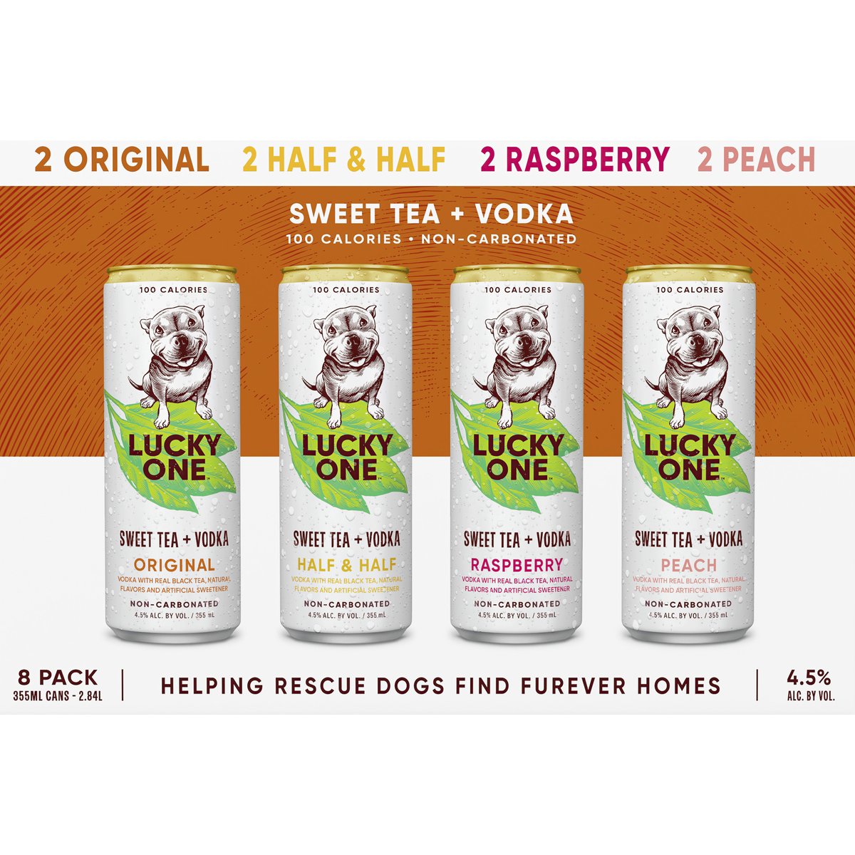 2 Original, 2 Half & Half, 2 Raspberry, 2 Peach. Vodka with real black tea, natural flavors and artificial sweeteners. 100 calories. No high fructose corn syrup. No artificial flavors. Helping rescue dogs find furever homes. www.luckyonelemonade.com. 4.5% alc. by vol. 9