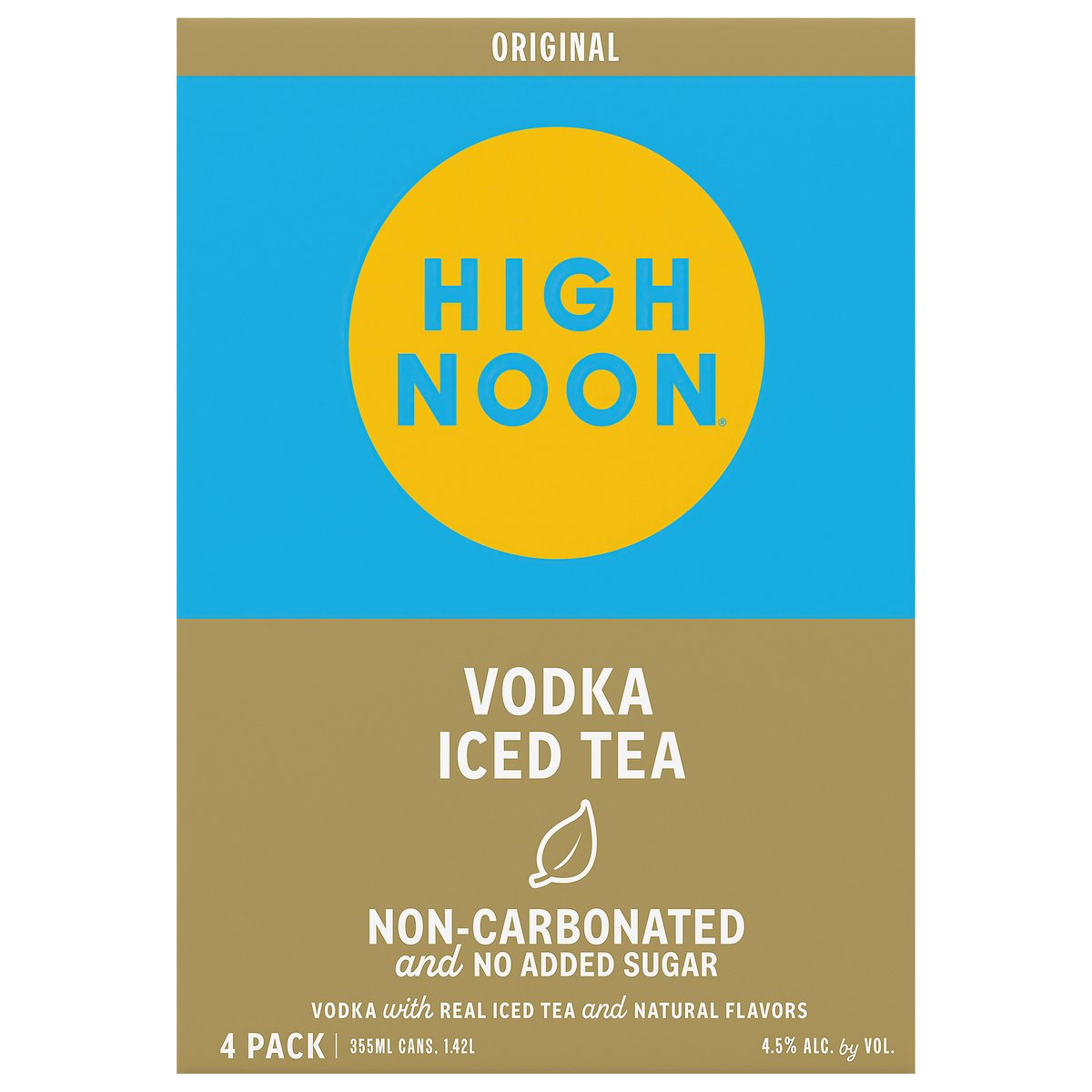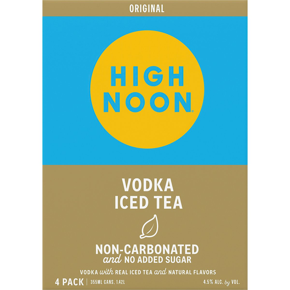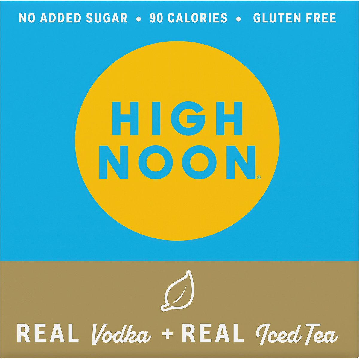Vodka with real iced tea and natural flavors. No artificial flavors. 90 calories. Gluten free. No added sugar. Non-carbonated and no added sugar. No high fructose corn syrup. www.highnoonspirits.com. 1 (855) 592-8482. 4.5% alc. by vol. 9