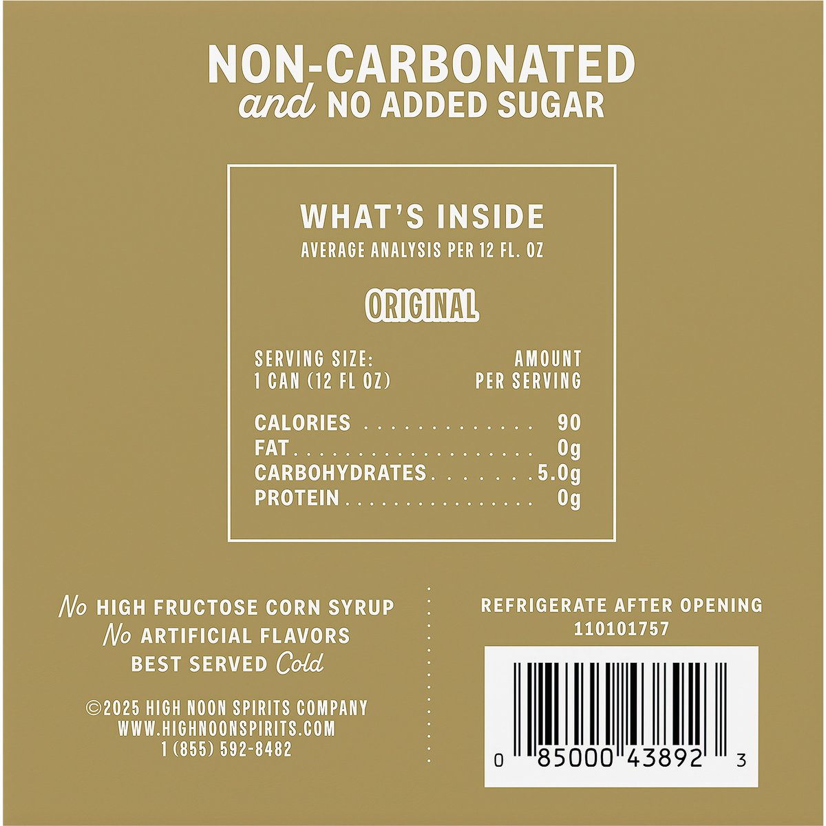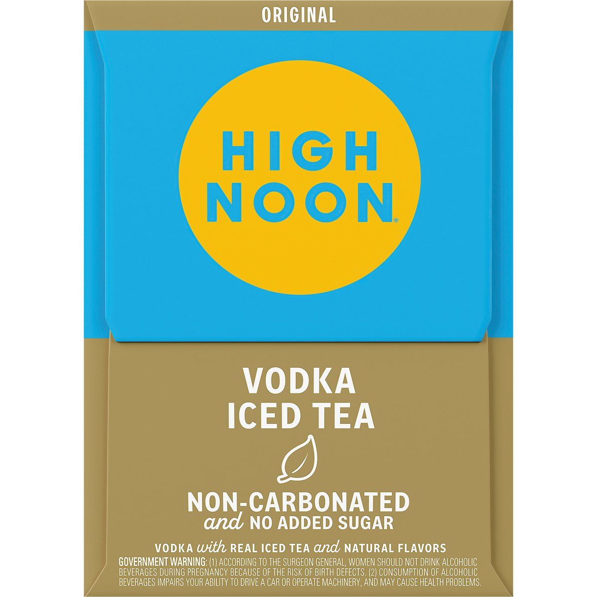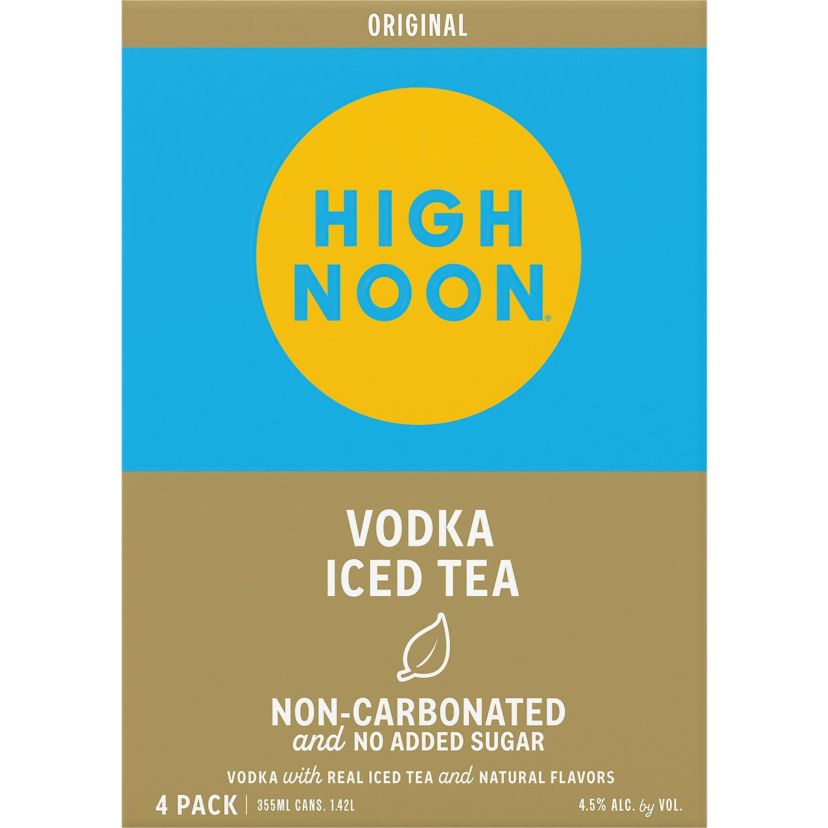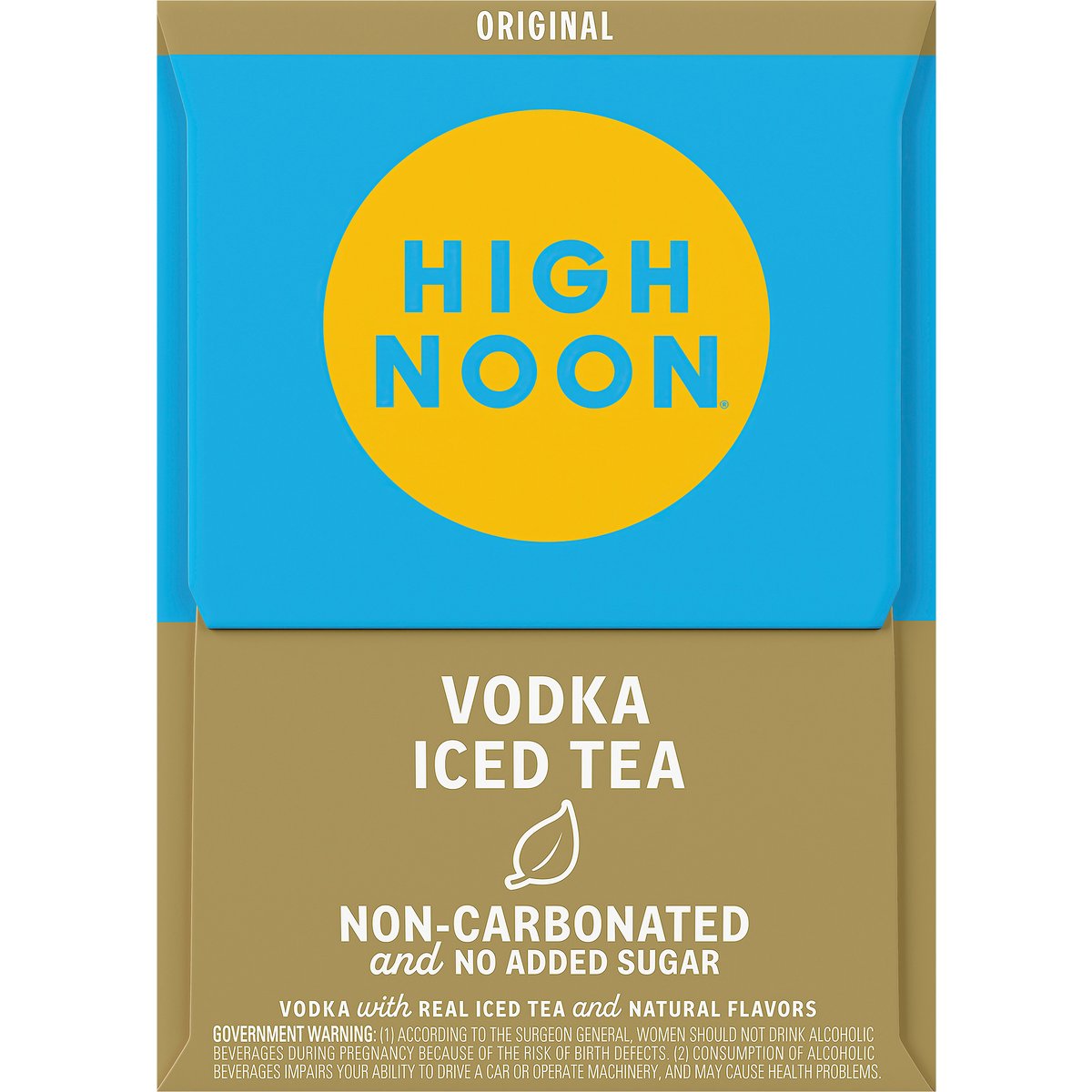 Vodka with real iced tea and natural flavors. No artificial flavors. 90 calories. Gluten free. No added sugar. Non-carbonated and no added sugar. No high fructose corn syrup. www.highnoonspirits.com. 1 (855) 592-8482. 4.5% alc. by vol. 9