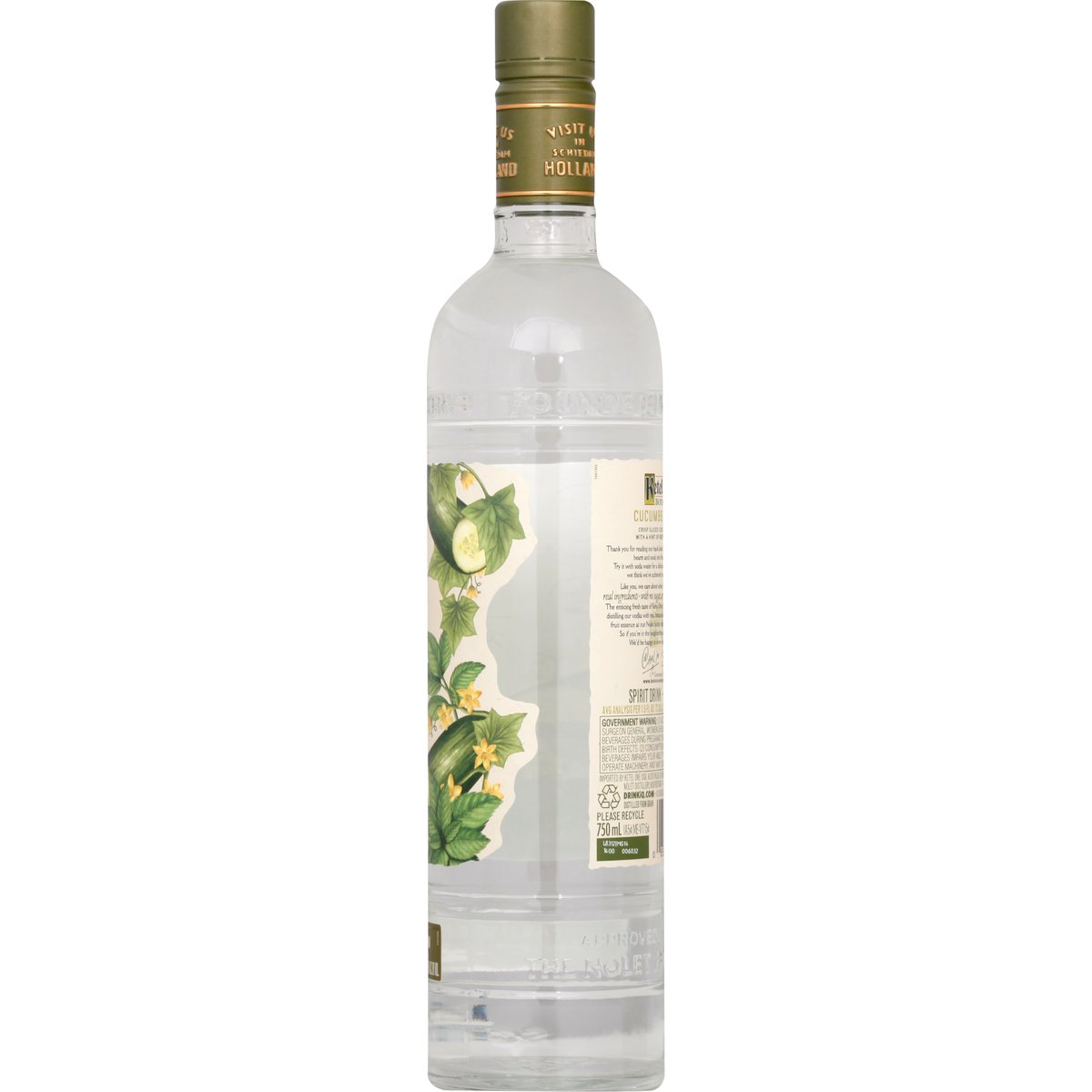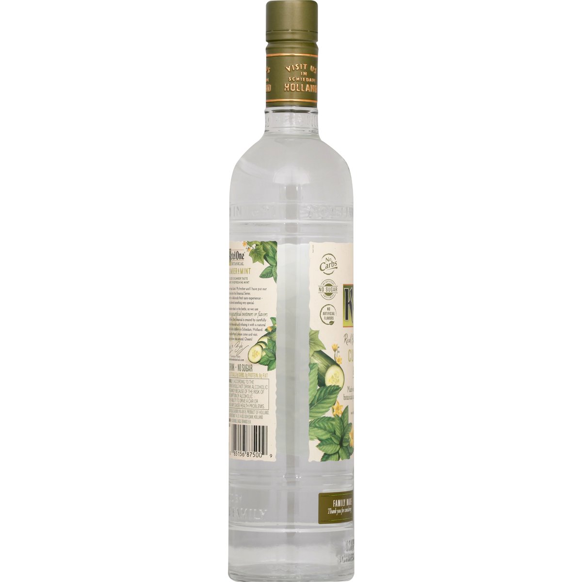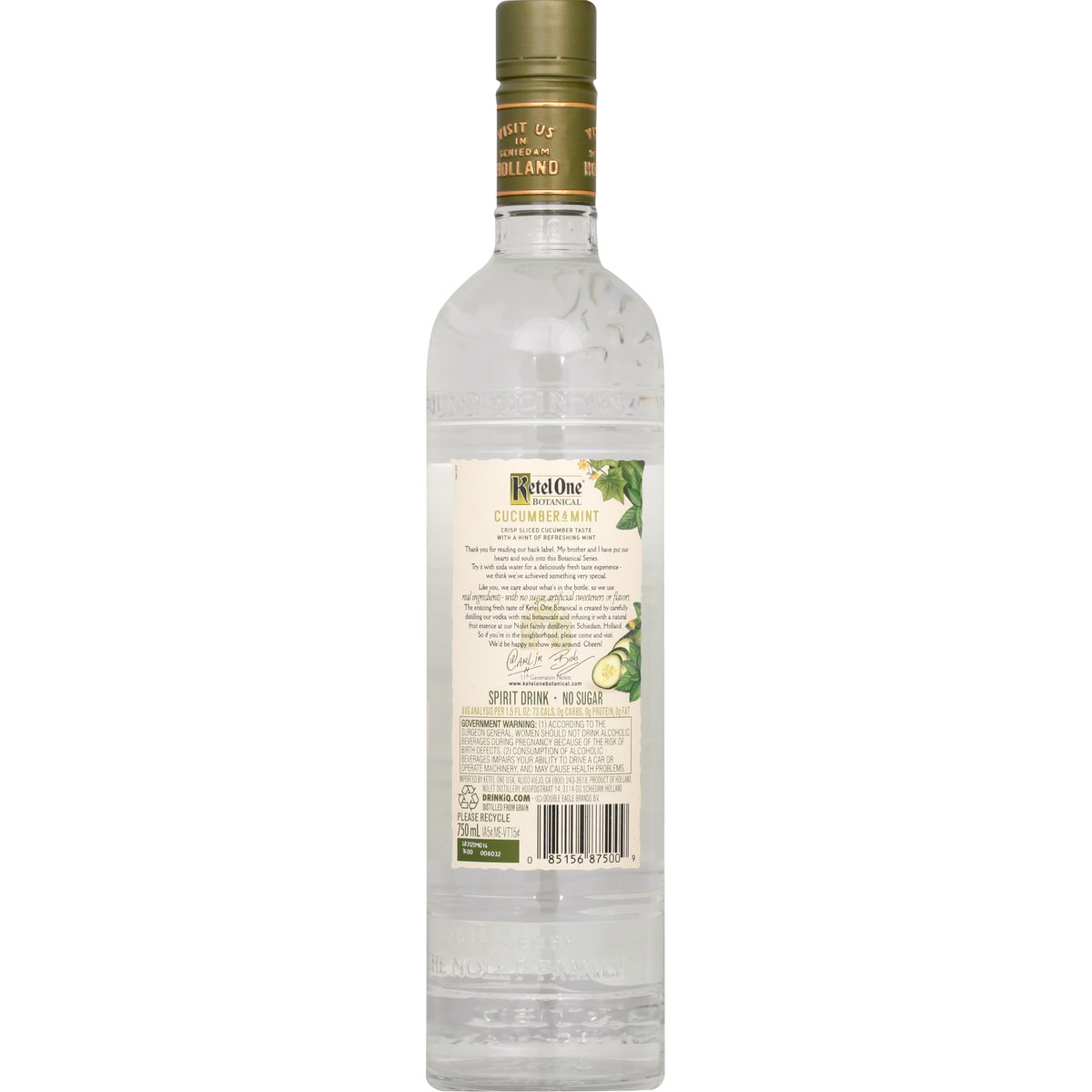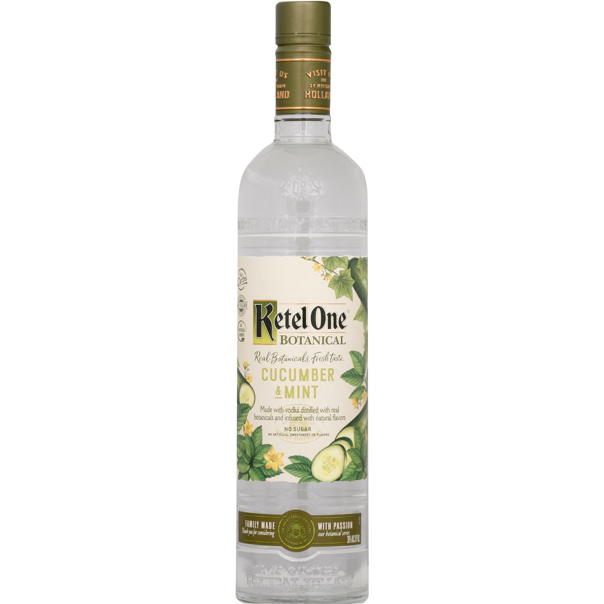 Made with vodka distilled with real botanicals and infused with natural flavors. No artificial sweeteners or flavors. No artificial flavors. Avg. analysis per 1.5 fl oz: 73 cals, 0 g carbs, 0 g protein, 0 g fat. No sugar. No carbs. Real botanicals. Fresh taste. Family made with passion. Thank you for considering our botanical series. The Nolet Family Distillery founded in 1691. Crisp Sliced Cucumber Taste With a Hint of Refreshing Mint: Thank you for reading our back label. My brother and I have put our hearts and souls into this Botanical Series. Try it with soda water for a deliciously fresh taste experience we think we've achieved something very special. Like you, we care about what's in the bottle, so we use real ingredients - with no sugar, artificial sweeteners or flavors. The enticing fresh taste of Ketel One Botanical is created by carefully distilling our vodka with real botanicals and infusing it with a natural fruit essence at our Nolet family distillery in Schiedam, Holland. So if you're in the neighborhood, please come and visit. We'd be happy to show you around. Cheers! - Carl Jr; Bob. 11th Generation Nolets. Visit us in Schiedam Holland. Spirit drink - no sugar. www.ketelonebotanicals.com. Please recycle. 30% alc by vol. 60 Product of Holland.