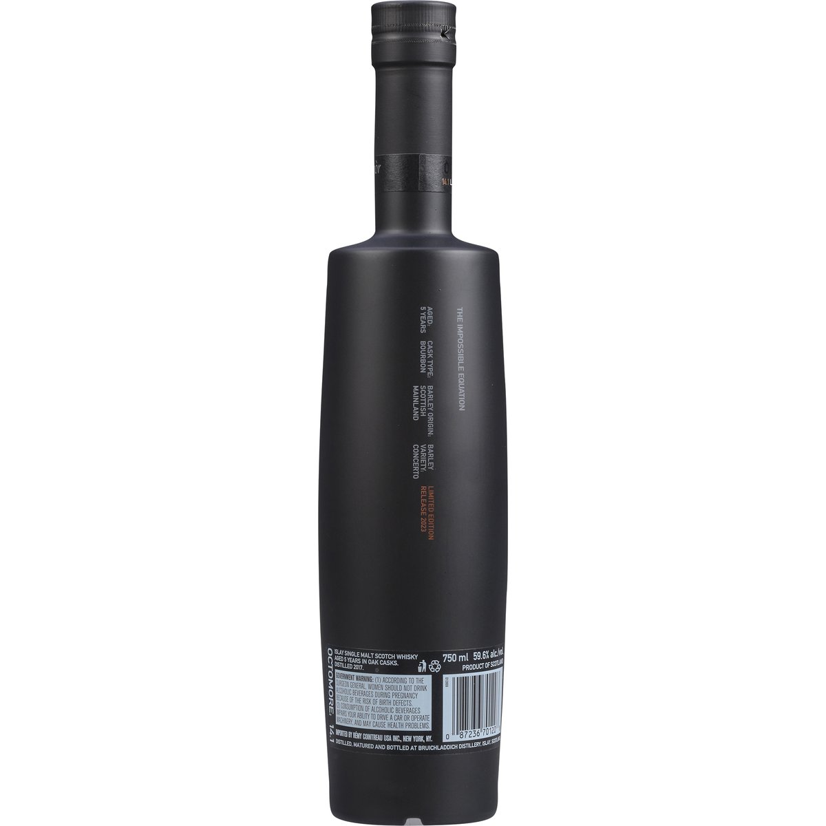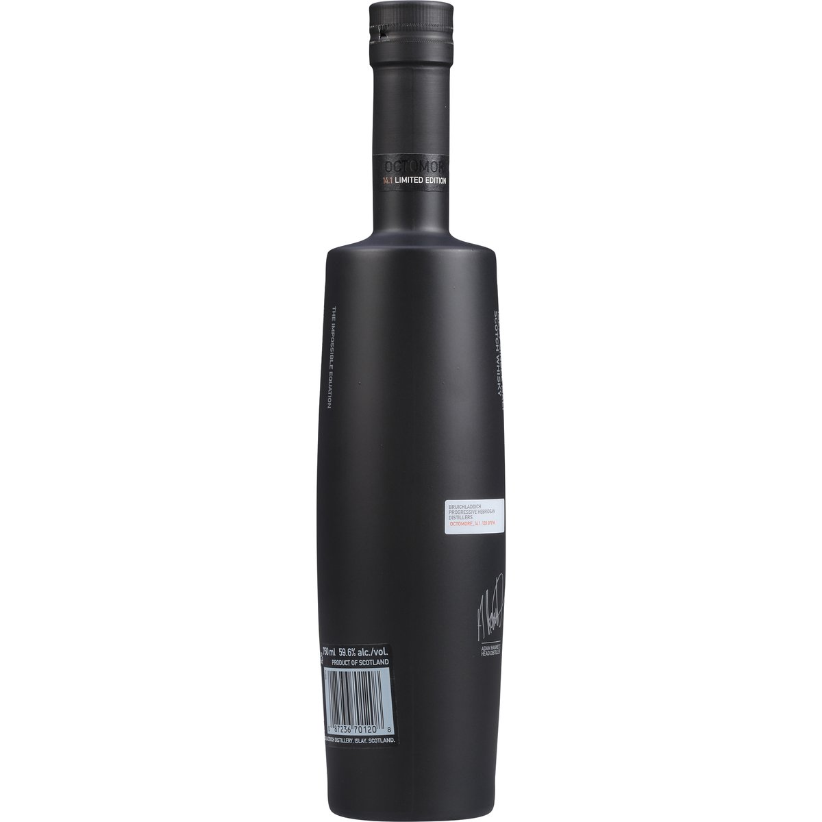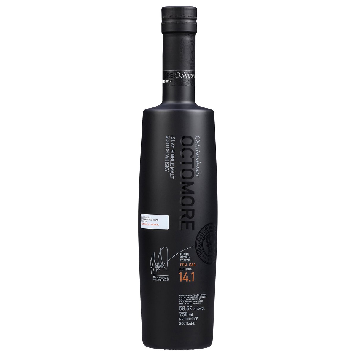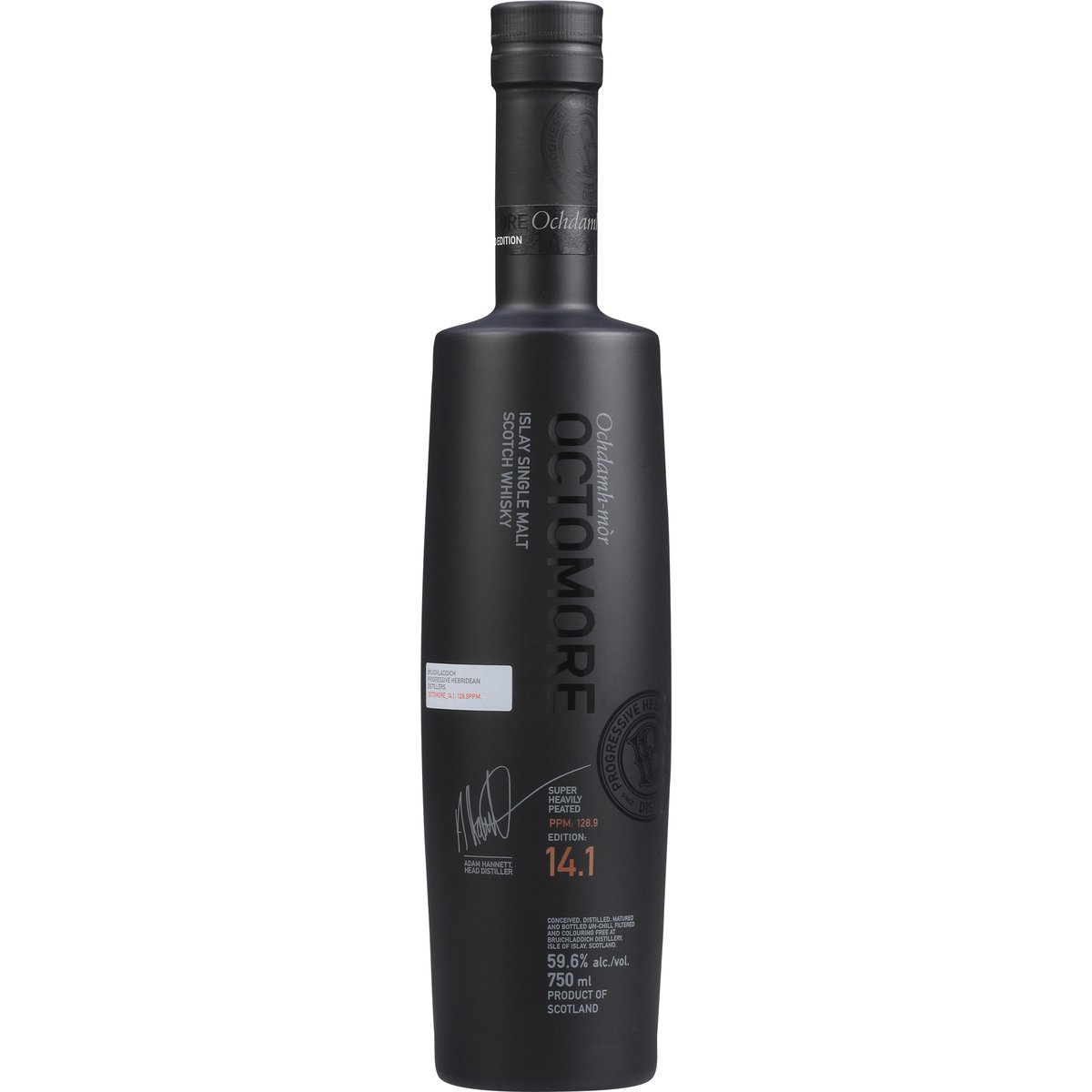 Limited Edition Release 2023 Progressive Hebridean distillers. Since 1881. Super heavily peated. PPM: 128.9. Edition: 14.1. Adam Hannett, head distiller. The impossible equation. Aged: 5 years. Cask Type: Bourbon. Barley Origin: Scottish Mainland. Barley Variety: Concerto. Aged 5 years in oak casks. Distilled in 2017. Disposed of properly. 59.6% alc./vol. 119.2 Conceived, Distilled, Matured and Bottled un-chill filtered and colouring free at Bruichladdich Distillery, Isle of Islay. Scotland. Product of Scotland. Distilled, Matured and Bottled at Bruichladdich Distillery, Islay, Scotland.