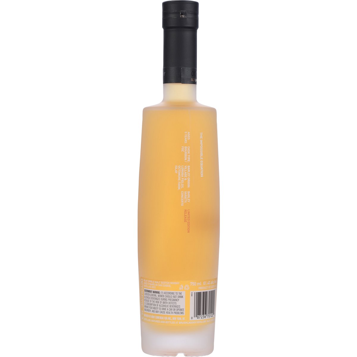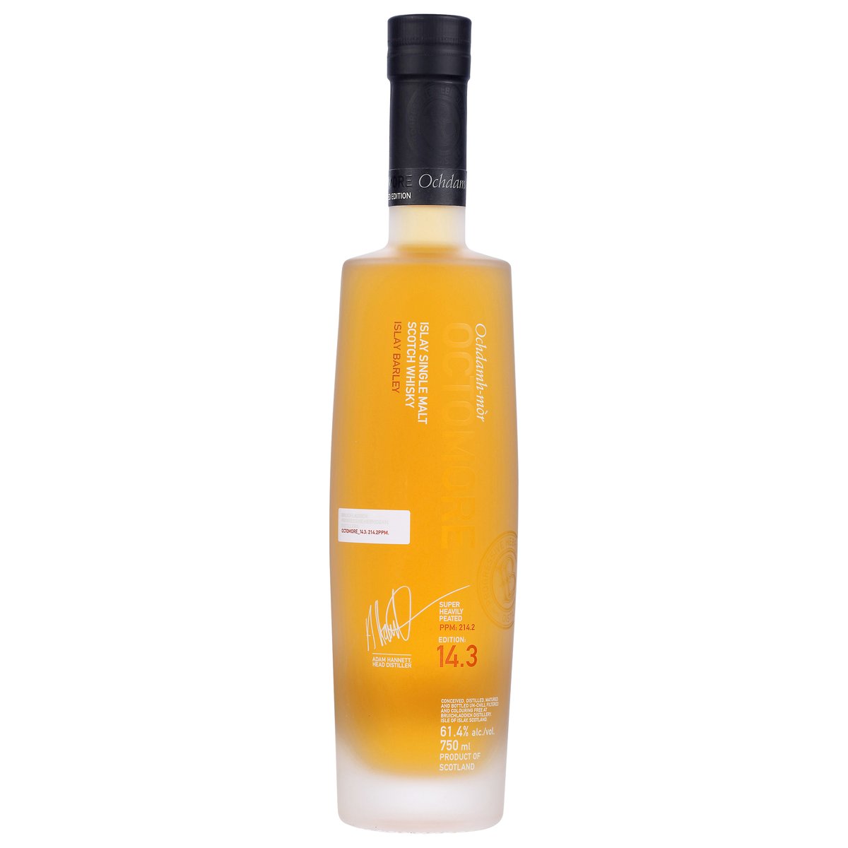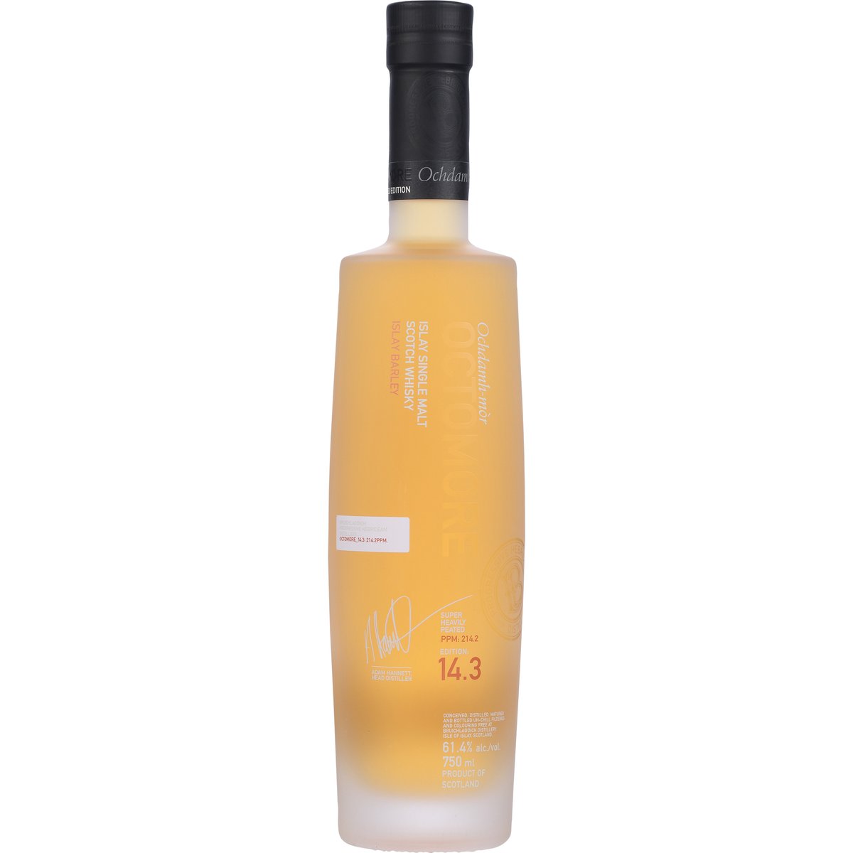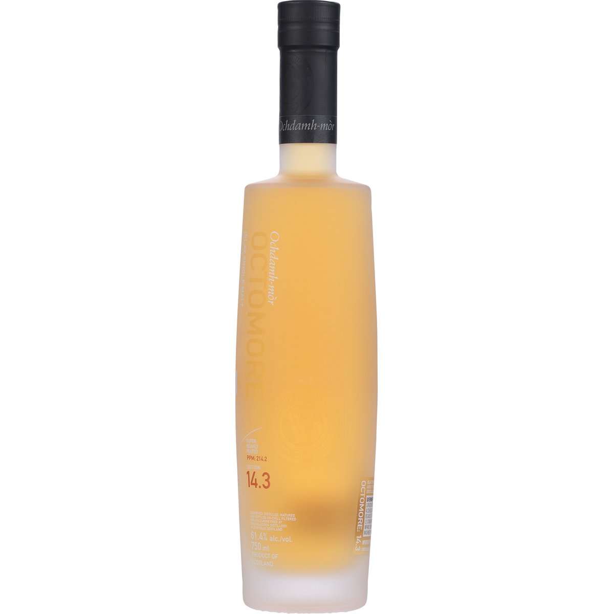 Limited Edition Super heavily peated. PPM: 214.2. Edition: 14.3. Adam Hannett, Head Distiller. The impossible equation. Aged: 5 years. Cask Type: Bourbo/FOC. Barley Origin: Village & Lorgba Fields, Octomore Farm, Islay. Barley Variety: Concerto. Limited Edition Release 2023. Aged 5 years in oak casks. Distilled 2017. Octomore: 14.3. Disposed of properly. 61.4% alc./vol. 122.8 Conceived, distilled, matured and bottled un-chill filtered and colouring free at Bruichladdich Distillery, Isle of Islay. Scotland. Product of Scotland. Conceived, distilled, matured and bottled at Bruichladdich Distillery, Islay, Scotland.
