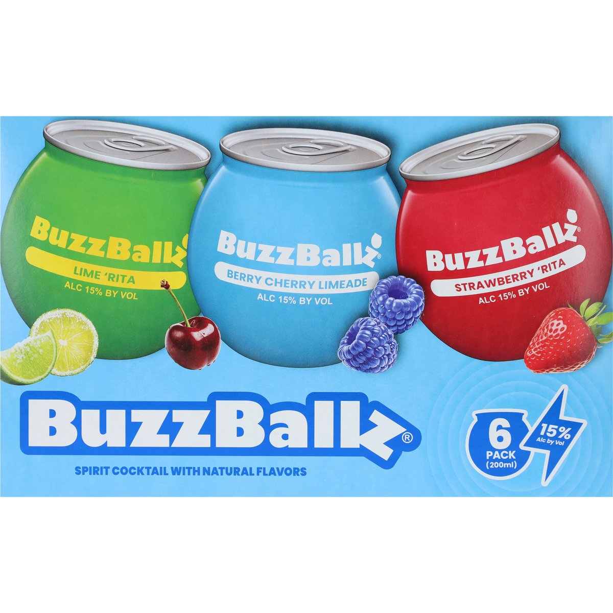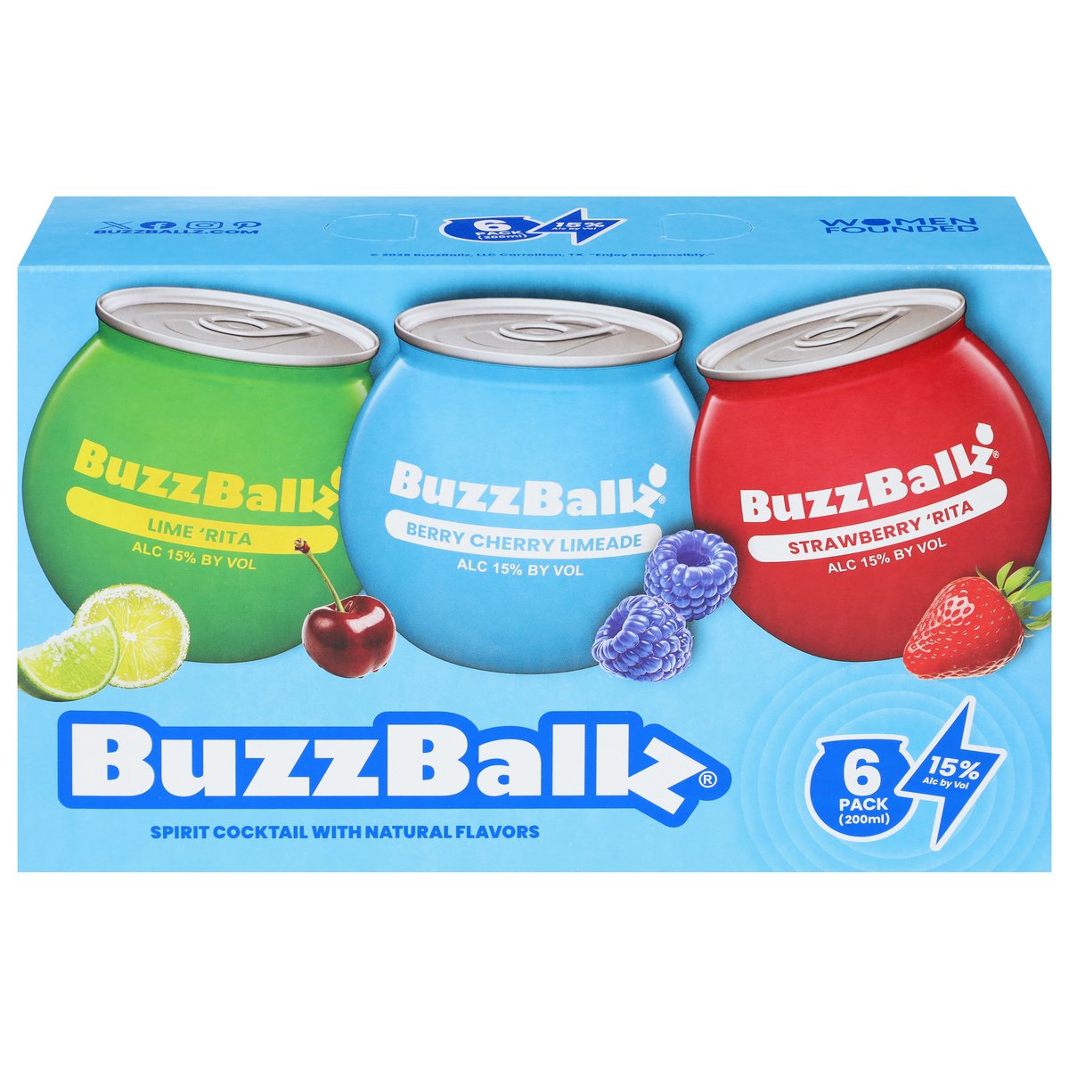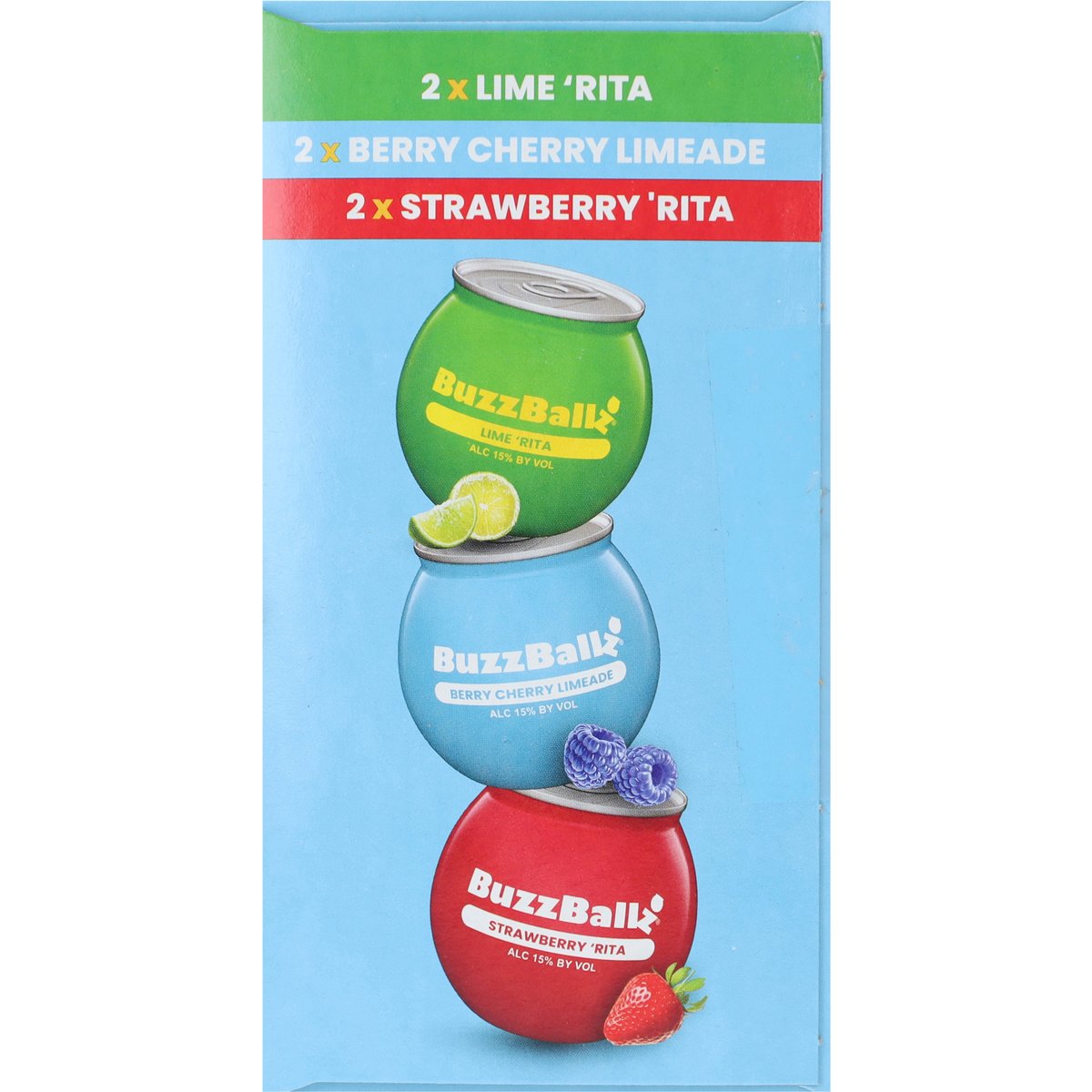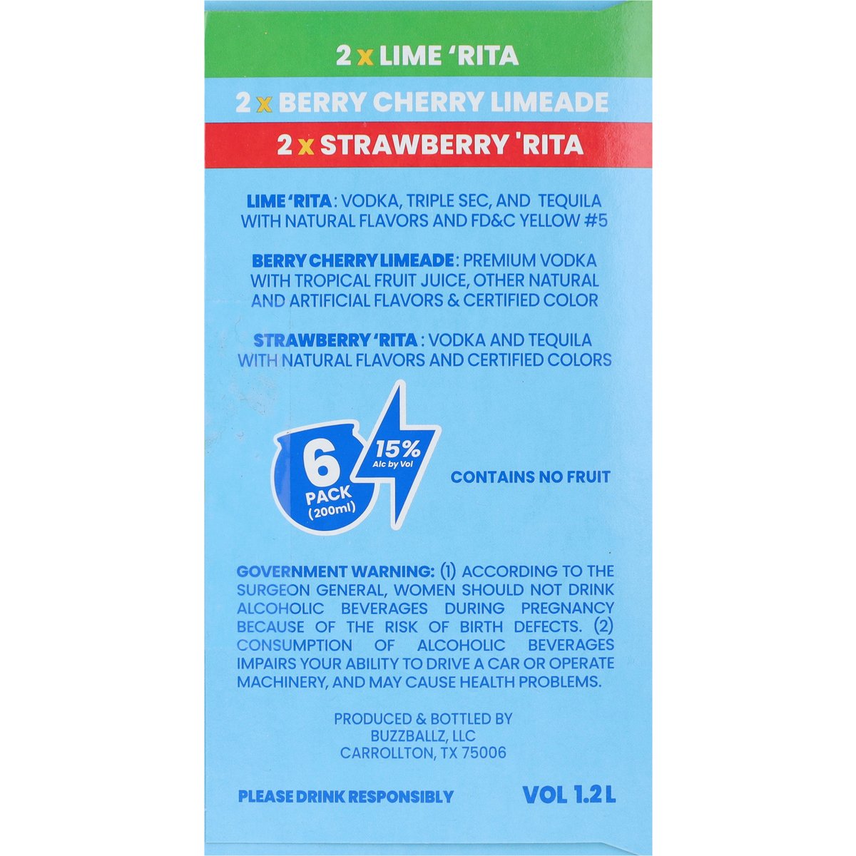 2 x lime rita. 2 x berry cherry limeade. 2 x strawberry rita. Spirit cocktail with natural flavors. Enjoy responsibly. Contains no fruit. Please drink responsibly. buzzballz.com. X. Faceebook. Instagram. Pinterest. Alc 15% by vol. 30