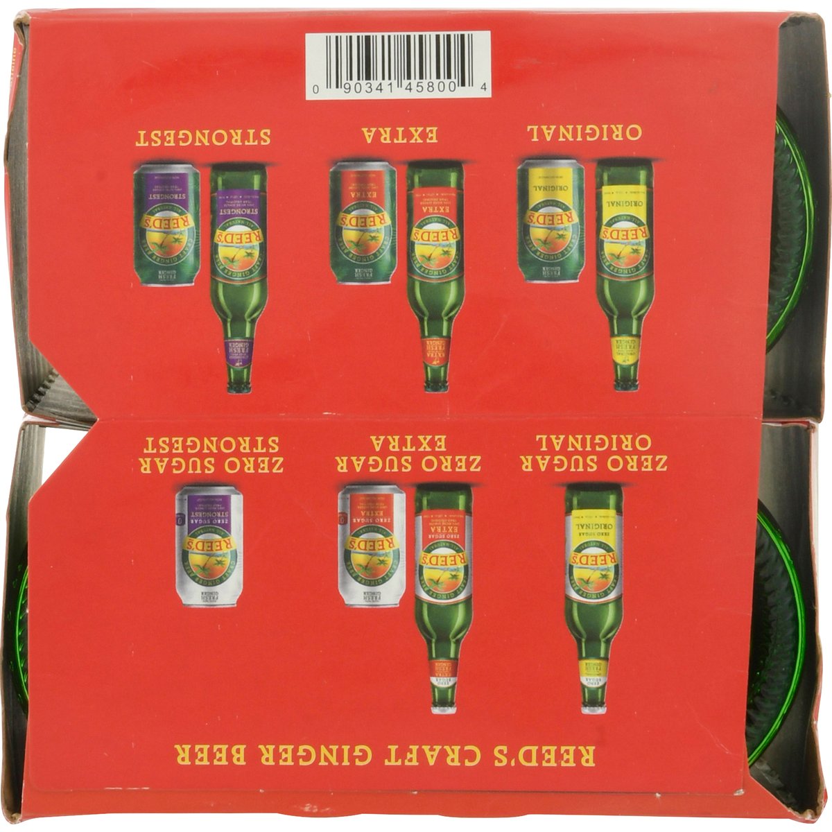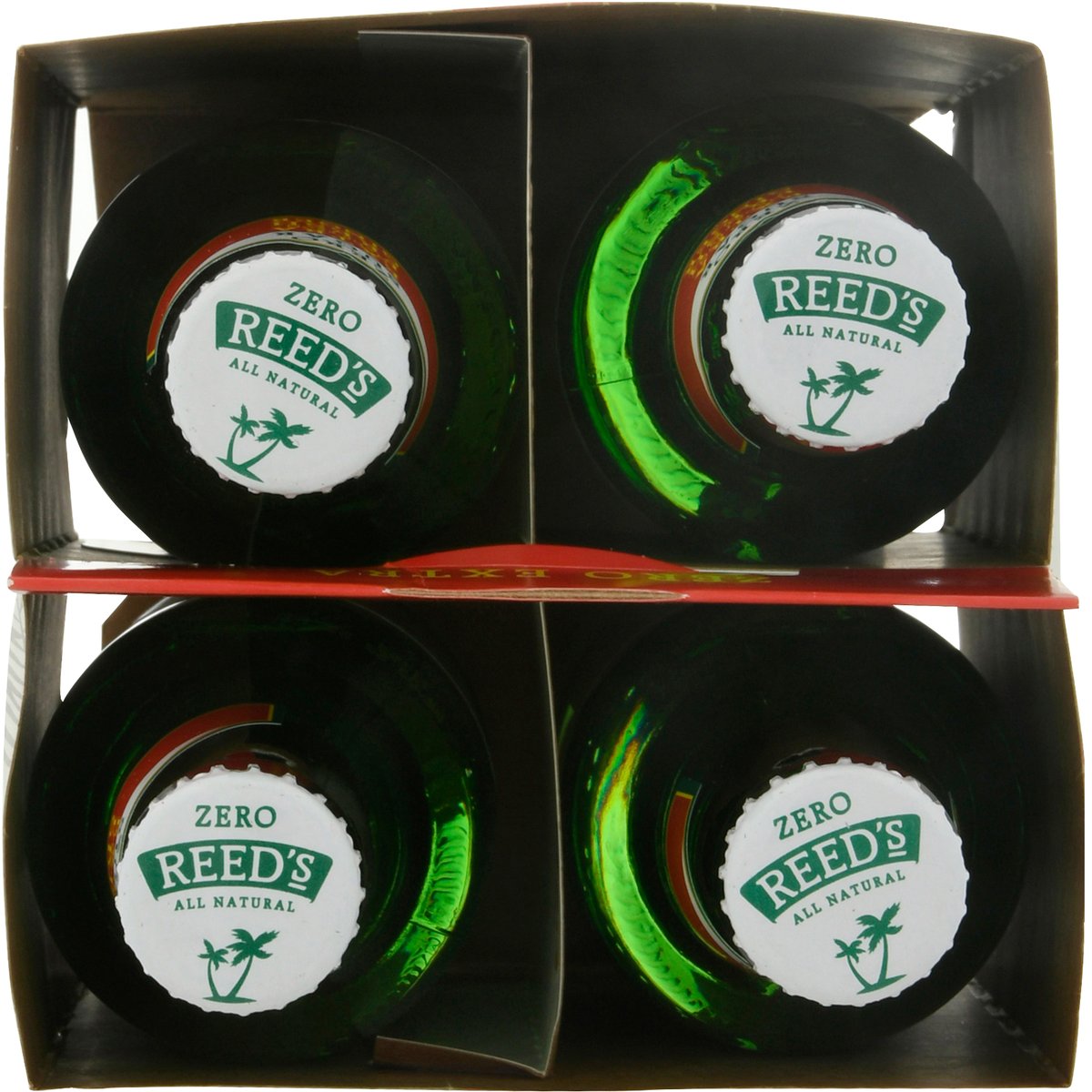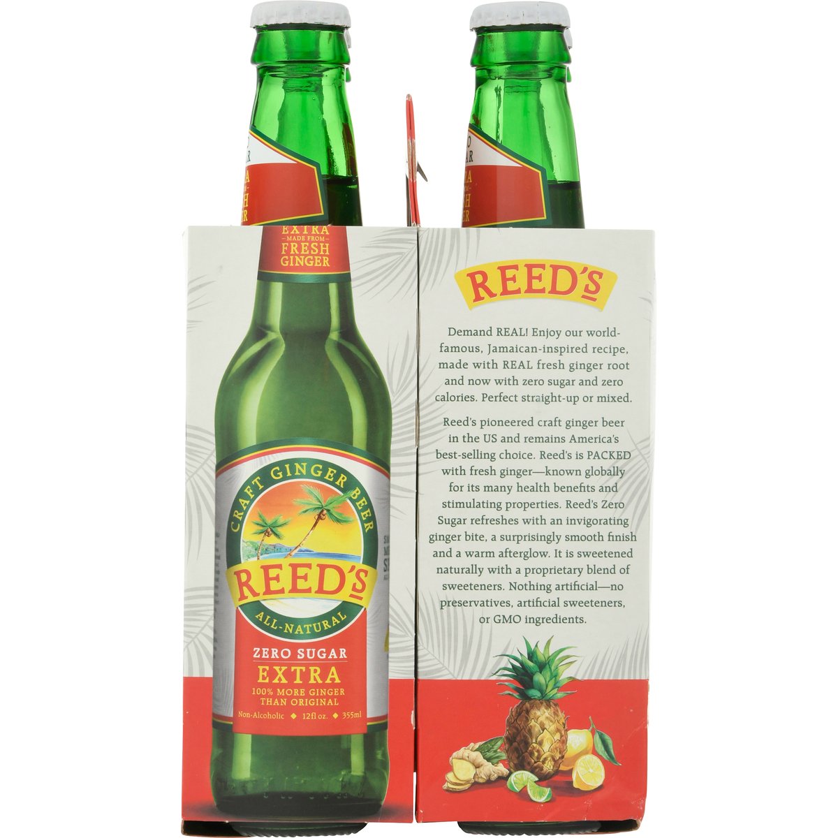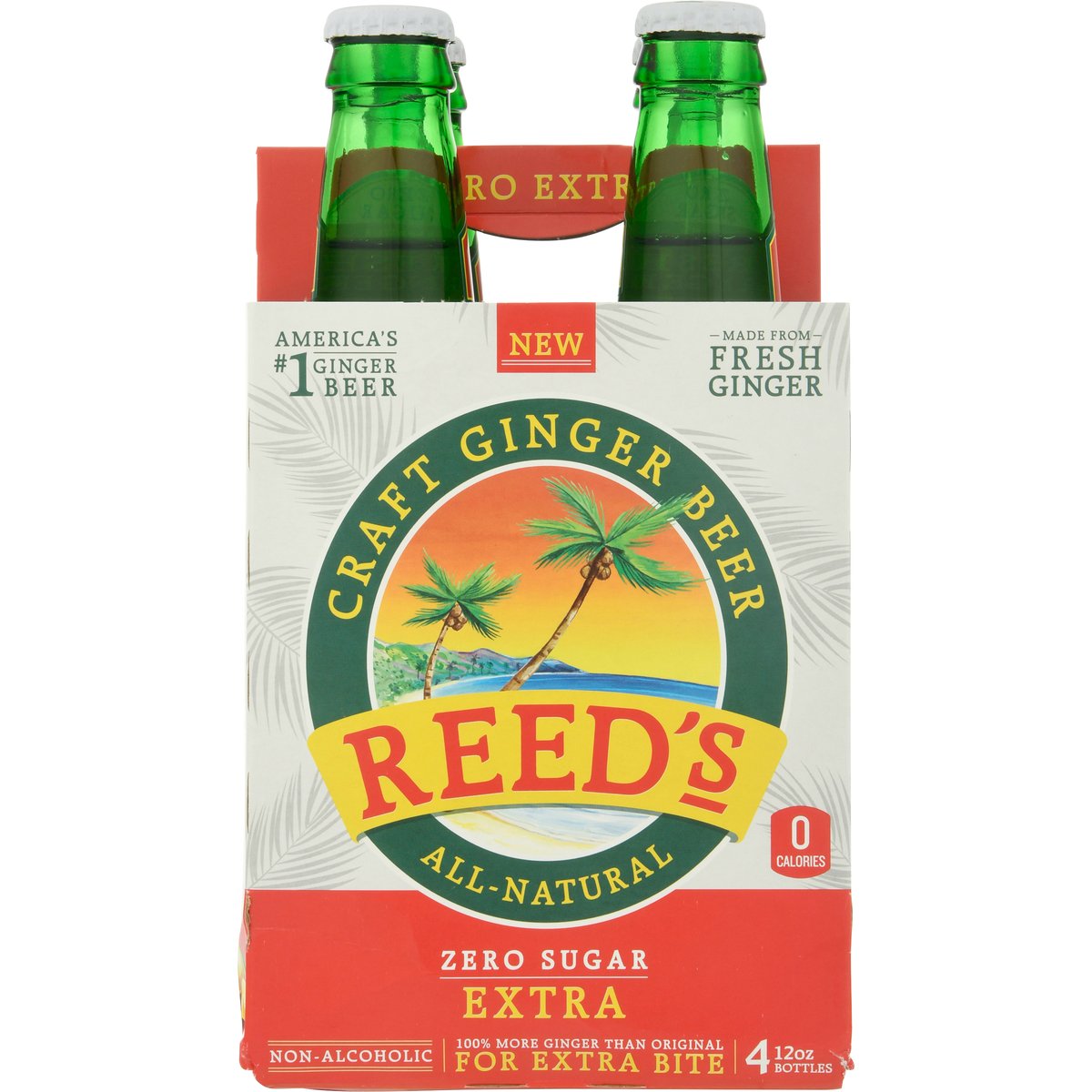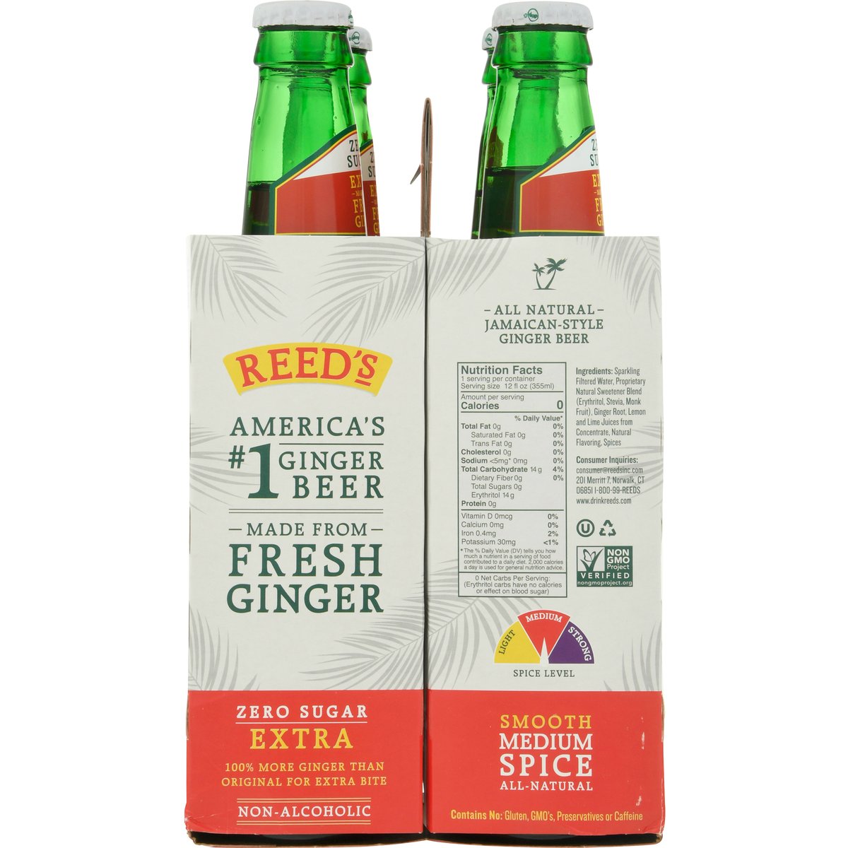 Craft Ginger Beer 0 calories. Contains No: gluten, GMO's; preservatives or caffeine. 0 Net Carbs Per Serving: (Eryhtritol carbs have no calories or effect on blood sugar). Non GMO Project verified. nongmoproject.org. America's no. 1 ginger beer. New. Craft ginger beer. Non-alcoholic. 100% more ginger than original for extra bite. All-natural Jamaican-style ginger beer. Spice level: Light, medium, strong. Smooth medium spice all-natural. Demand real! Enjoy our world-famous, Jamaican-inspired recipe, made with real fresh ginger root and now with zero sugar and zero calories. Perfect straight-up or mixed. Reed's pioneered craft ginger beer in the US and remains America's best-selling choice. Reed's is packed with fresh ginger - known globally for its many health benefits and stimulating properties. Reed's Zero Sugar refreshes with an invigorating ginger bite, a surprisingly smooth finish and a warm afterglow. It is sweetened naturally with a proprietary blend of sweeteners. Nothing artificial - no preservatives, artificial sweeteners, or GMO ingredients. www.drinkreeds.com. Consumer Inquiries: consumer(at)reedsinc.com, 201 Merritt 7, Norwalk, CT 06851. 1-800-99-Reeds. www.drinkreeds.com. Reed's Craft Ginger Beer: Zero sugar original. Zero sugar extra. Zero sugar strongest. Original. Extra. Strongest.