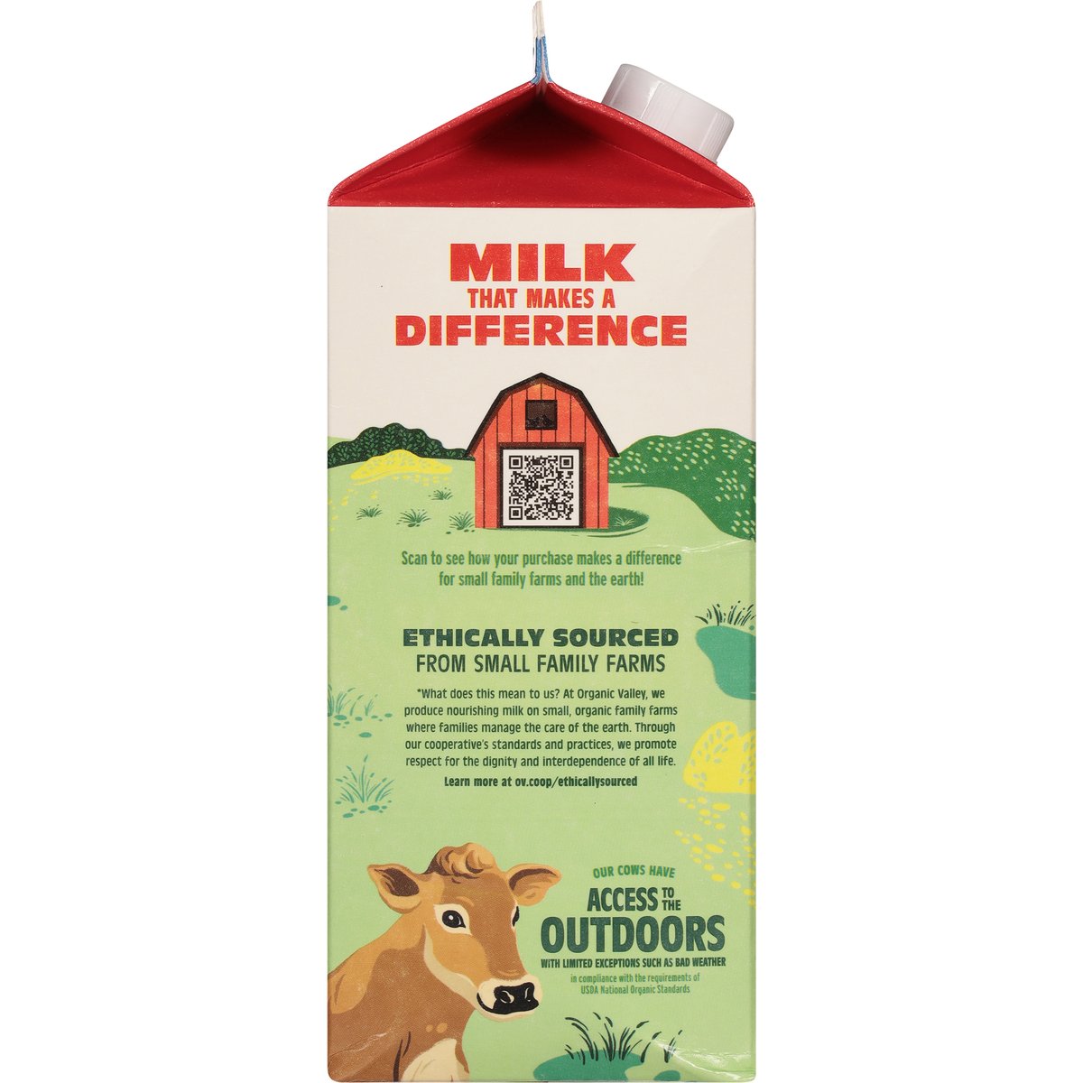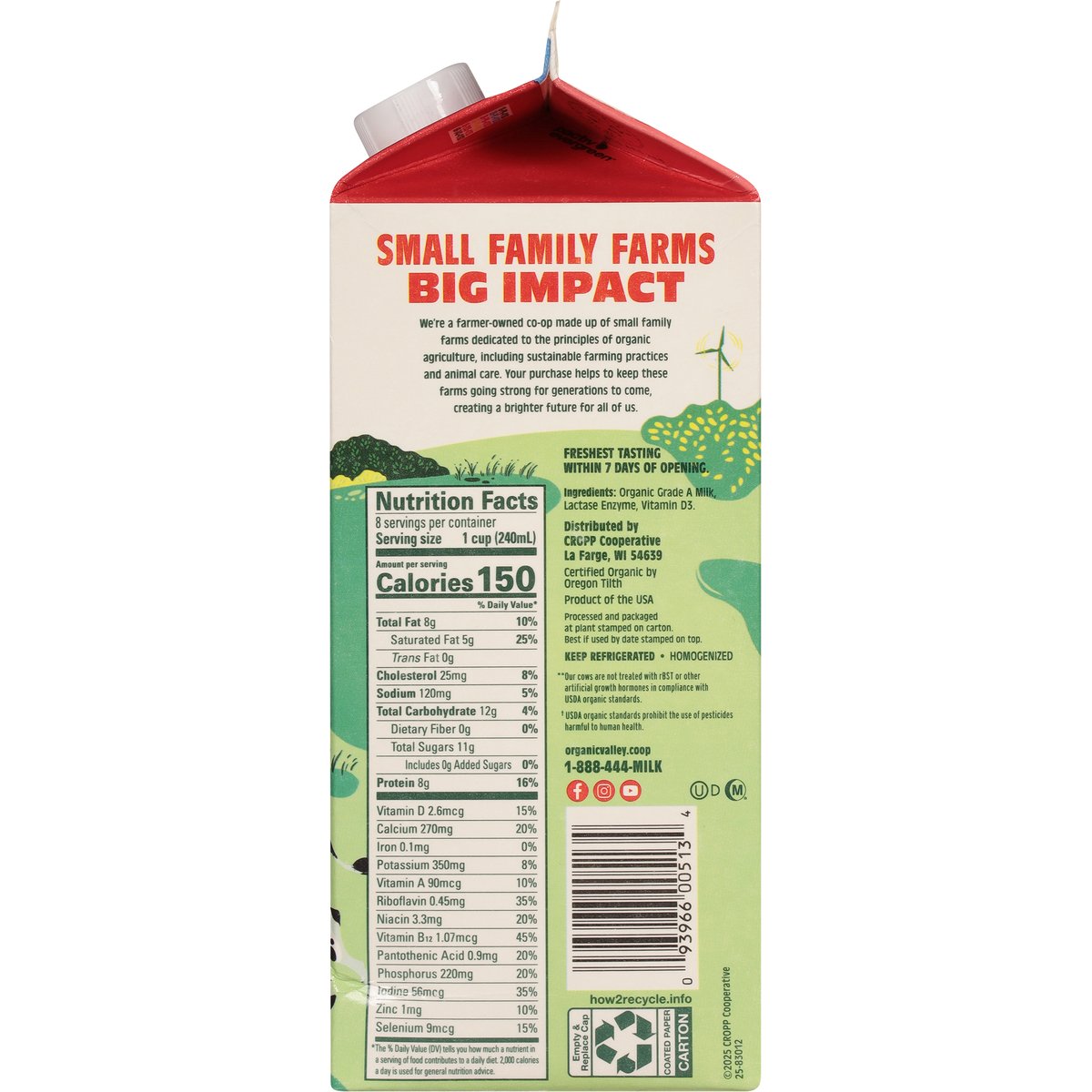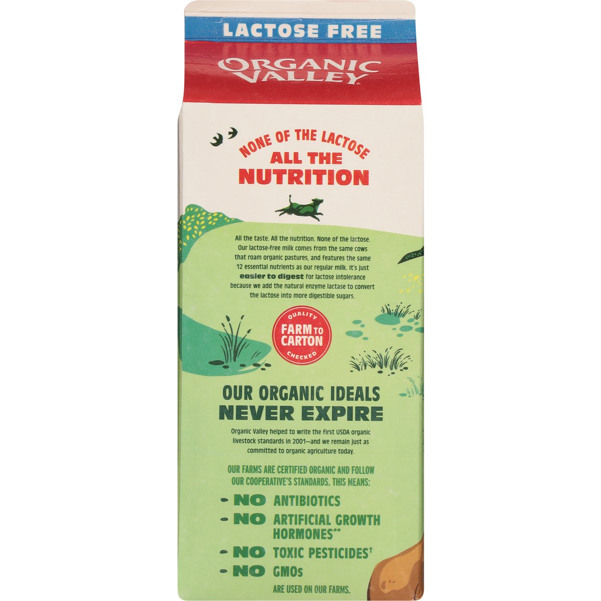 USDA Organic. Lactose free. Organic is always. Certified Organic by Oregon Tilth. Vitamin D. Non GMO. No synthetic hormones(Our cows are not treated with rBST in compliance with USDA organic standards. Plus, our cooperative's dairy animal care standards prohibit the use of synthetic hormones, even those allowed under USDA organic rules.). Easy to digest for lactose intolerance. Ultra pasteurized. None of the lactose all the nutrition. All the taste. All the nutrition. None of the lactose. Our lactose-free milk comes from the same cows that roam organic pastures, and features the same 13 essential nutrients as our regular milk. It's just easier to digest for lactose intolerance because we add the natural enzyme lactase to convert the lactose into more digestible sugars. Quality 57 checks. Our organic ideals never expire. Organic Valley helped to write the first USDA organic livestock standards in 2001-and we remain just as committed to organic agriculture today. Our farms are certified organic and follow our cooperative's standards. This means: No antibiotics; No toxic pesticides (USDA organic standards prohibit the use of pesticides harmful to human health.). Are used on our farms. Milk that makes a difference. Our cows spend more time outside than 95% of cows in the U.S. Comparison to co-op data and NAHMS 2007 dairy studies. Small family farms big impact. We're a farmer-owned co-op made up of small family farms dedicated to the principles of organic agriculture, including sustainable farming practices and ethical animal care. Your purchase helps to keep these farms going strong for generations to come, creating a brighter future for all of us. Processed and packaged at plant stamped on carton. Homogenized. organicvalley.coop. how2recycle.info. Facebook. Twitter. Instagram. Youtube. TikTok. Scan to see how your purchase makes a difference for small family farms and the earth! Ethically sourced from small family farms (What does this mean to us? At Organic Valley, we produce nourishing milk on small, organic family farms where families manage the care of the animals and the earth. Through our cooperative's standards and practices, we promote respect for the dignity and interdependence of human, animal, plant, soil, and global life. Learn more at ov.coop/ethicallysourced.). Farmer owned. Product of the USA.