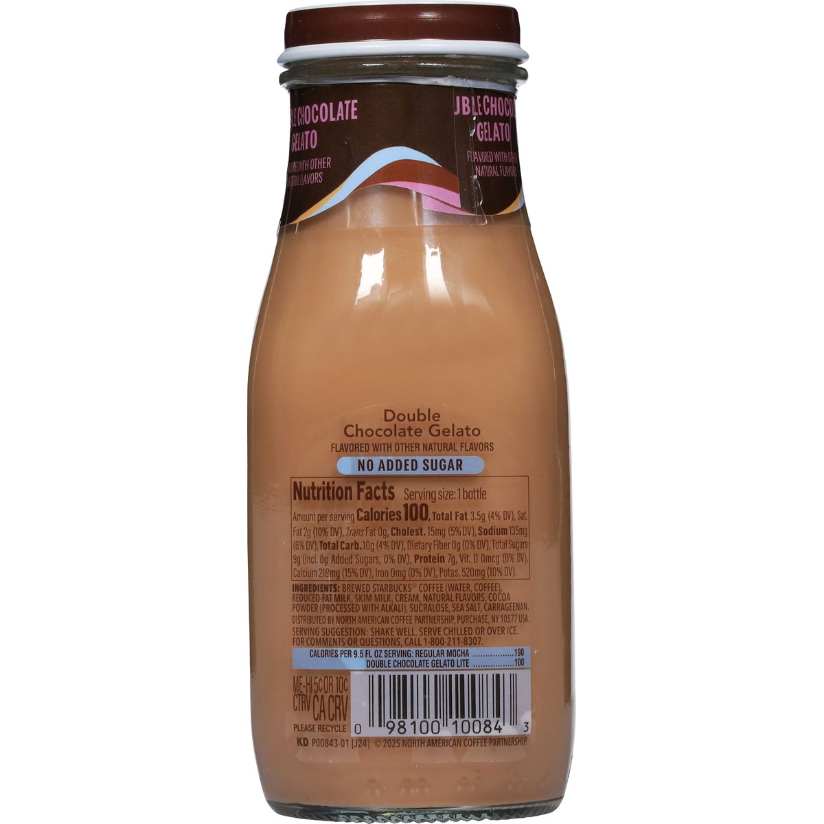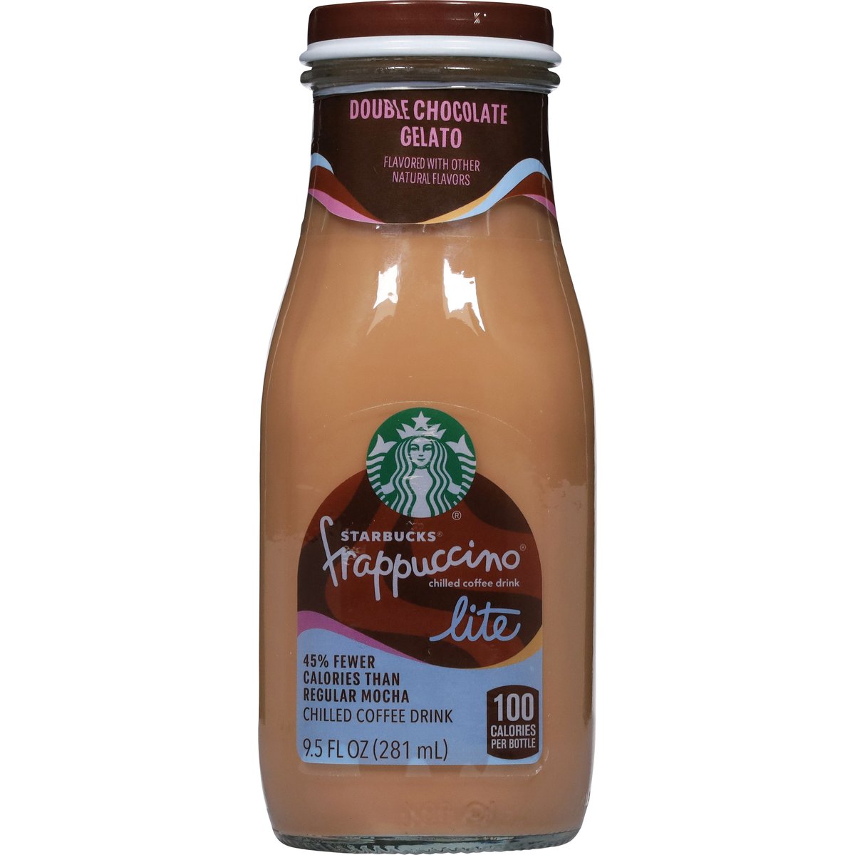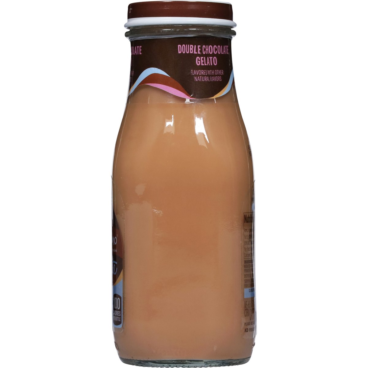 Flavored with other natural flavors. 100 calories per bottle. Calories per 9.5 Fl Oz Serving: Regular mocha - 190; Double chocolate gelato lite - 100. 45% fewer calories than regular mocha. No added sugar. For comments or questions, call 1-800-211-8307. Please recycle.