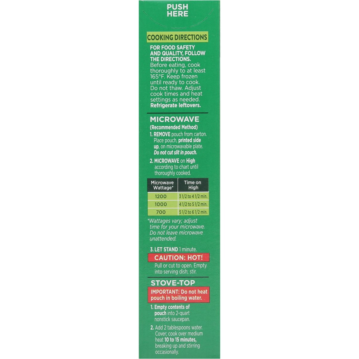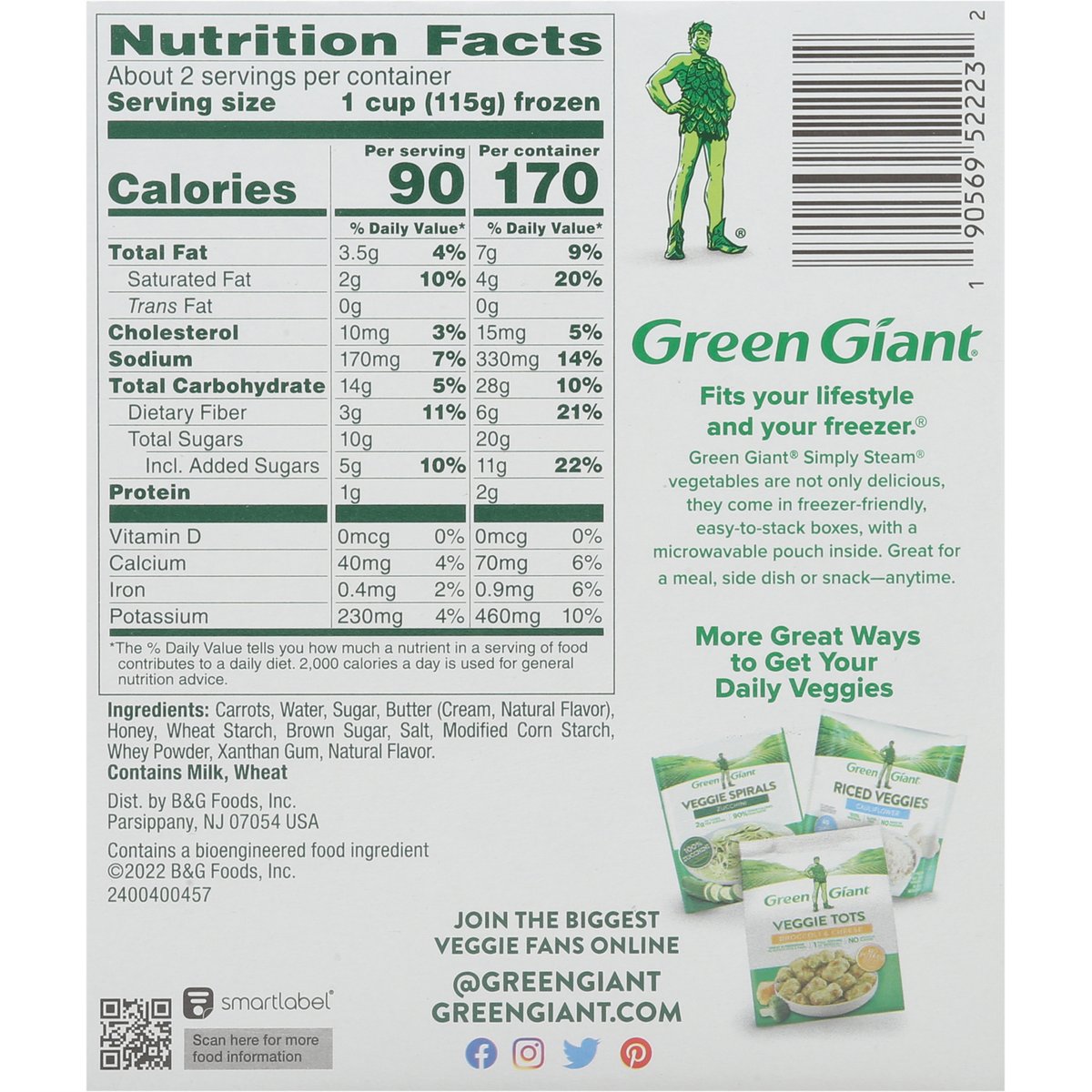 No artificial flavors or preservatives. 90 calories per serving. Contains a bioengineered food ingredient. Simply steam. Microwave right in bag. Must cook thoroughly. See cook instructions. Fits your lifestyle and your freezer. Green Giant simply steam vegetables are not only delicious, they come in freezer-friendly, easy-to-stack boxes, with a microwavable pouch inside. Great for a meal, side dish or snack-anytime. Greengiant.com. SmartLabel: Scan for more food information. Join the biggest veggie fans online @greengiant. Facebook. Instagram. Twitter. Pinterest. Questions or comments? 1-800-754-3381. More great ways to get your daily veggies.