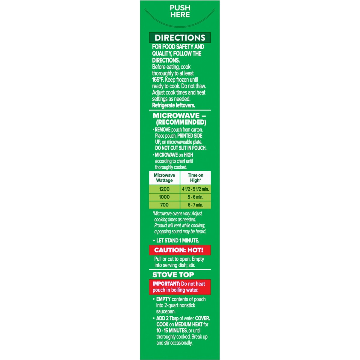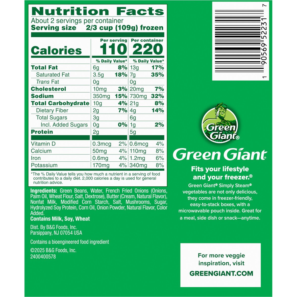 Contains a bioengineered food ingredient. New look. Same great taste. Steam in bag. Green Giant: Fits your lifestyle and your freezer. Green Giant Simply Steam vegetables are not only delicious, they come in freezer-friendly. easy-to-stack boxes, with a microwavable pouch inside. Great for a meal, side dish or snack-anytime. greengiant.com. Question or Comments? 1-800-754-3381. For more veggie inspiration, visit greengiant.com.