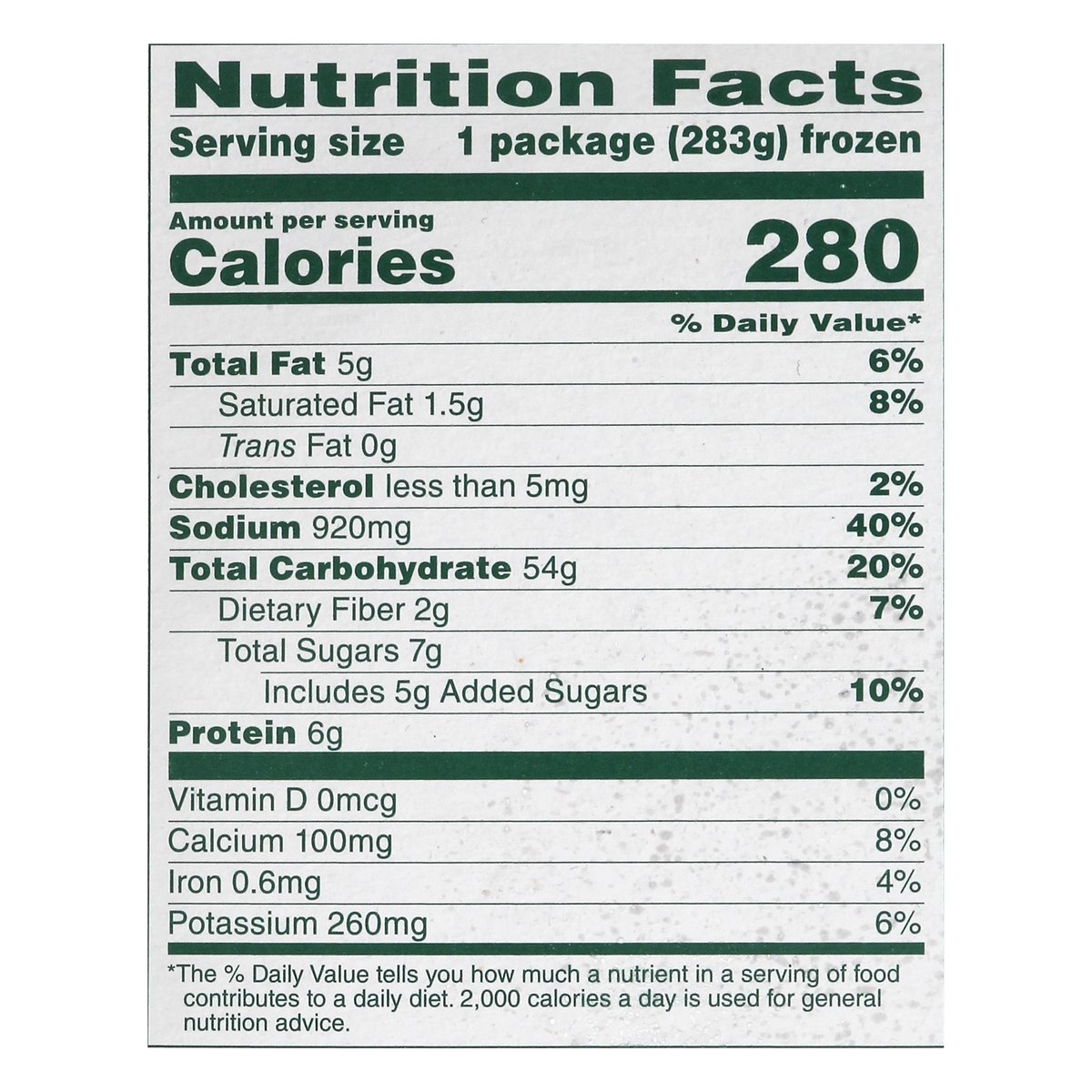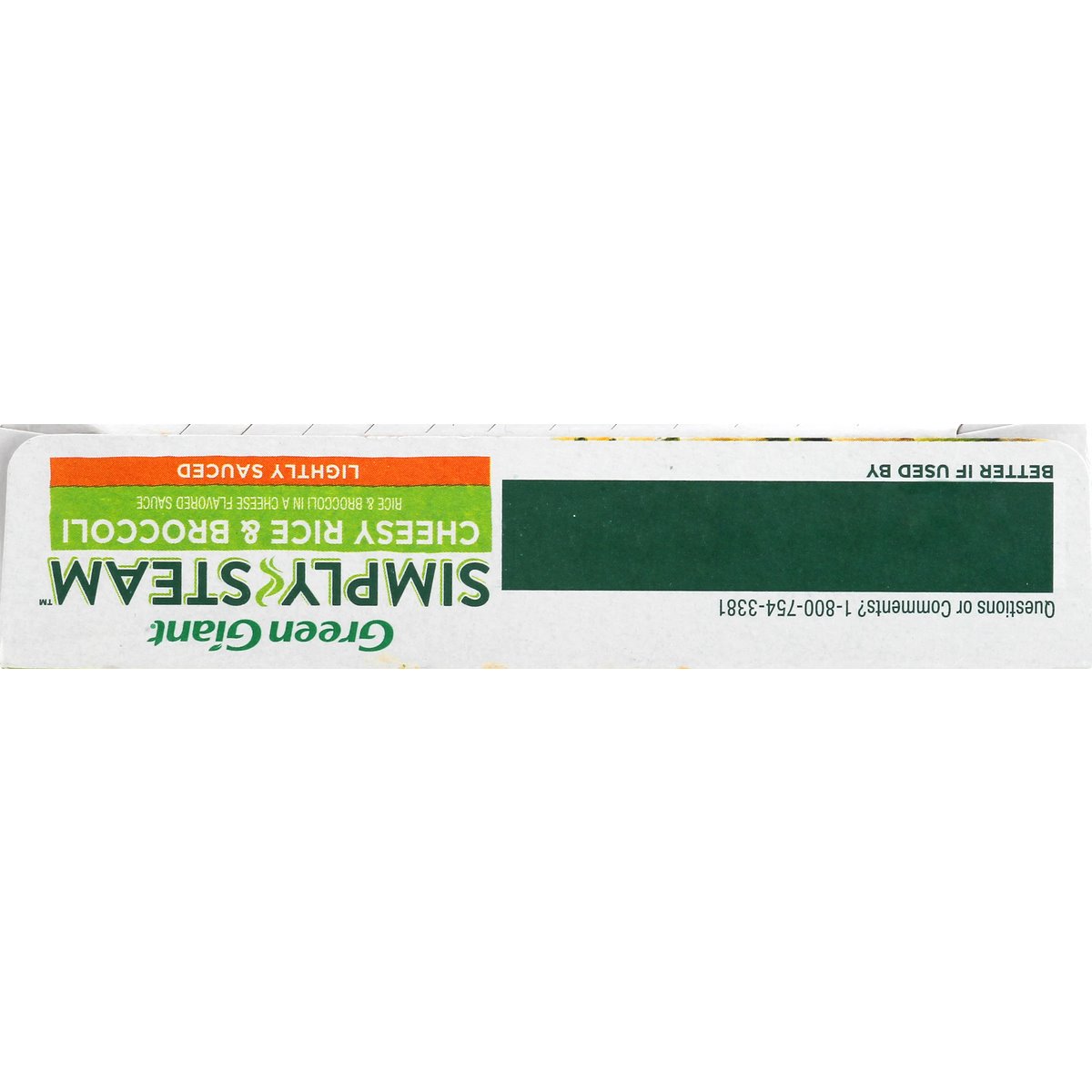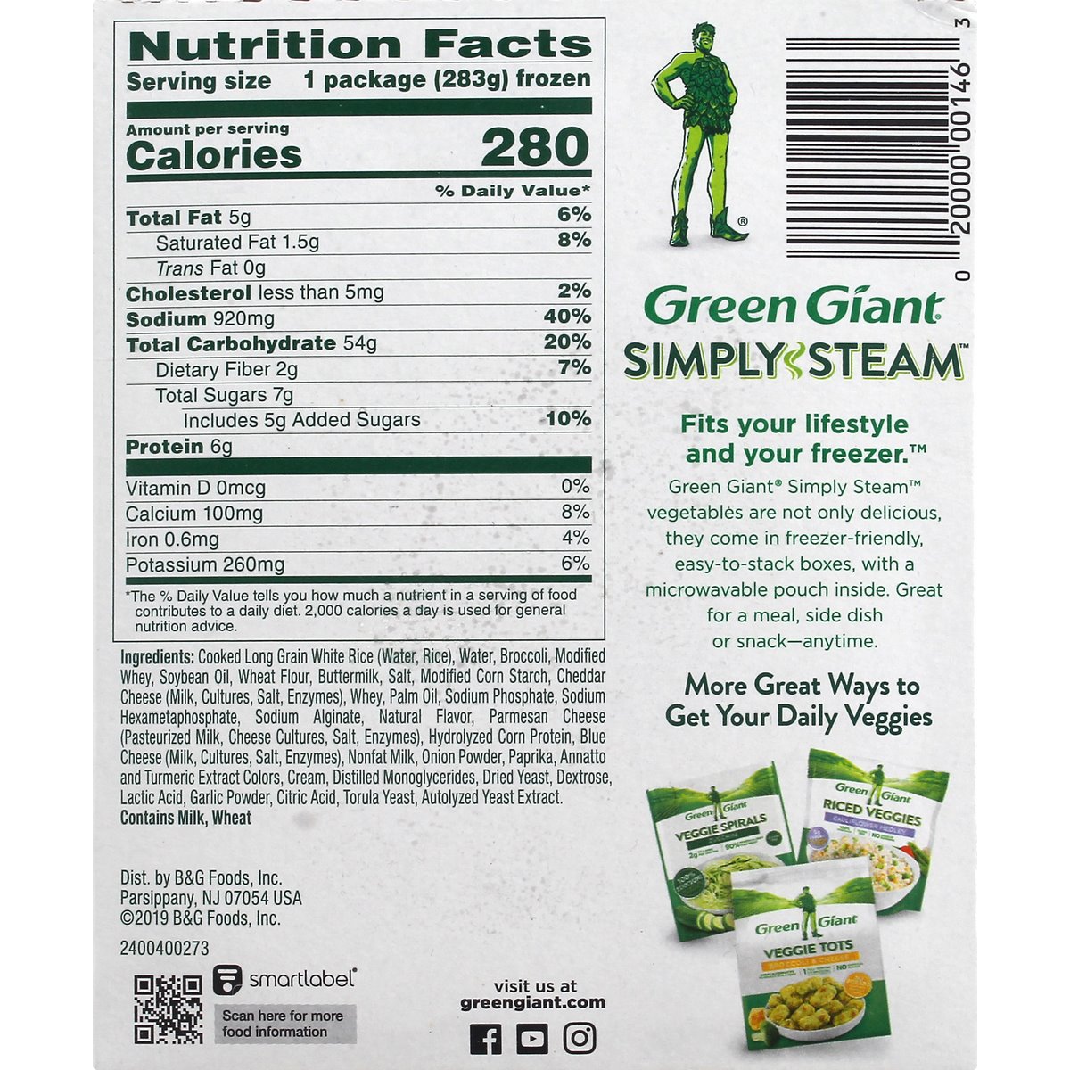 Rice & broccoli in a cheese flavored sauce. Per 1 Package: 270 calories; 1.5 g sat fat (7% DV); 960 mg sodium (40% DV); 4 g sugars. Questions or comments? 1-800-754-3381 Mon-Fri 7:30 aam-5:30 pm CT. See how we lock in freshness at: www.GreenGiant.com. 100% recycled paperboard. The abundant variety of Green Giant sauced vegetable blends will make sure you and your family enjoy the vegetables you need to live a balanced lifestyle. Carbohydrate Choices: 3-1/2. how2recycle.info.