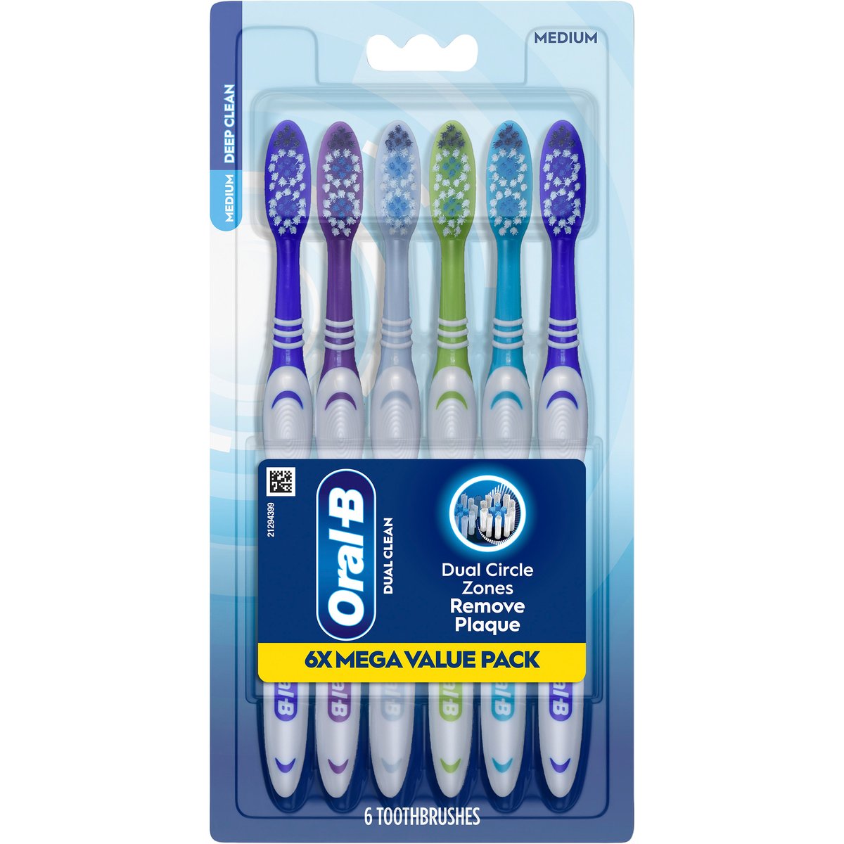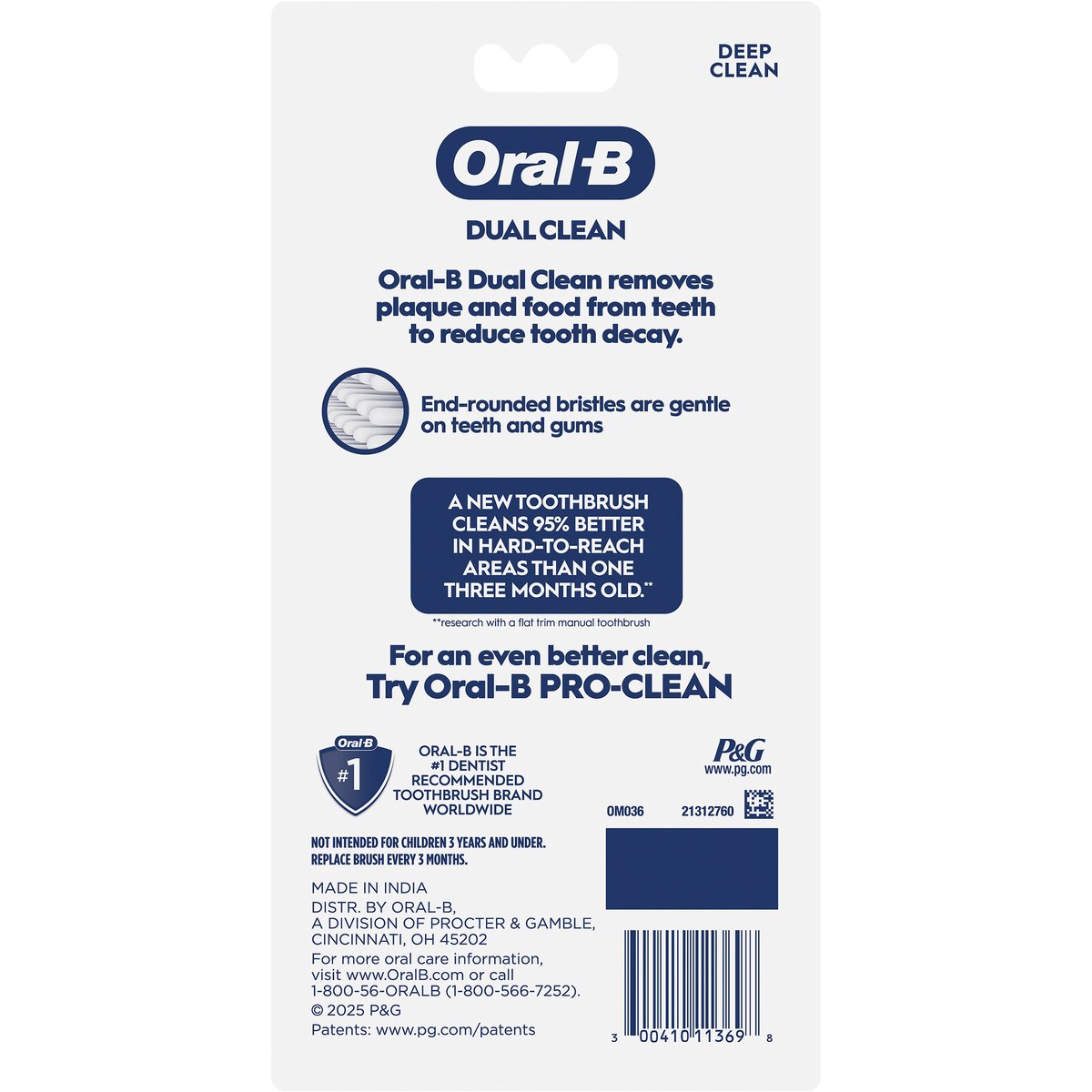 Medium. Deep clean. Dual circle zones. Remove plaque. Oral-B Dual Clean removes plaque and food from teeth to reduce tooth decay. End-rounded bristles are gentle on teeth and gums. A new toothbrush cleans 95% better in hard-to-reach areas than one three months old**. Oral-B is the #1 dentist recommended toothbrush brand worldwide. ** Research with a flat trim manual toothbrush. www.oralb.com. www.pg.com. For more oral care information, visit www.oralb.com or call 1-800-56-OralB (1-800-566-7252). For an even better clean, try Oral-B Pro-Clean. Made in India.