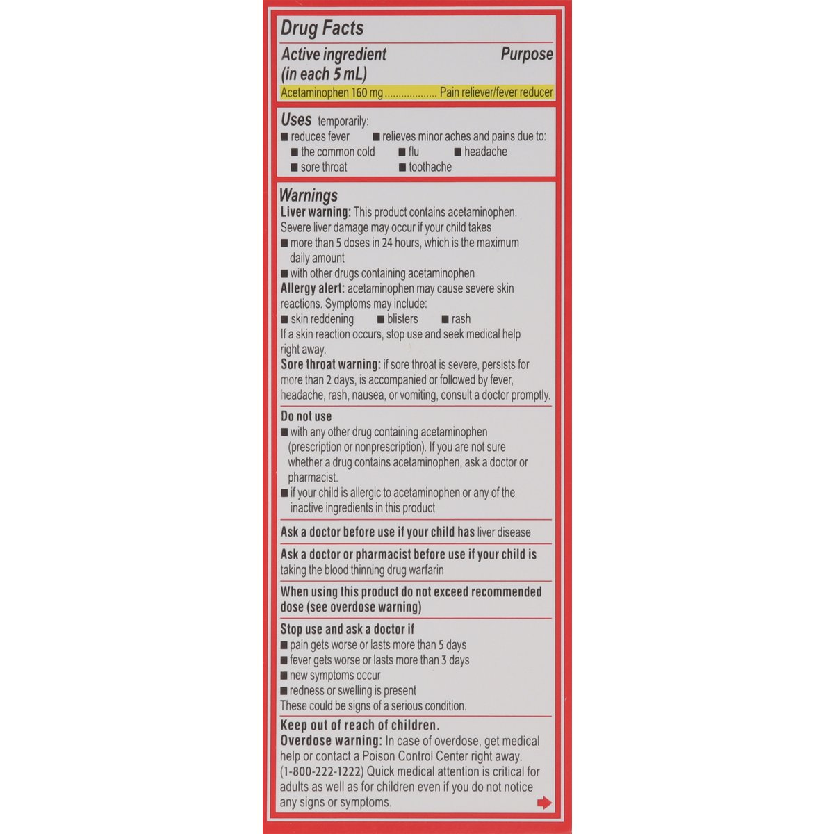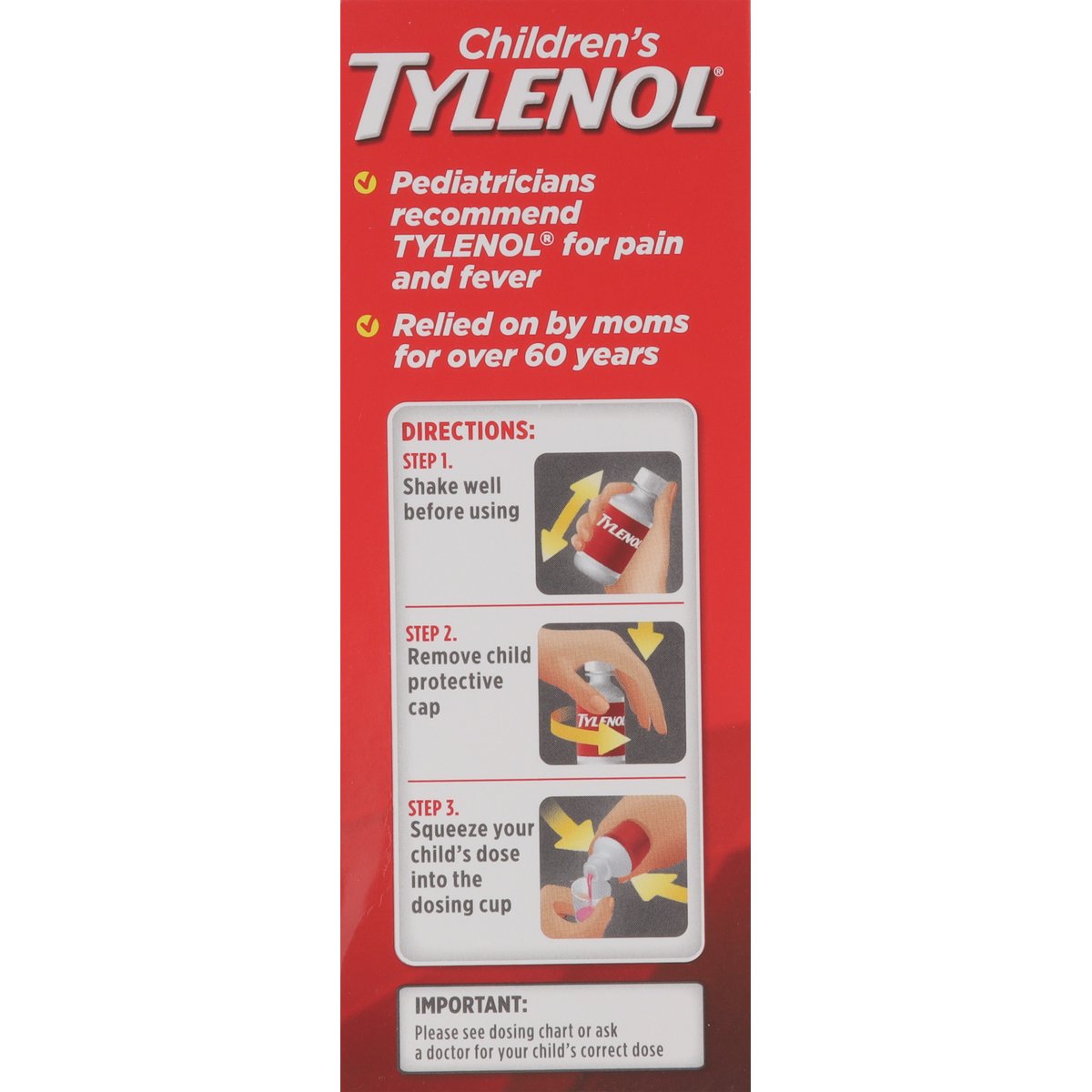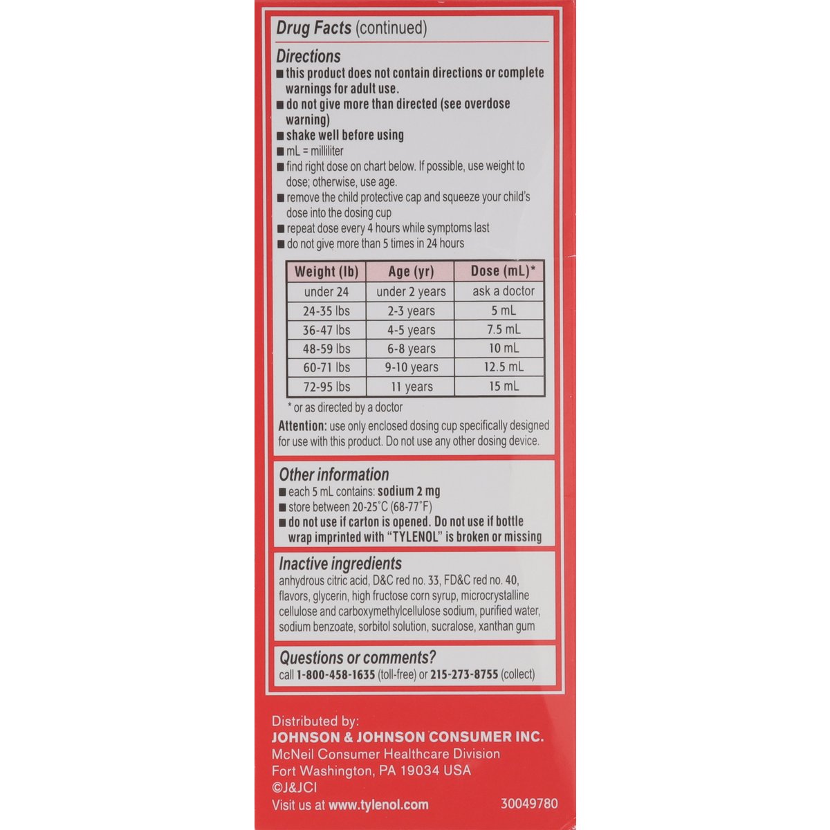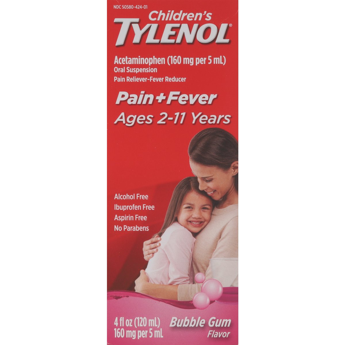 Ages 2-11 years. Acetaminophen (160 mg per 5 mL). Oral suspension. Pain reliever-fever reducer. Alcohol free. Ibuprofen free. Aspirin free. No parabens. Pediatricians recommend Tylenol for pain and fever. Relied on by moms for over 60 years. www.tylenol.com. Questions or comments? Call 1-800-458-1635 (toll-free) or 215-273-8755 (collect). Visit us at www.tylenol.com.