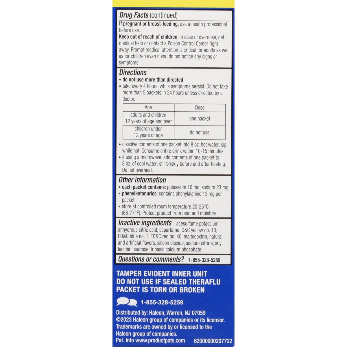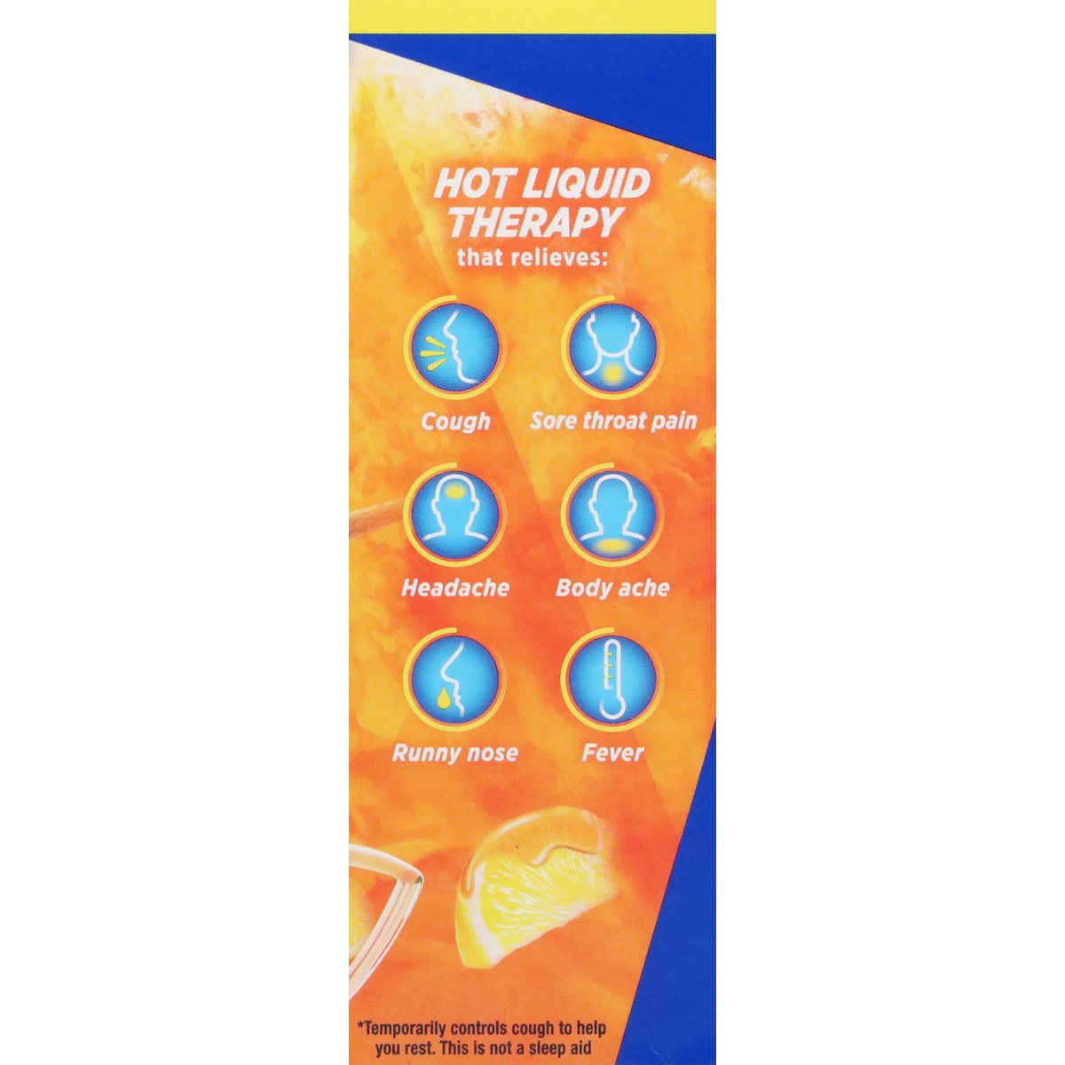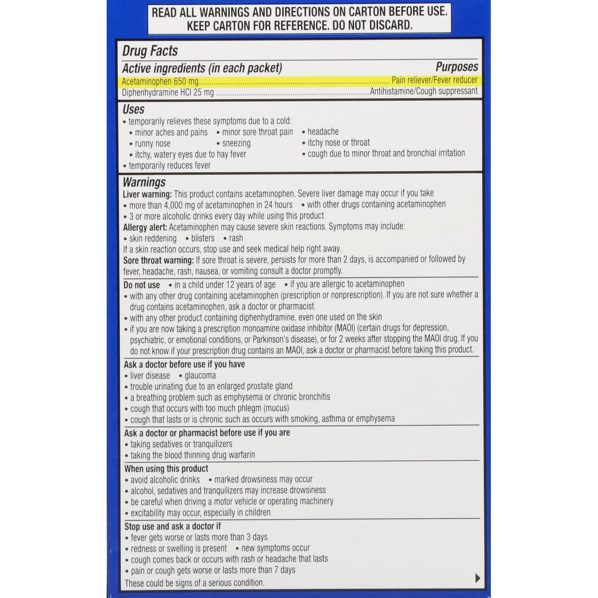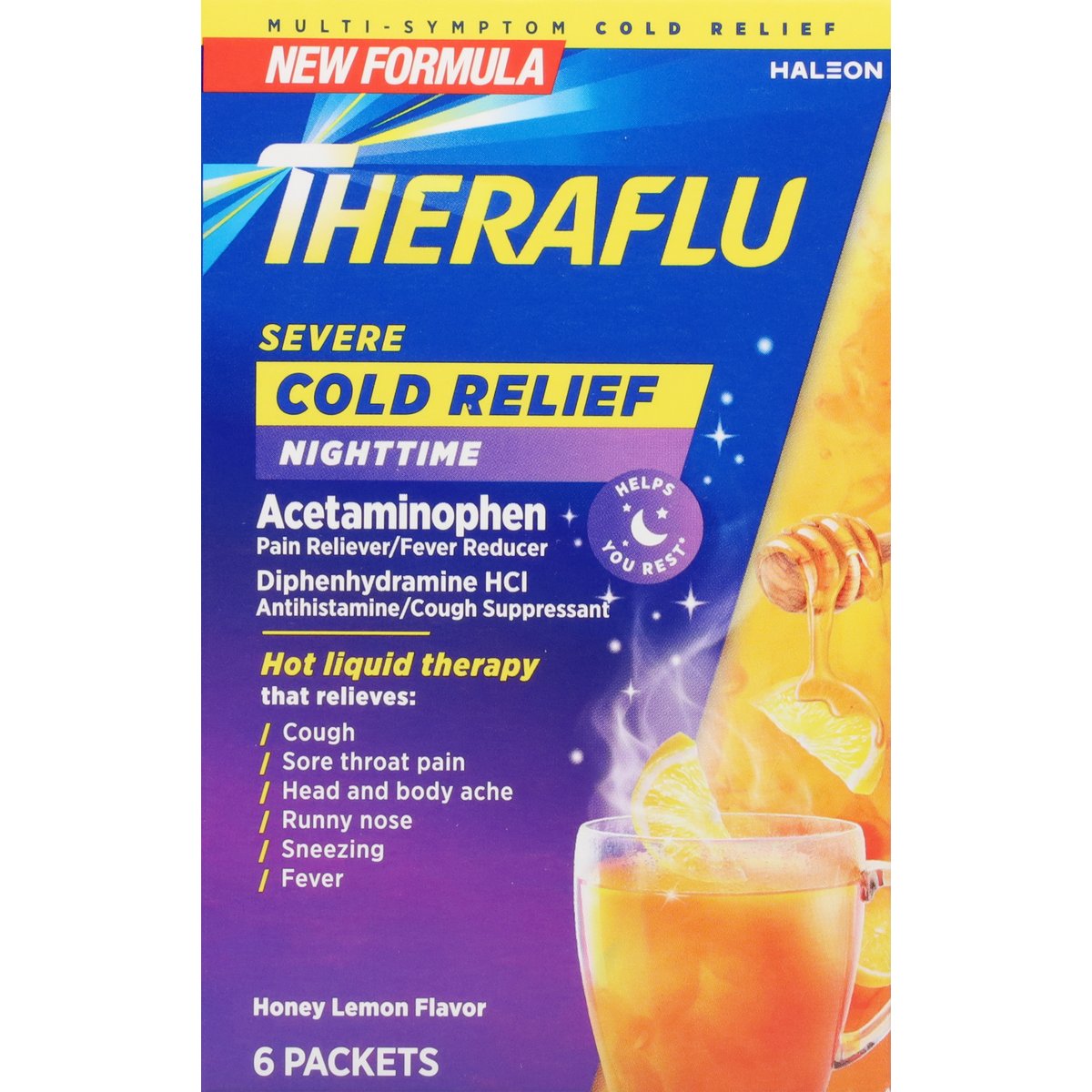 Acetaminophen Pain Reliever/Fever Reducer. Diphenhydramine HCI Antihistamine/Cough Suppressant. Multi-symptom cold relief. New formula. Hot liquid therapy that relieves: cough; sore throat pain; head and body ache; runny nose; sneezing; fever. Helps you rest (Temporarily controls cough to help you rest. This is not a sleep aid). Questions or comments? Call 1-855-328-5259.