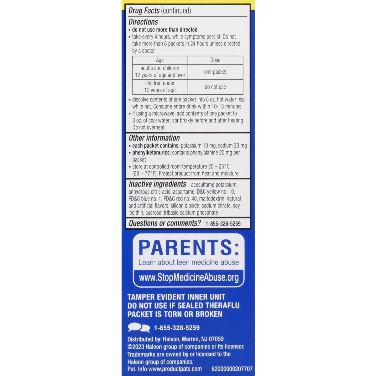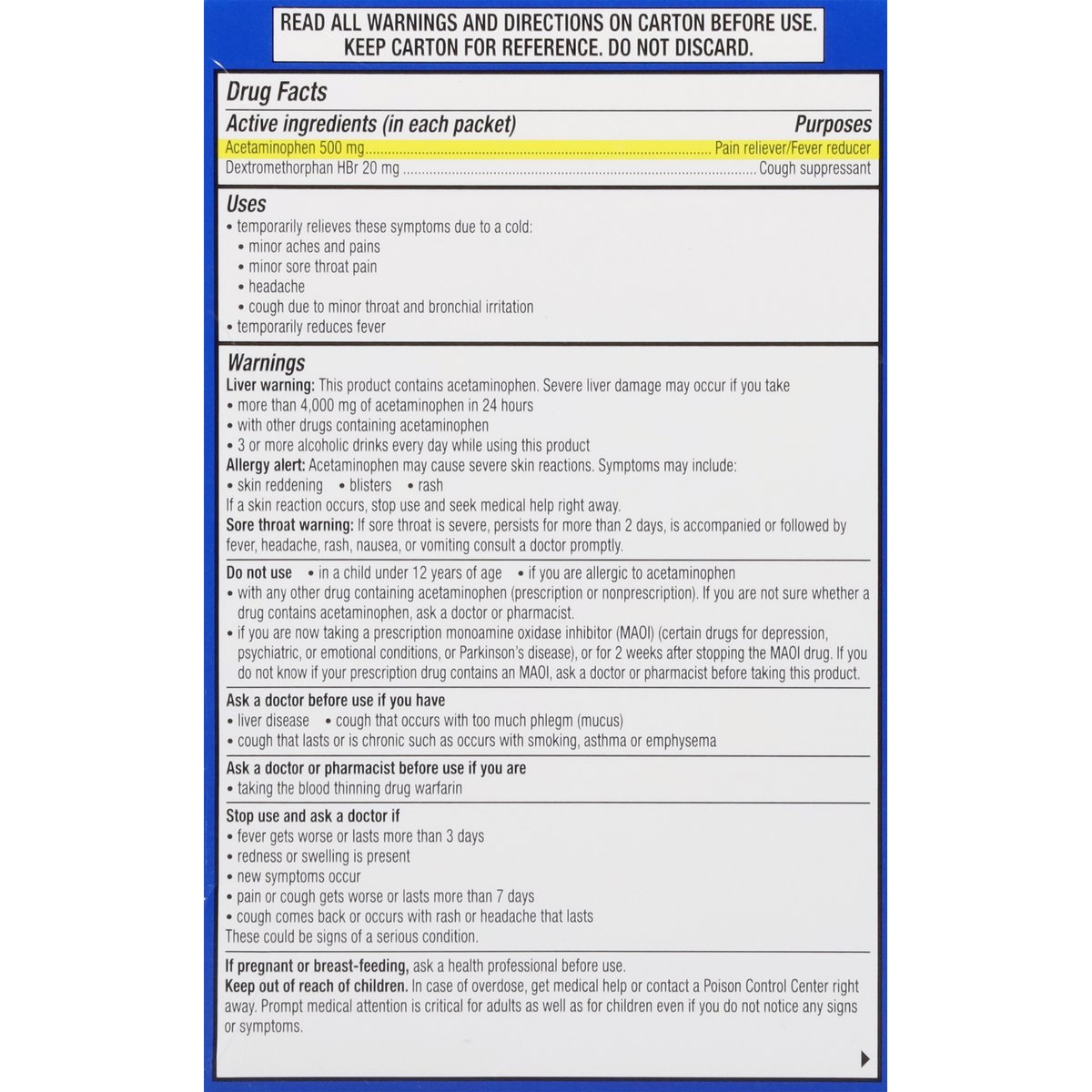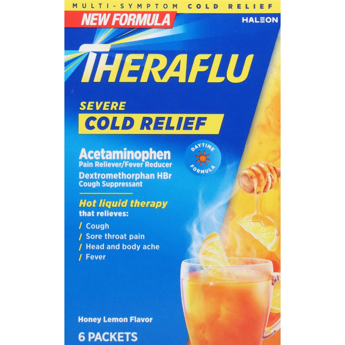 Acetaminophen pain reliever/Fever reducer. Dextromethorphan HBr Cough Suppressant. Multi-symptom cold relief. New formula. Hot liquid therapy that relieves: cough; sore throat pain; head and body ache; fever. Daytime. Questions or comments? 1-855-328-5259. Parents: Learn about teen medicine abuse. www.StopMedicineAbuse.org.