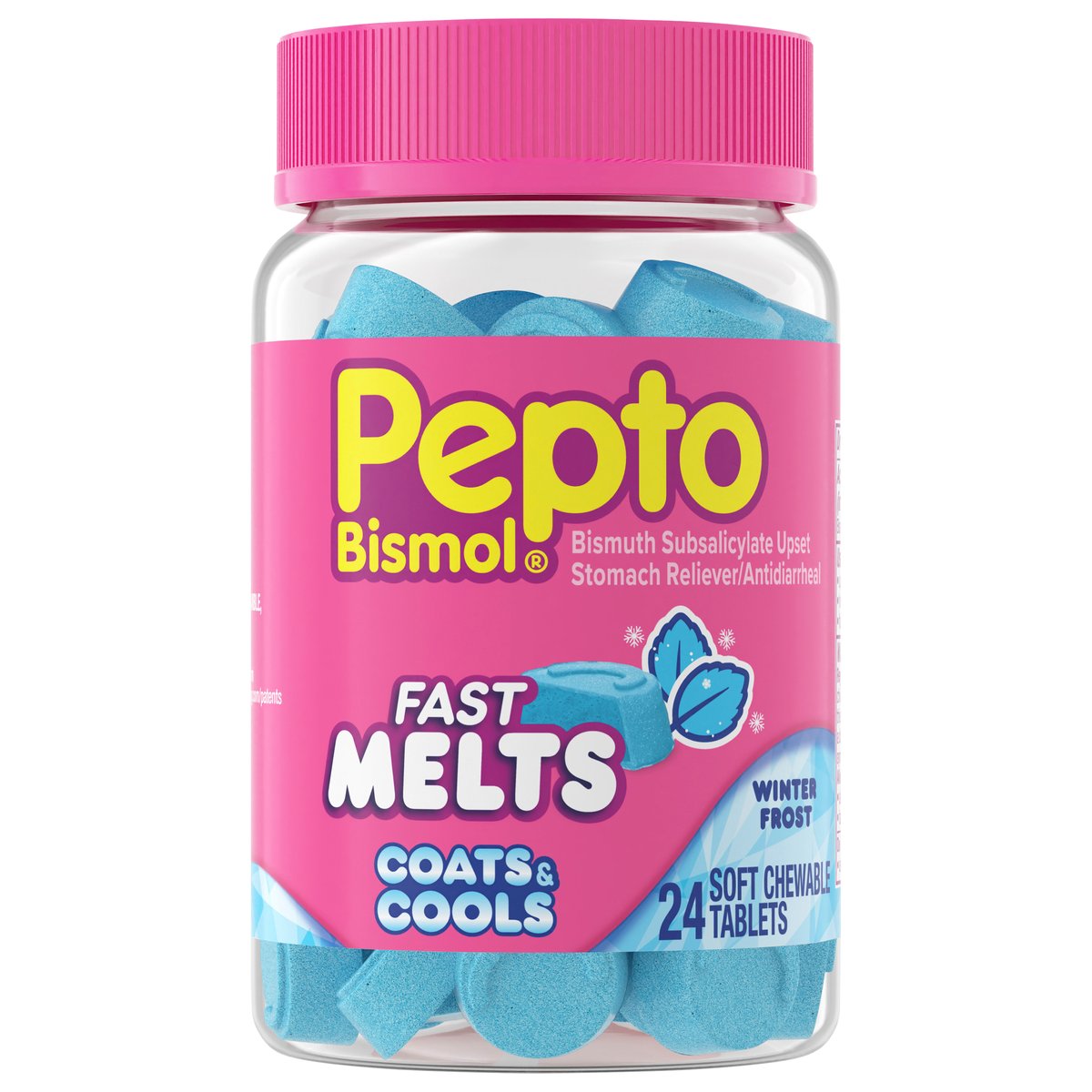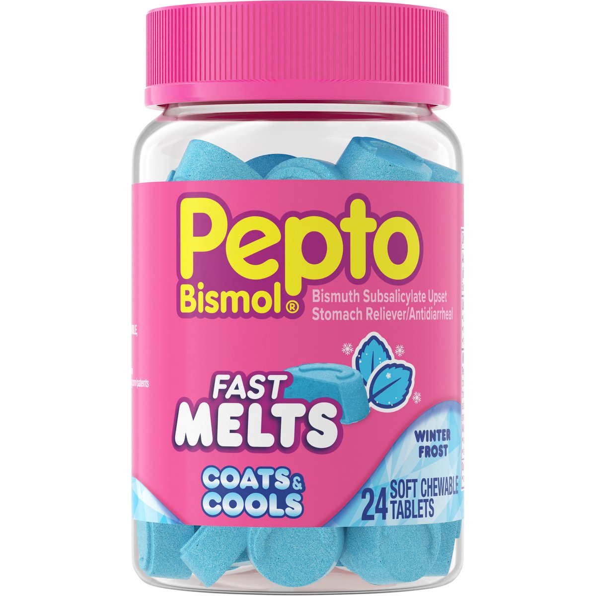 Bismuth subsalicylate upset stomach reliever/ antidiarrheal. Fast melts. Coats & cools. Winter frost. how2recycle.info. www.pg.com. Questions? 1-800-717-3786.