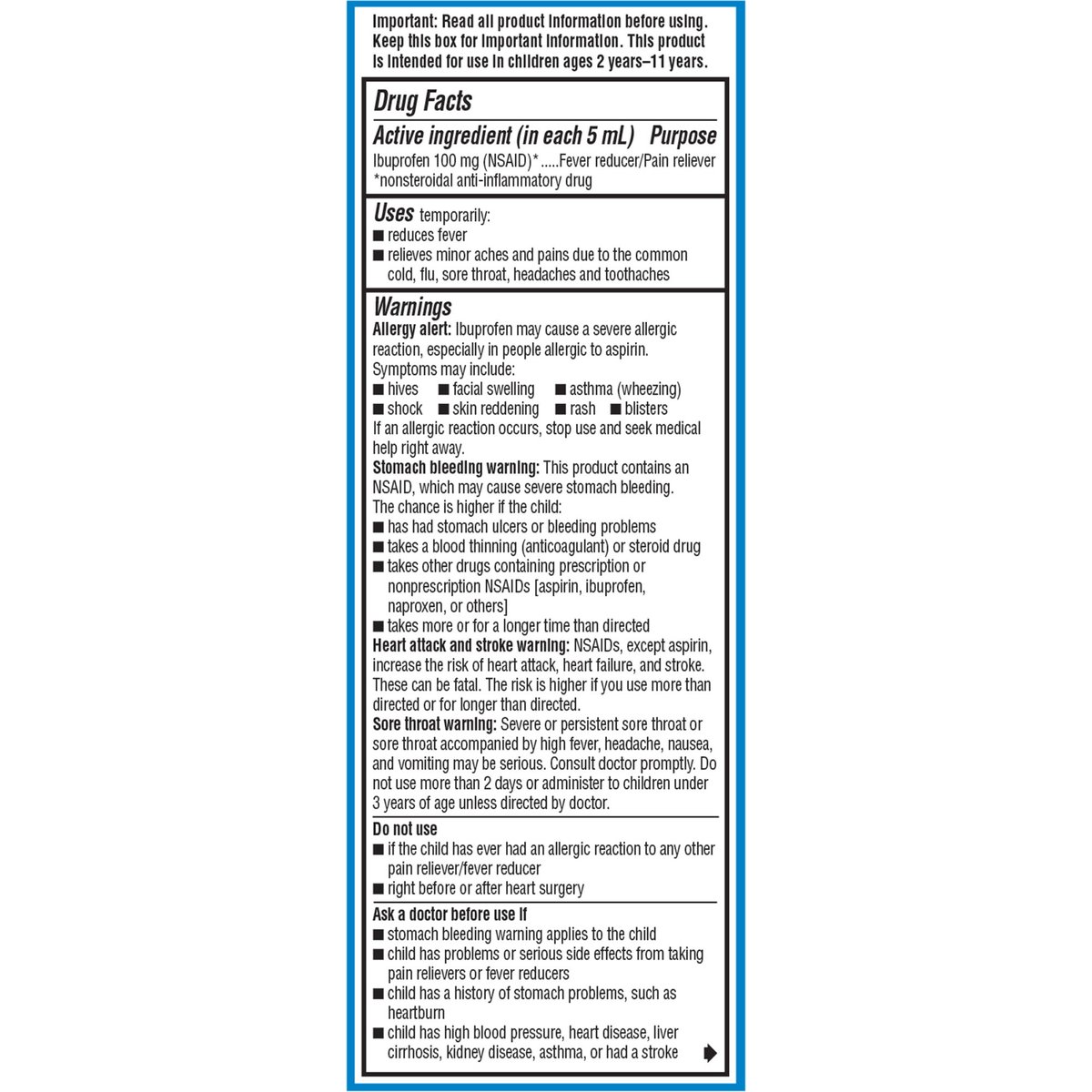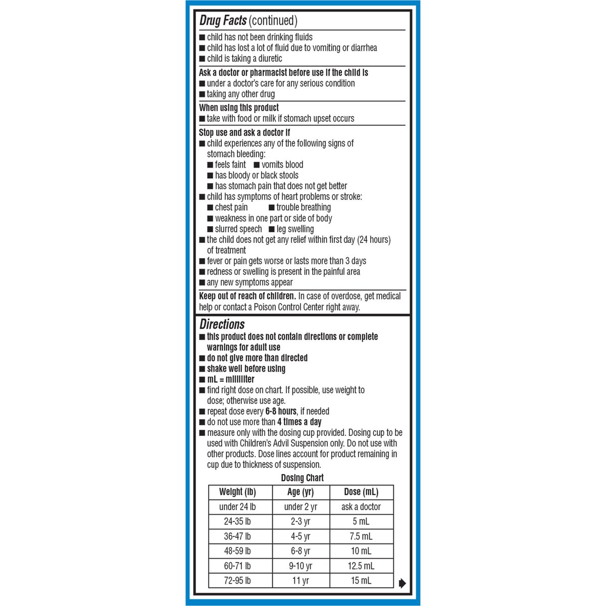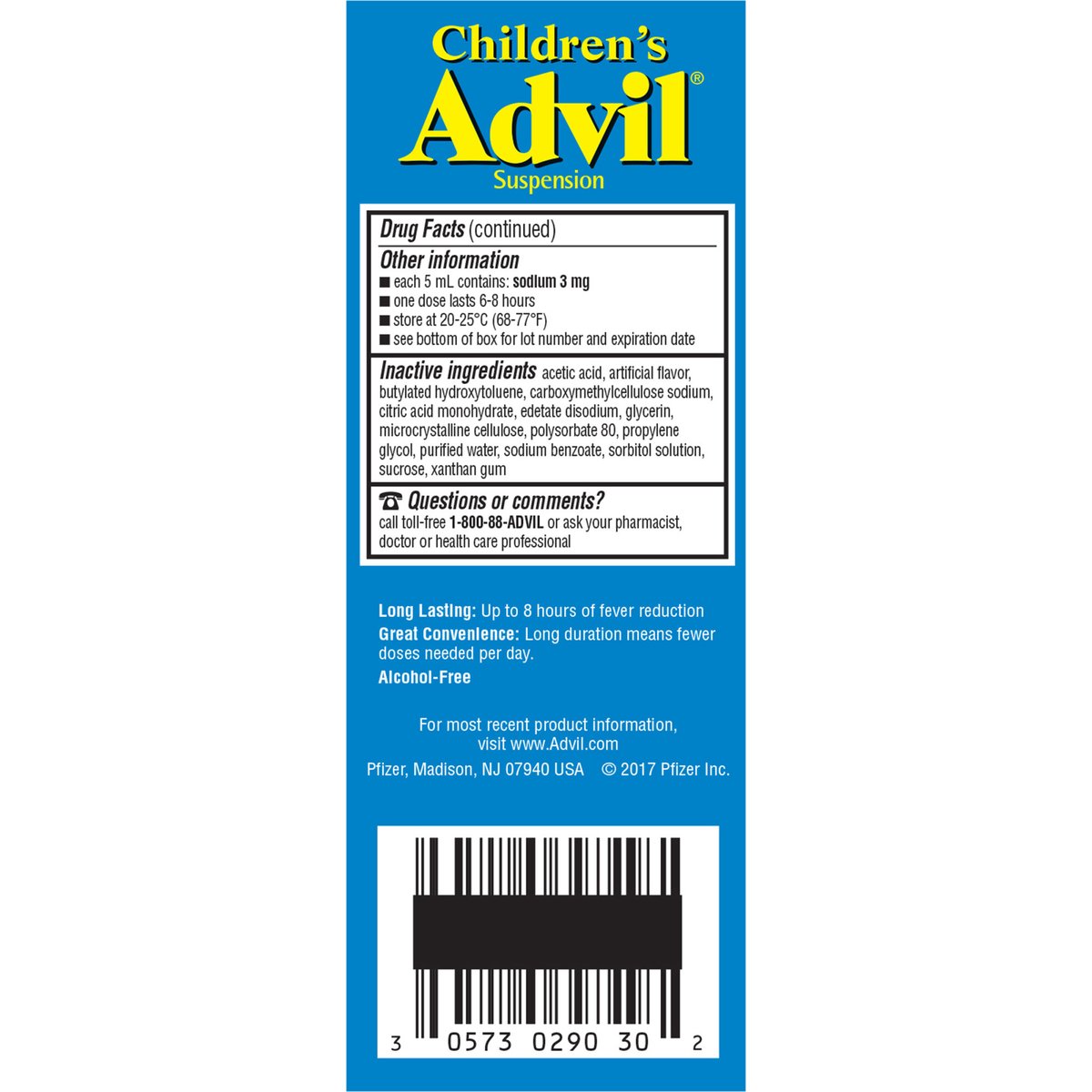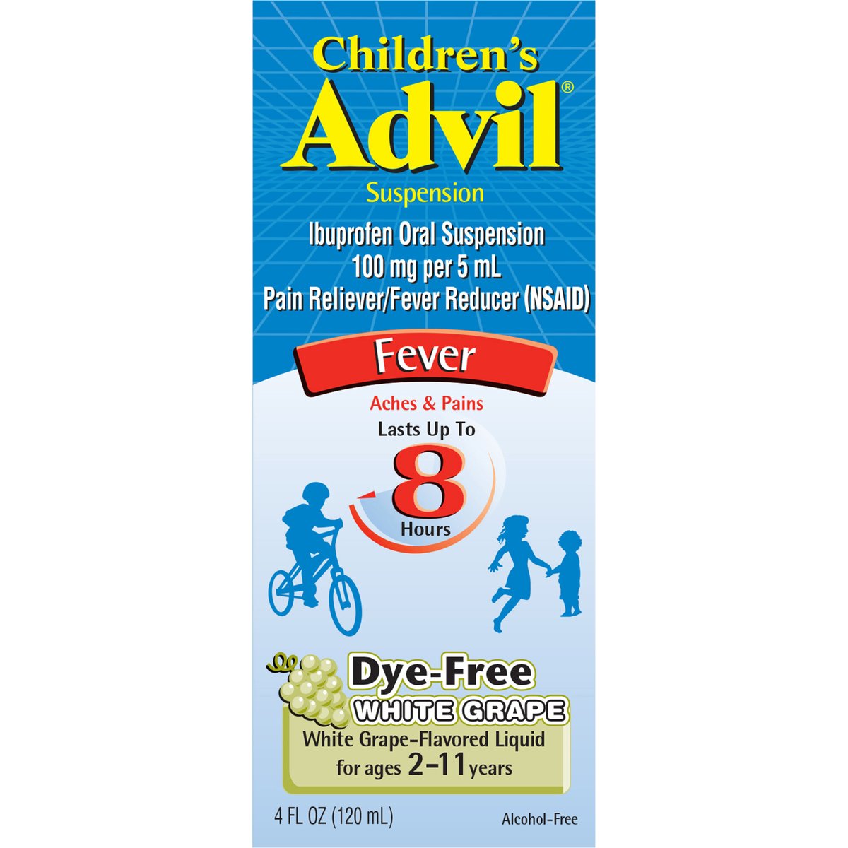 For ages 2-11 years. White grape-flavored liquid. Suspension. Ibuprofen oral suspension 100 mg per 5 ml. Pain reliver/fever reducer (NSAID). Fever. Aches & pains. Last up to 8 hours. Dye-free. Alcohol free. Long Lasting: Up to 8 hours of fever reduction. Great Convenience: Long duration means fewer doses needed per day. www.Advil.com. Questions or comments? call toll-free 1-800-88-Advil or ask your pharmacist, doctor or health care professional. For more recent product information, visit www.Advil.com.