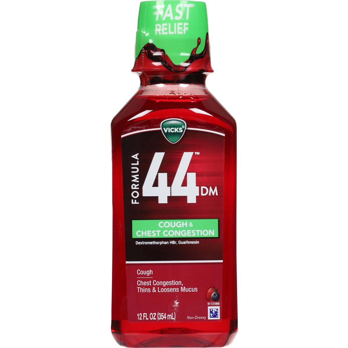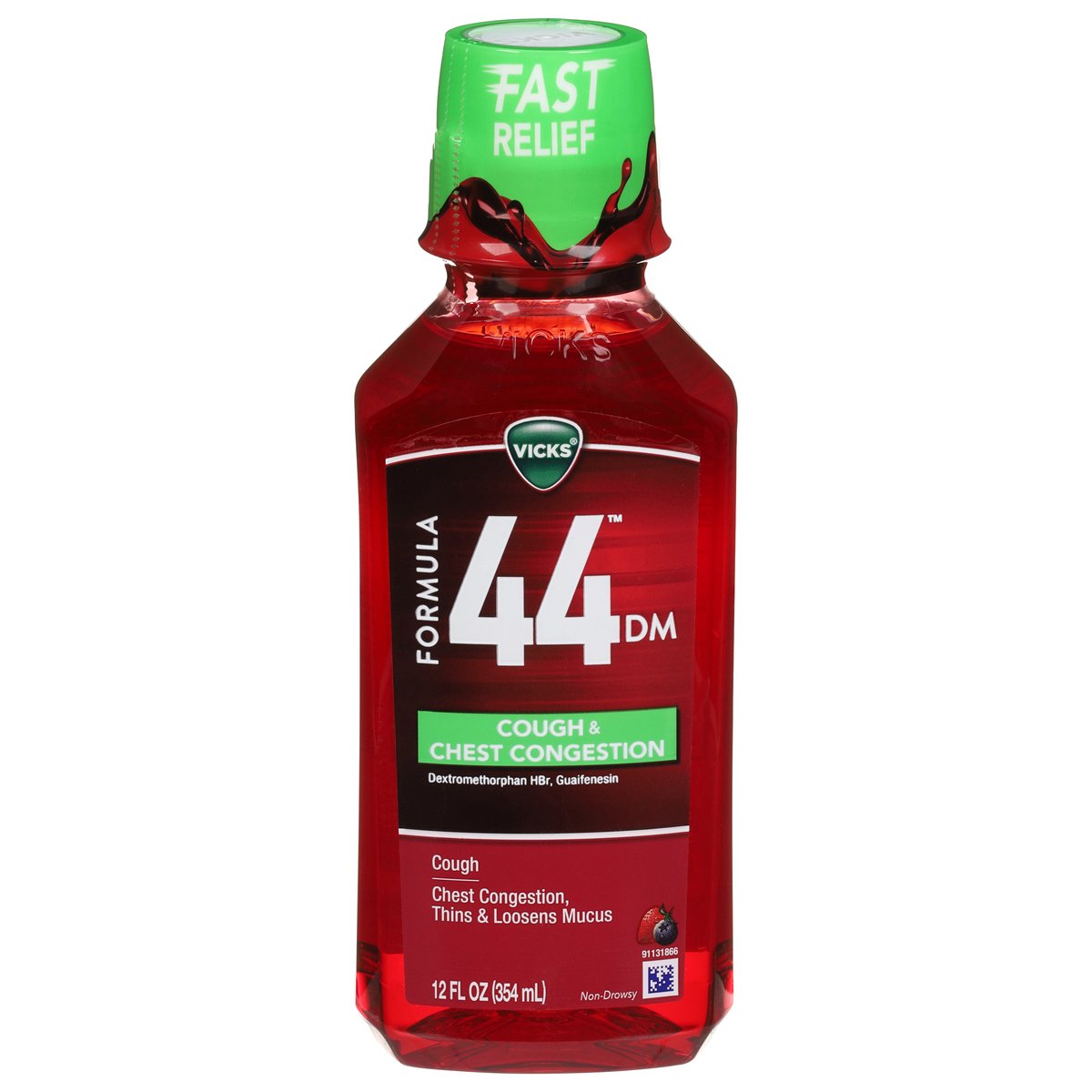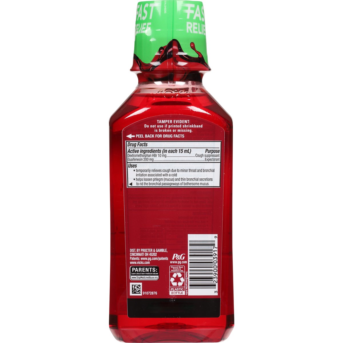 (In Each 15 mL): Other Information: Each 15 mL Contains: Sodium 45 mg. Store at no greater than 25 degrees C. Dextromethorphan HBr, Guaifenesin. Fast relief. Cough. Chest congestion, thins & loosens mucus. Non-drowsy. www.vicks.com. www.pg.com. how2recycle.info. Questions? 1-800-362-1683. Parents: Learn about teen medicine abuse. www.StopMedicineAbuse.org.