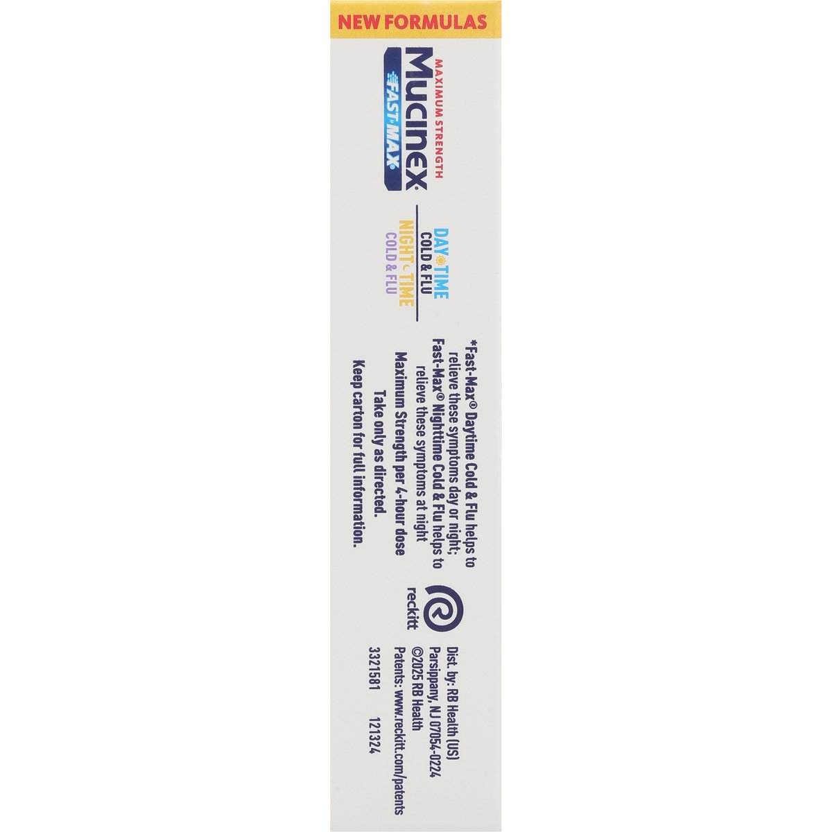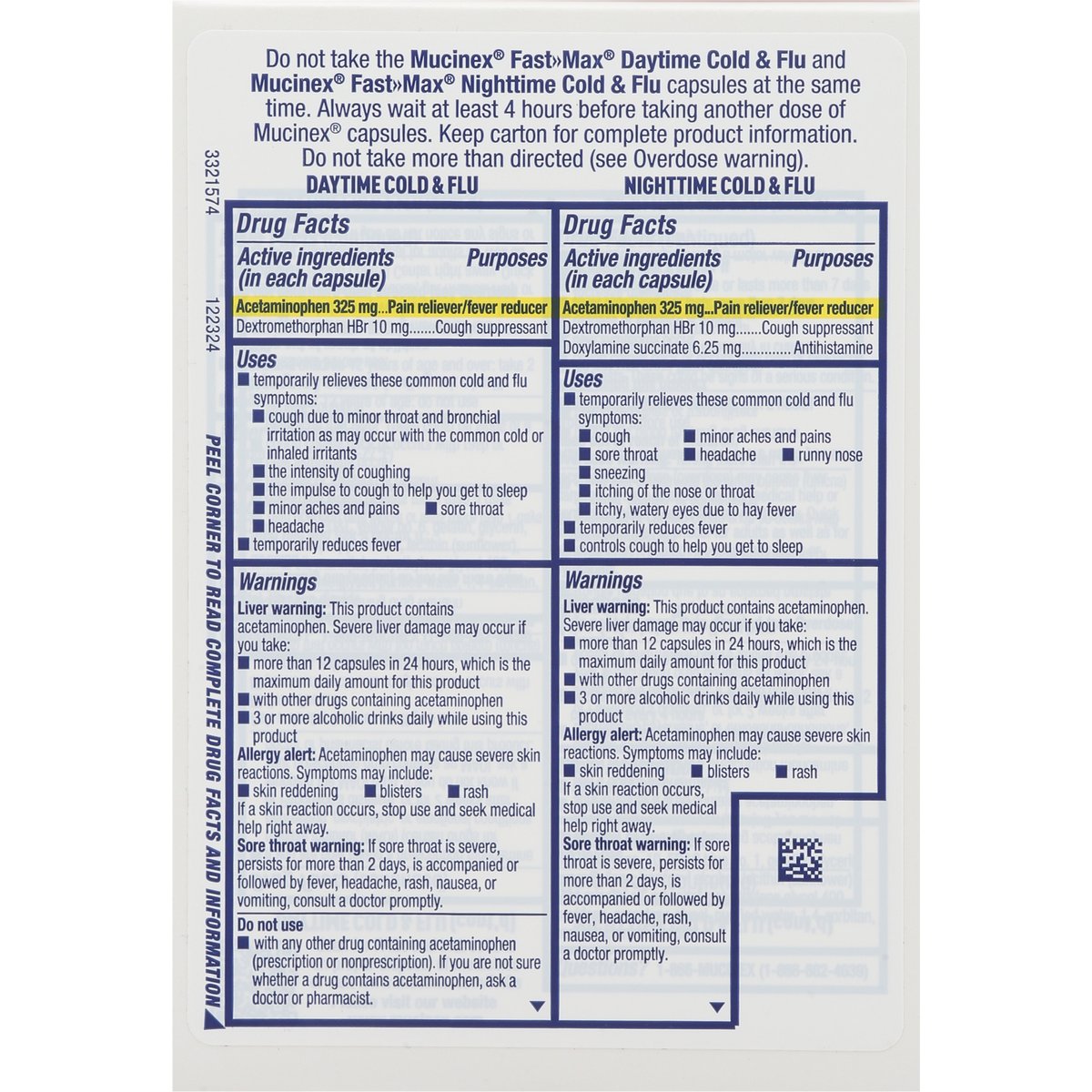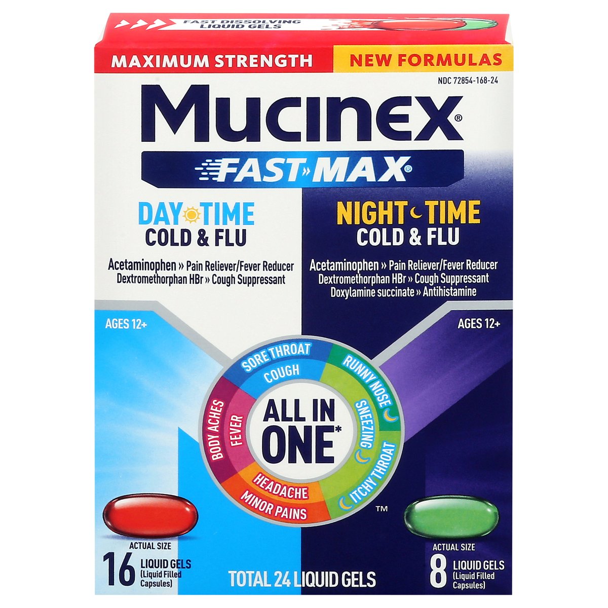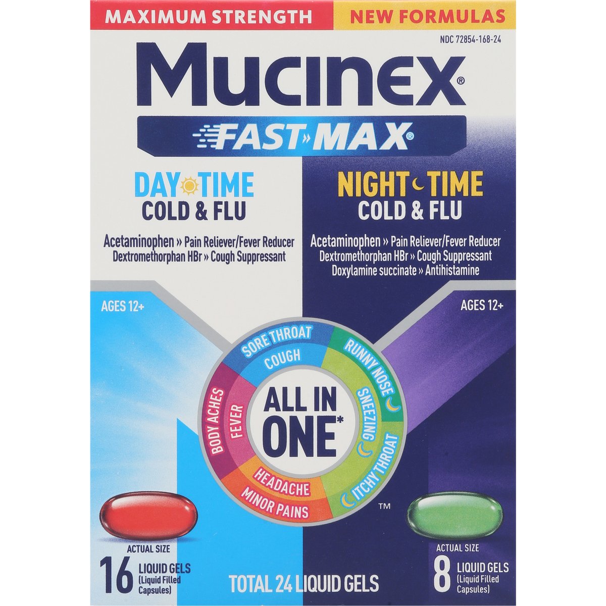 In Each Capsule: Other Information: Store at 20-25 degrees C (68-77 degrees F). Avoid excessive heat. In Each Capsule: Other Information: Store at 20-25 degrees C (68-77 degrees F). Avoid excessive heat. Ages 12+. Day Time Cold & Flu: Acetaminophen - Pain Reliever/Fever Reducer Dextromethorphan HBr - Cough Suppressant. Night Time Cold & Flu: Acetaminophen - Pain Reliever/Fever Reducer. Dextromethorphan HBr - Cough Suppressant. Doxylamine succinate - Antihistamine. Maximum strength. New formulas. All in One *: Sore throat; Cough. Runny nose; Sneezing; Itchy throat. Minor pains; Headache. Body aches; Fever. Fast dissolving liquid gels. * Fast-Max Daytime Cold & Flu helps to relieve these symptoms day or night; Fast-Max Nighttime Cold & Flu helps to relieve these symptoms at night. www.mucinex.com. how2recycle.info. Scan for FAQs and instructions on proper disposal of medicines or visit www.mucinex.com/FAQs. Please visit our website www.mucinex.com. Questions? 1-866-MUCINEX (1-866-682-4639). Parents: Learn more about teen medicine abuse. www.StopMedicineAbuse.org.