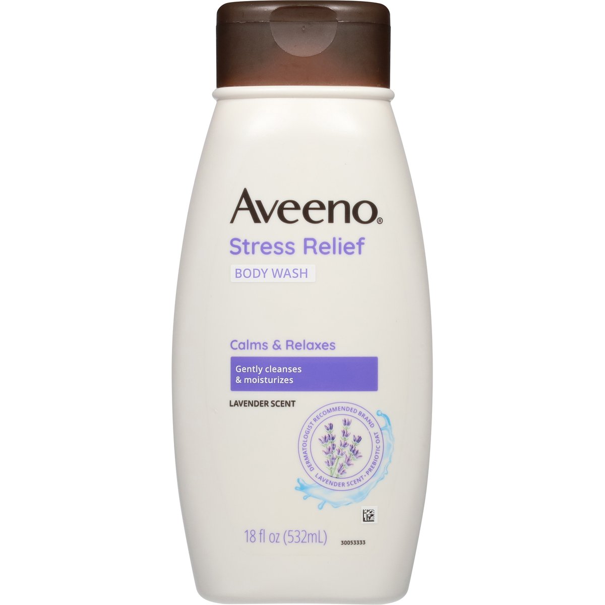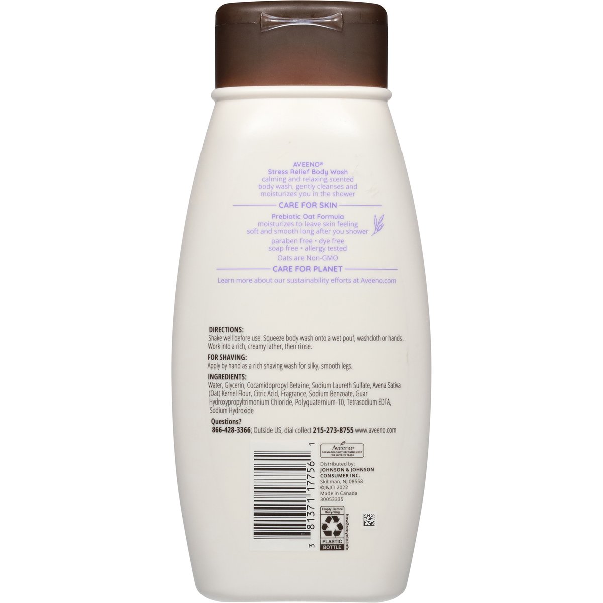 Oats are Non-GMO. Calms & relaxes. Gently cleanses & moisturizes. With lavender, chamomile & ylang-ylang. Dermatologist recommended brand. Lavender scent. Prebiotic oat. Aveeno Stress Relief Body Wash clinically shown to help calm and relax you in the shower while cleansing and moisturizing. Care for skin. Prebiotic oat formula moisturizes to leave skin feeling soft and smooth long after you shower. Paraben free. Dye free. Soap free. Allergy tested. Dermatologist recommended for over 70 years. www.aveeno.com. how2reycle.info. Questions? 866-428-3366; Outside US, dial collect 215-273-8755. www.aveeno.com. Care for Planet: Learn more about sustainability efforts at Aveeno.com. Made in Canada.