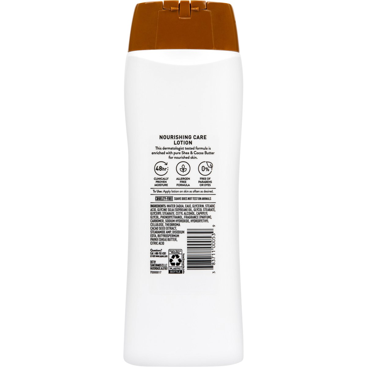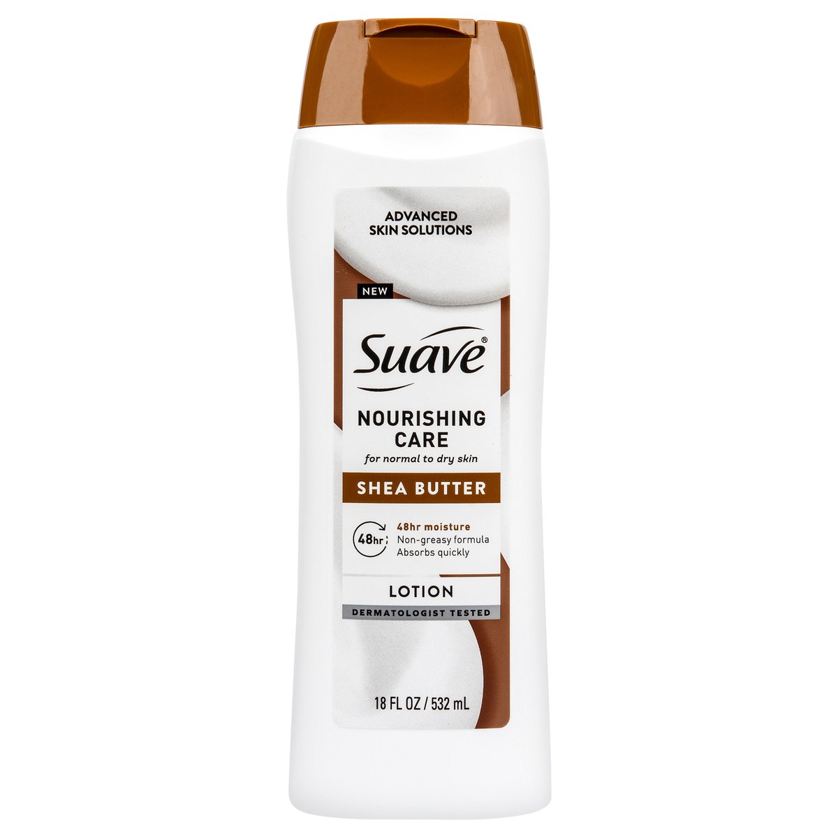 Advanced solution. New. For normal to dry skin. 48hr moisture non-greasy formula absorbs quickly. Dermatologist tested. This dermatologist tested formula is enriched with pure Shea & Cocoa butter for nourished skin. 48hr clinically proven moisture. Allergen free formula. 0% free of paraben or dye. www.suave.com. how2recycle.info. Question? 1-800-782-8301 or visit www.suave.com. Cruelty-free Suave does not test on animals.