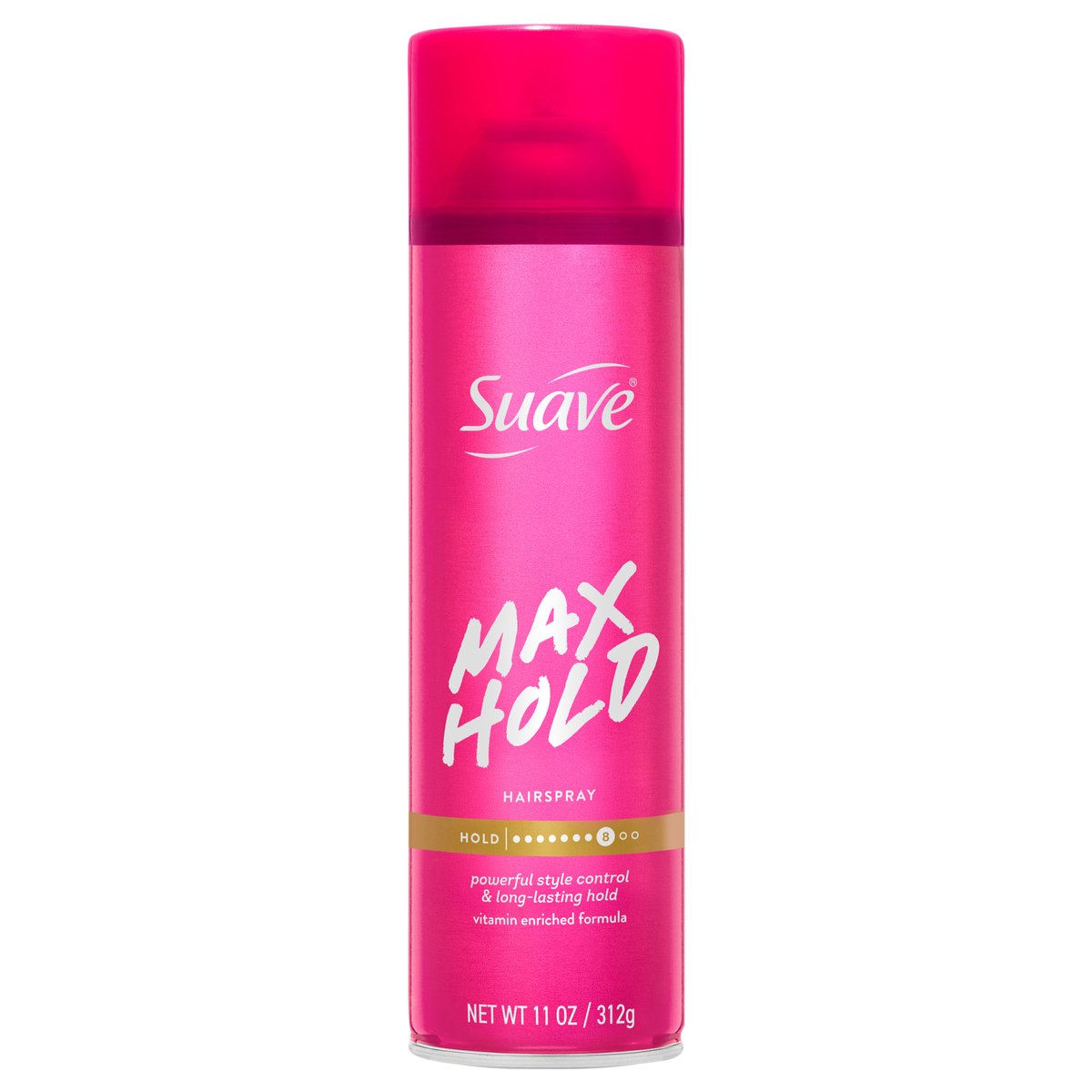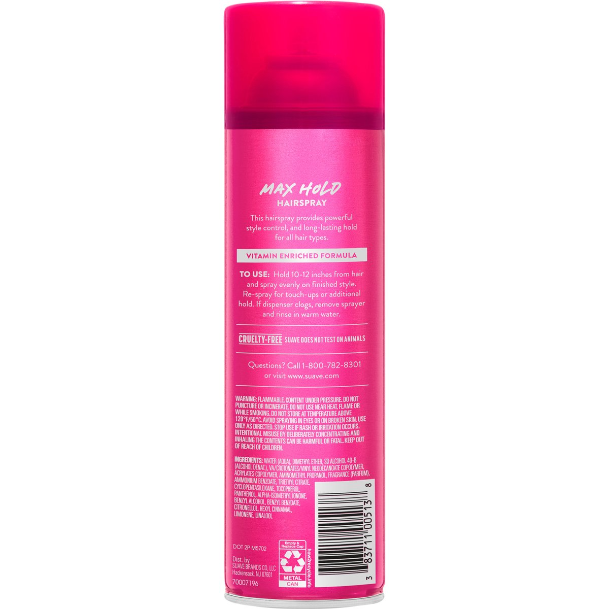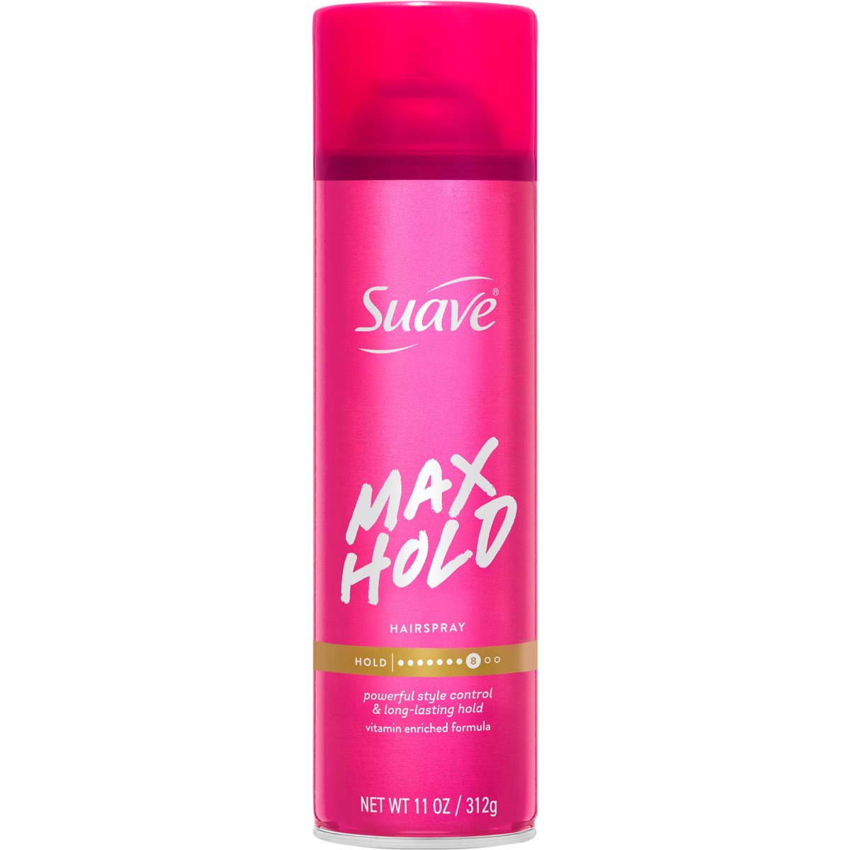 Powerful style control & long-lasting hold. Vitamin enriched formula. Hold: 8. This hairspray provides powerful style control, and long-lasting hold for all hair types. www.suave.com. how2recycle.info. Question? Call 1-800-782-8301 or visit www.suave.com. Cruelty-free. Suave does not test on animals.