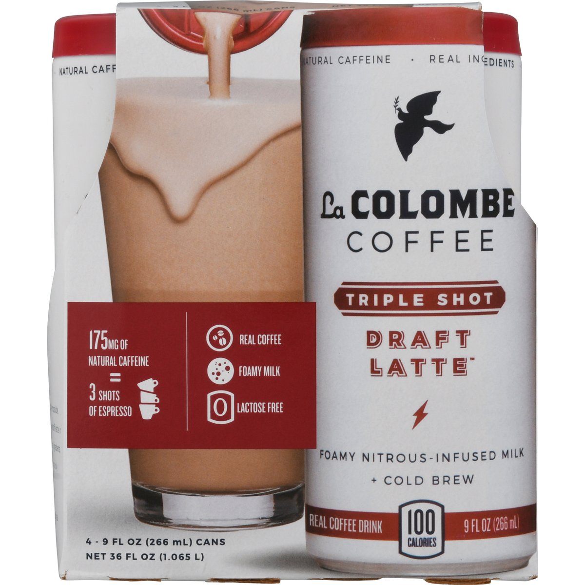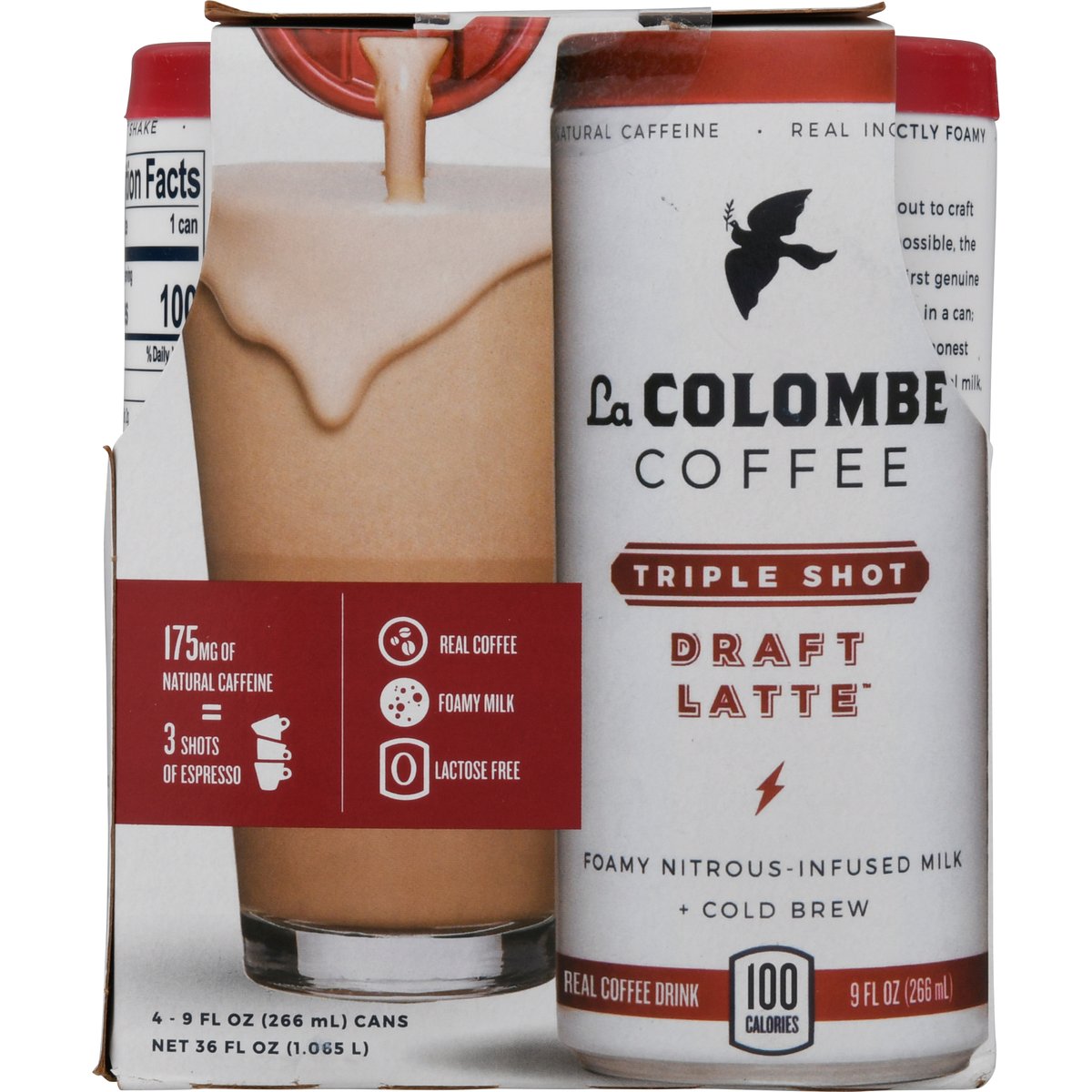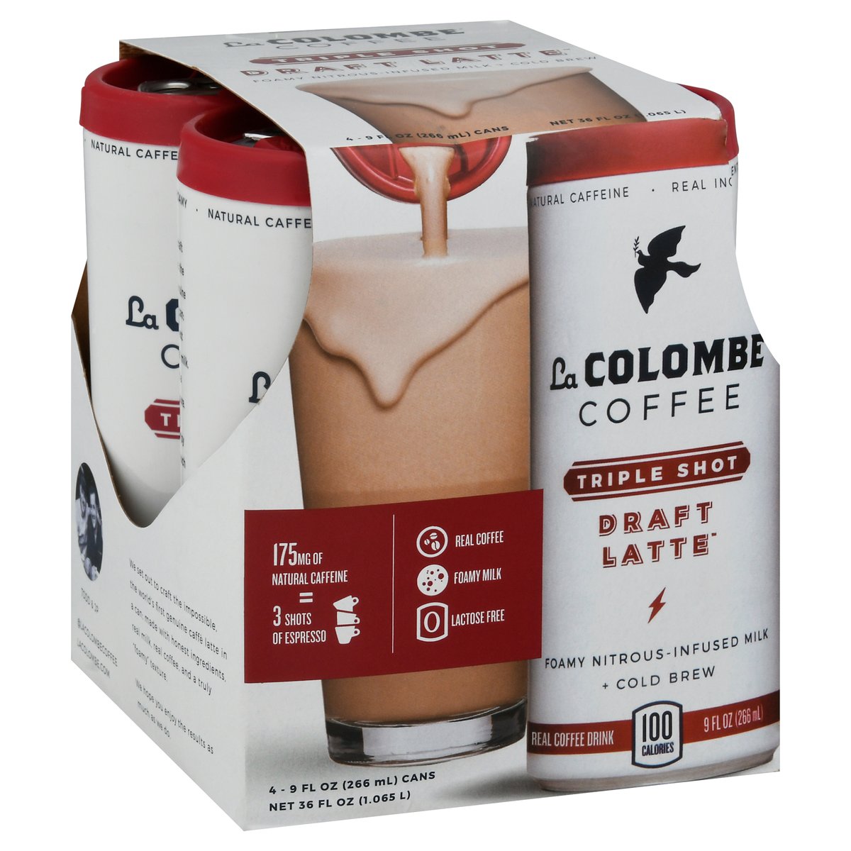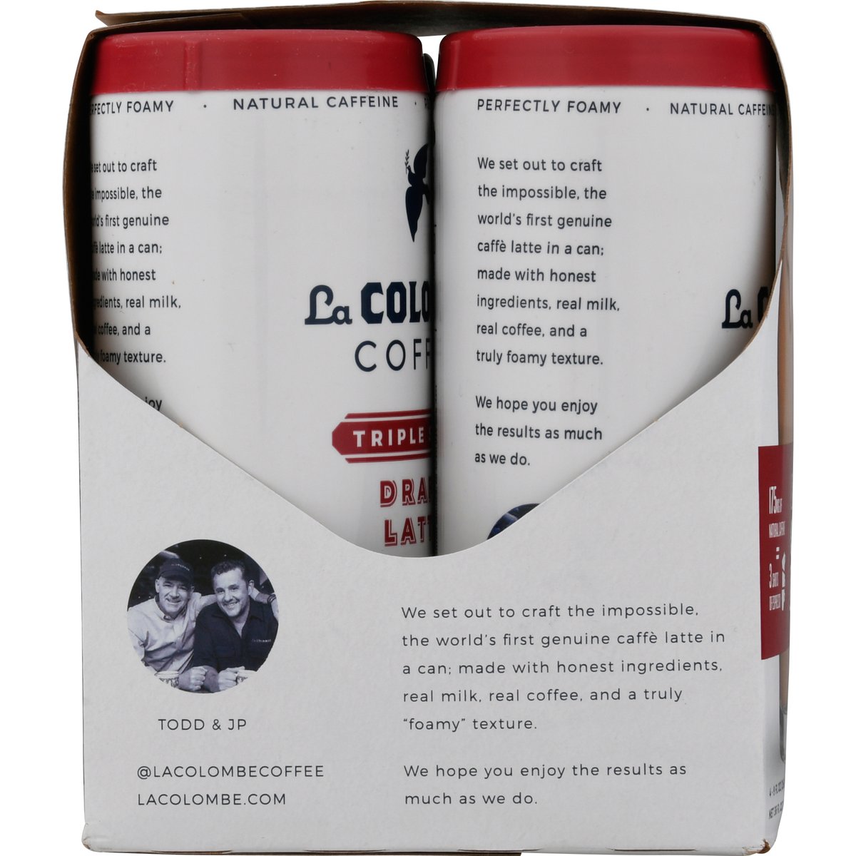 Real coffee drink. 100 calories. Lactose free. 175 mg of natural caffeine = 3 shots of espresso. Real coffee. Foamy milk. Foamy nitrous - infused milk + cold brew. We set out to craft the impossible, the world's first genuine caffe latte in a can; made with honest ingredients, real milk, real coffee, and a truly foamy texture. We hope you enjoy the results as much as we do. - Todd & JP. lacolombe.com. (at)lacolombecoffee.
