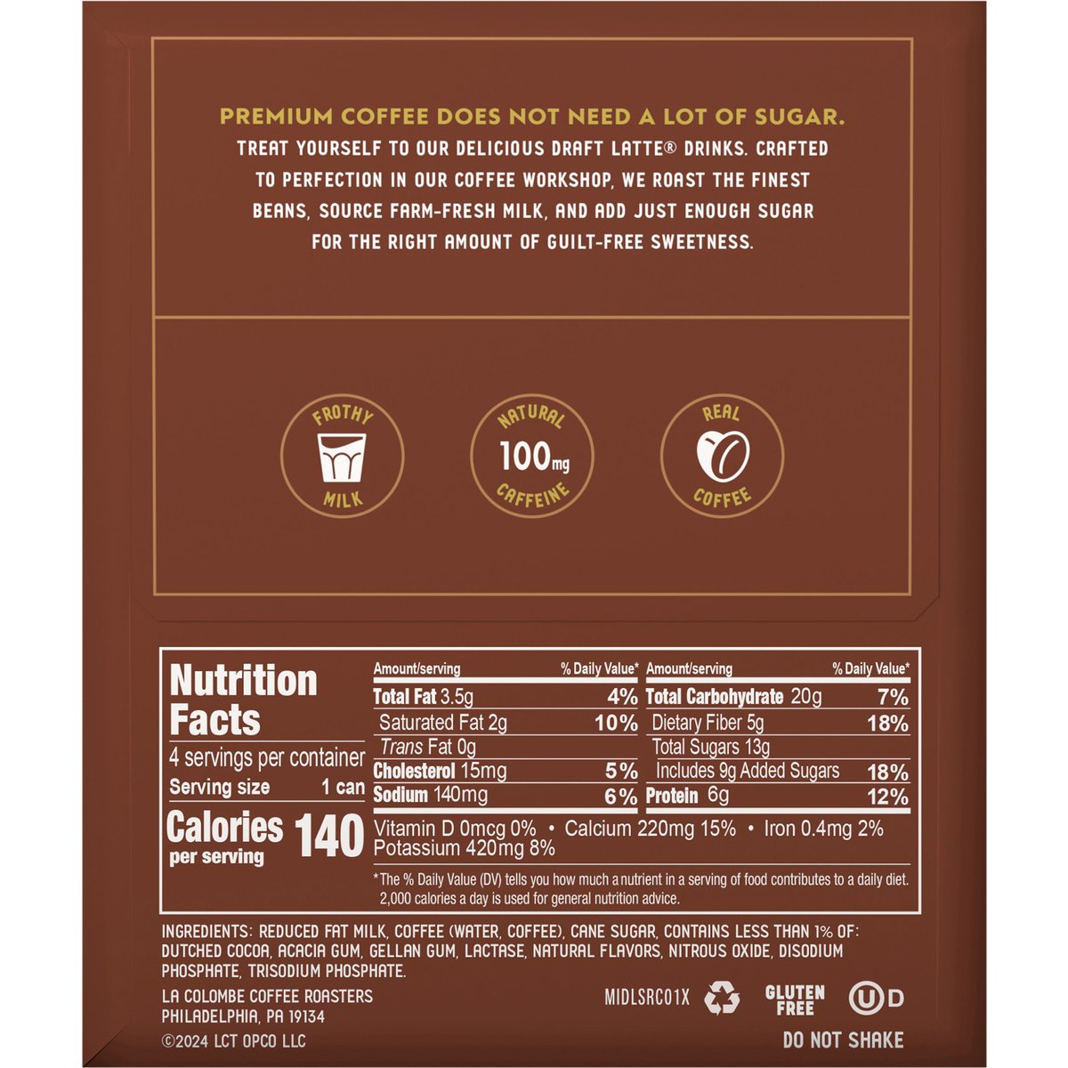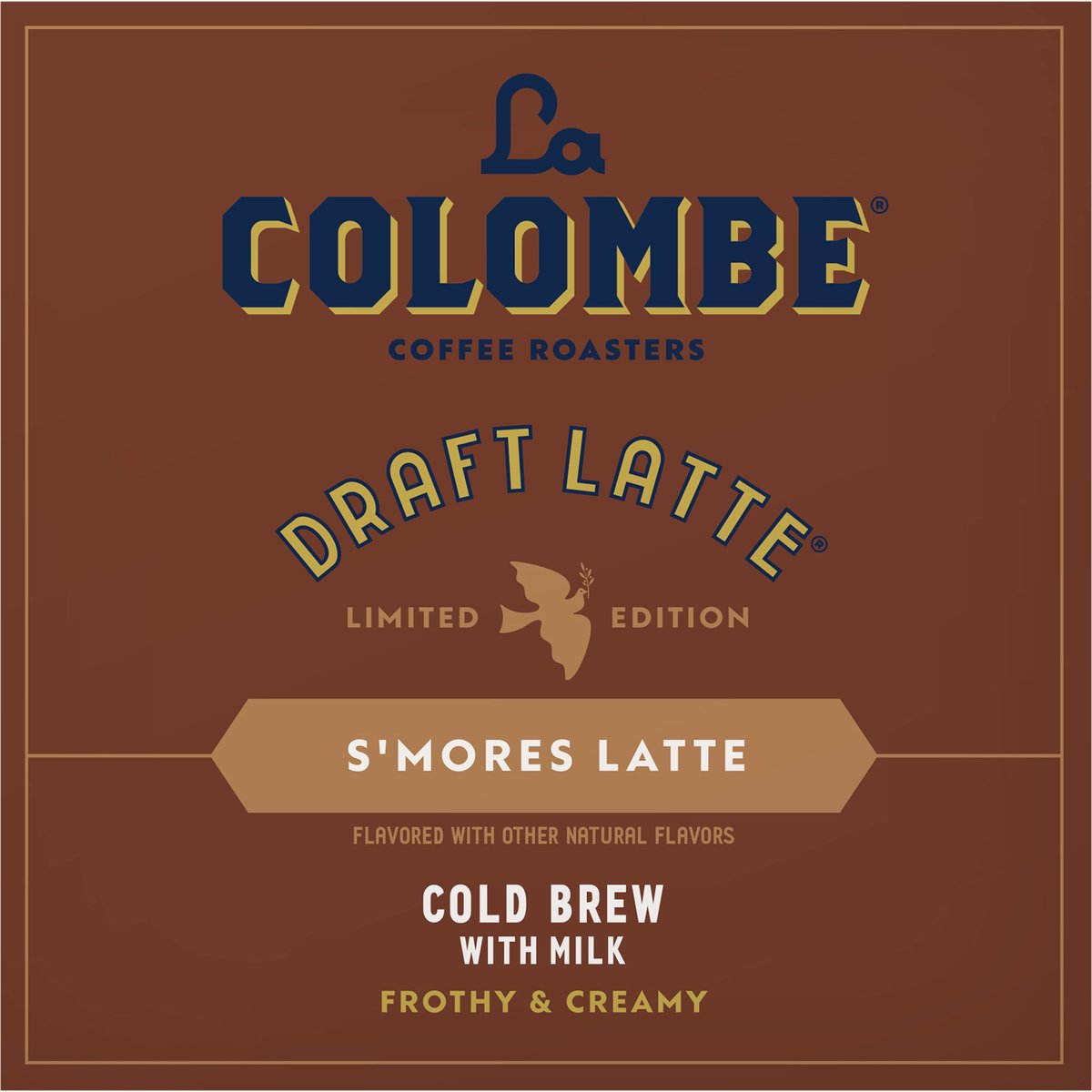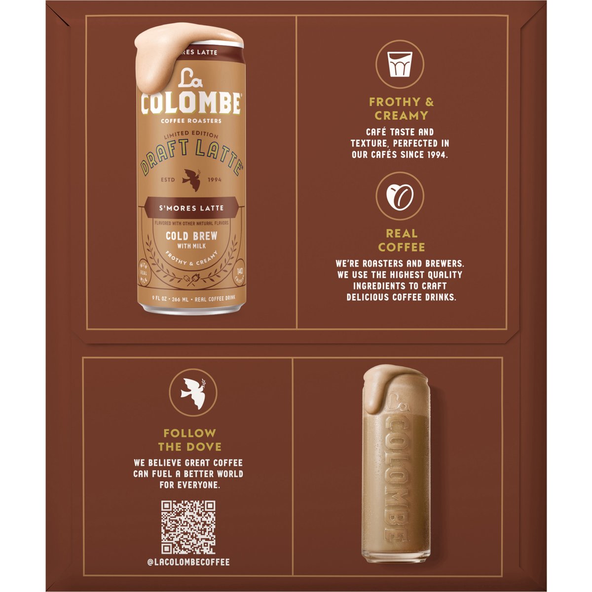 Limited Edition Flavored with other natural flavors. Gluten free. 100 mg natural caffeine. Cold brew & milk. Real coffee drink. Estd 1994. Premium coffee does not need a lot of sugar. Treat yourself to our delicious draft latte drinks. Crafted to perfection in our coffee workshop, we roast the finest beans, source farm-fresh milk, and add just enough sugar for the right amount of guilt-free sweetness. Frothy milk. Real coffee. Frothy & Creamy: Cafe taste and texture, perfected in our cafes since 1994. Real Coffee: We're roasters and brewers. We use the highest quality ingredients to craft delicious coffee drinks. Follow the Dove: We believe great coffee can fuel a better world for everyone. @lacolombecoffee.