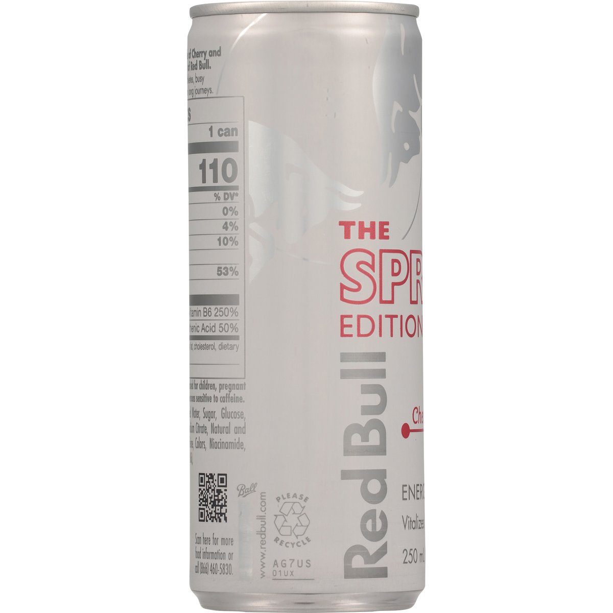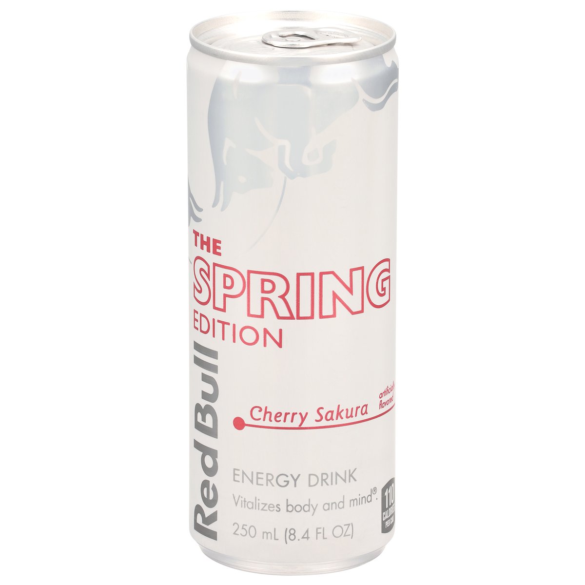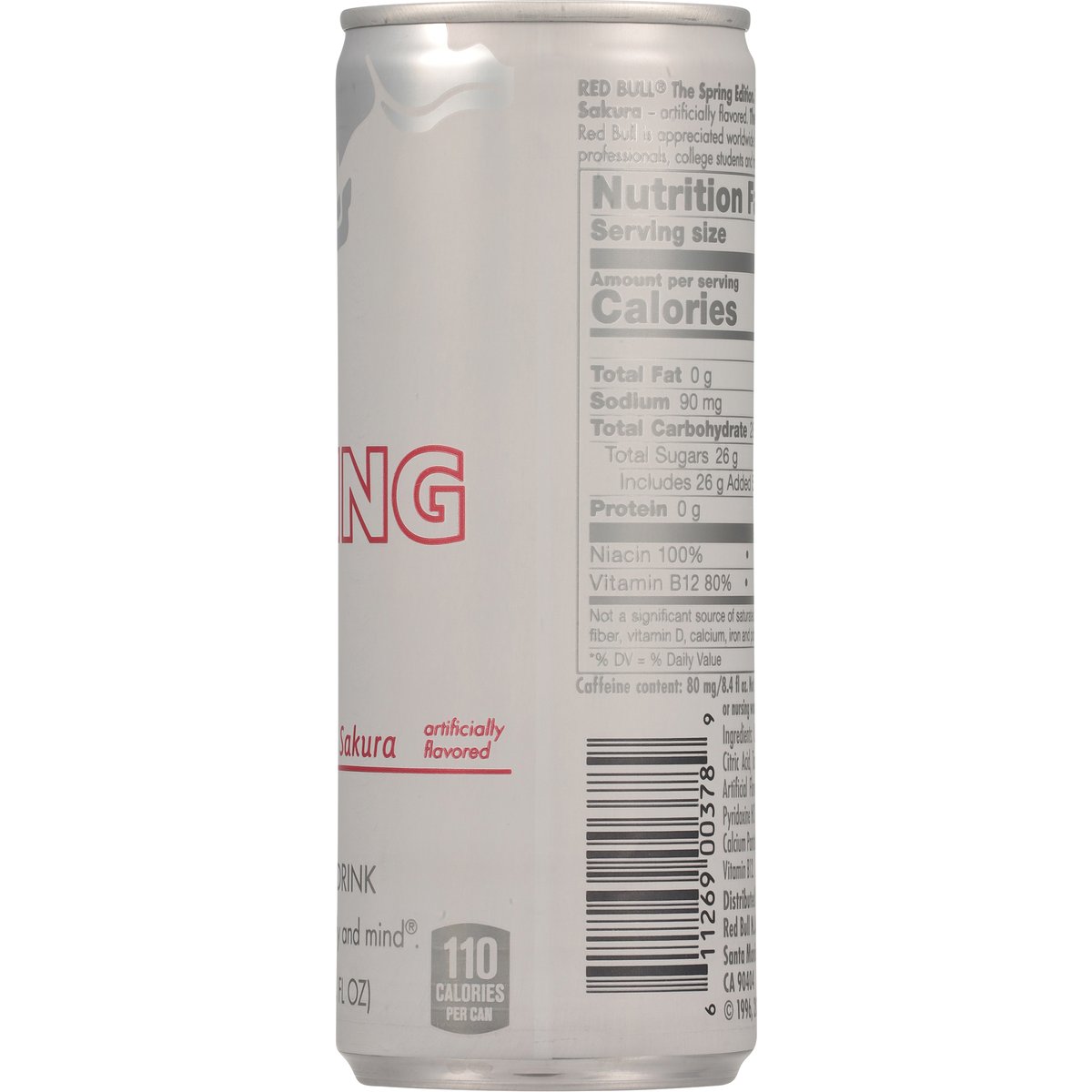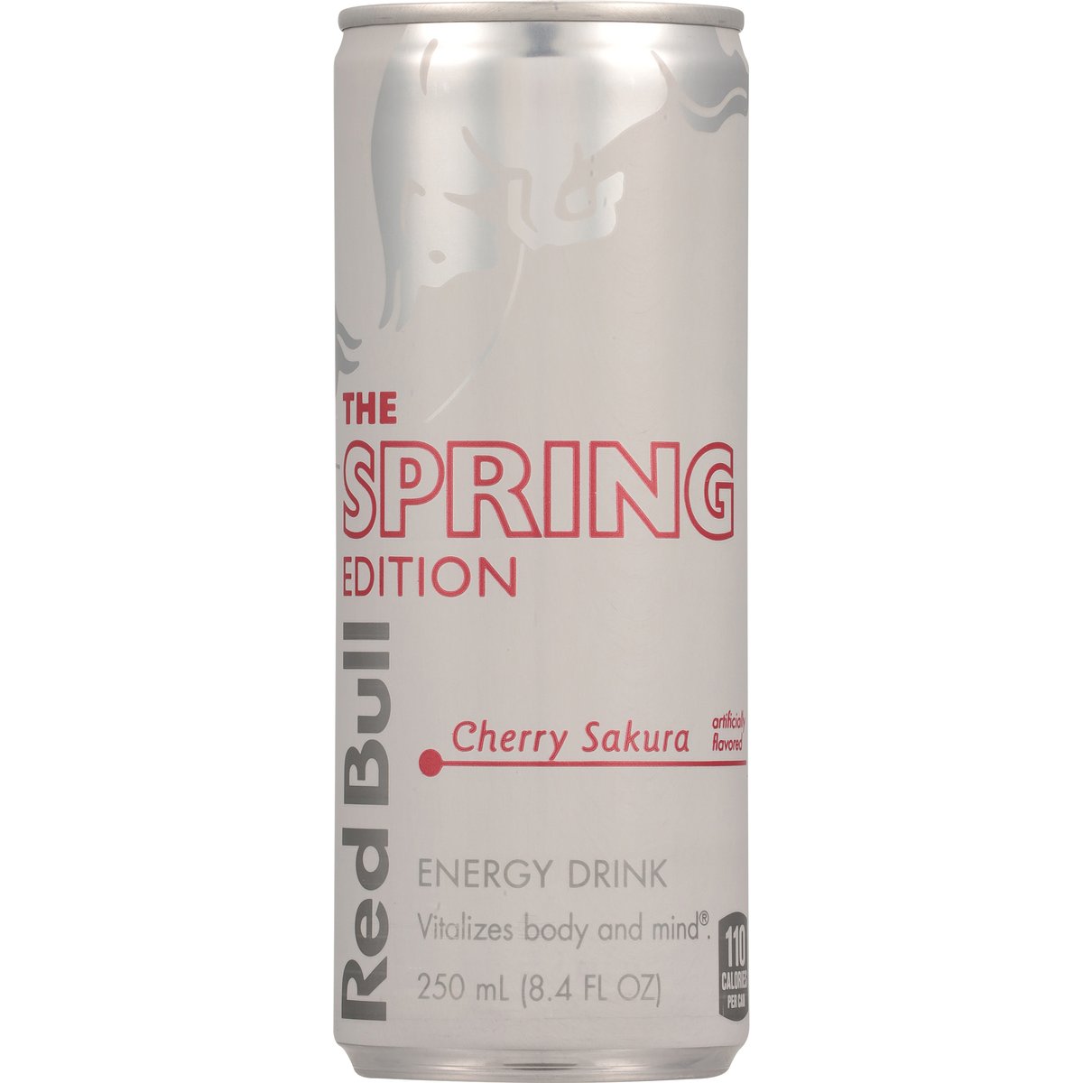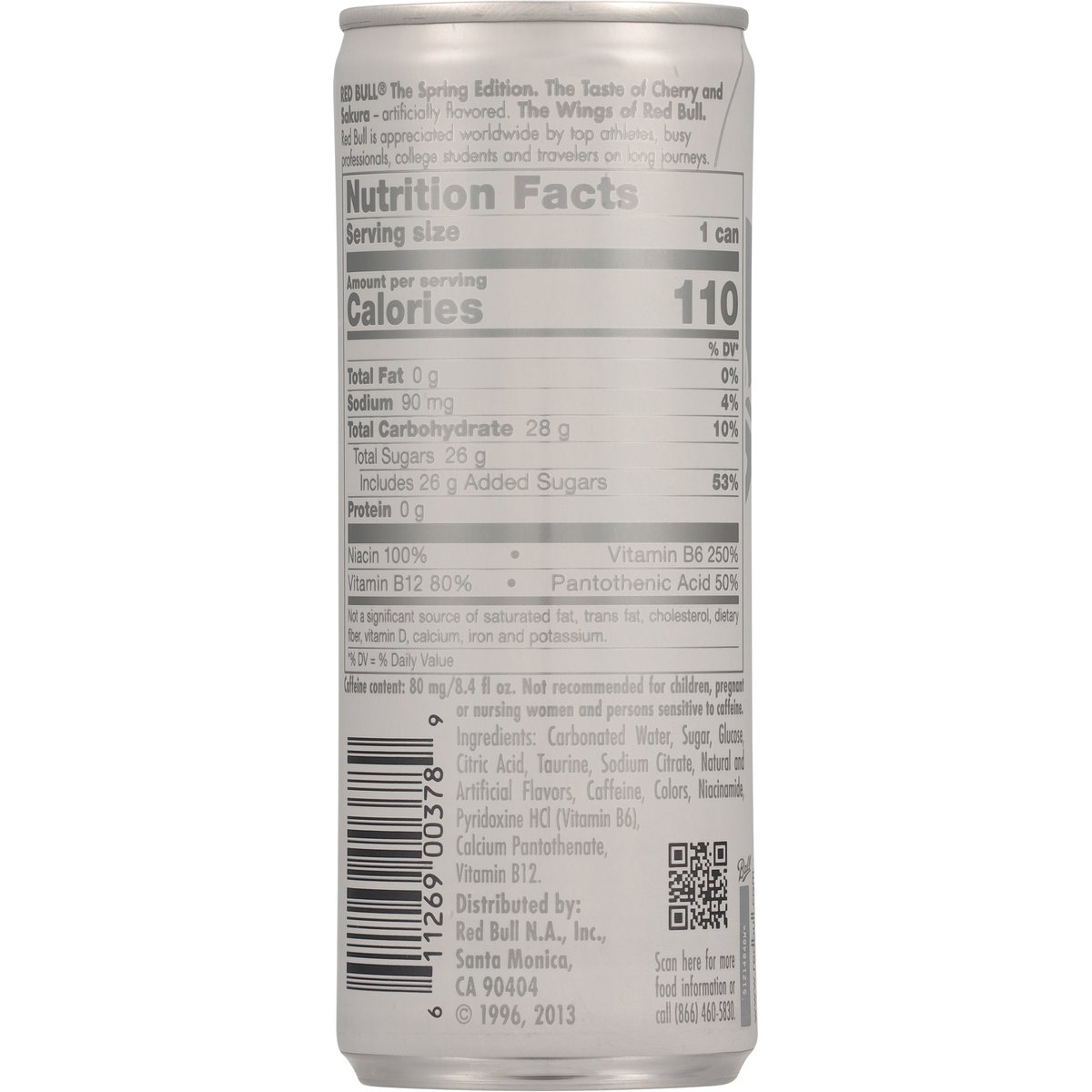 The Spring Edition Artificially flavored. 110 calories per can. Caffeine Content: 80 mg/8.4 fl oz. Vitalizes body and mind. Red Bull The Spring Edition. The Taste of Cherry and Sakura - artificially flavored. The Wings of Red Bull. Red Bull is appreciated worldwide by top athletes, busy professionals, college students and travelers on long journeys. www.redbull.com. Scan for more food information or call (866) 460-5830. Please recycle.