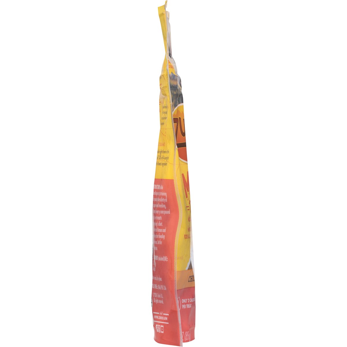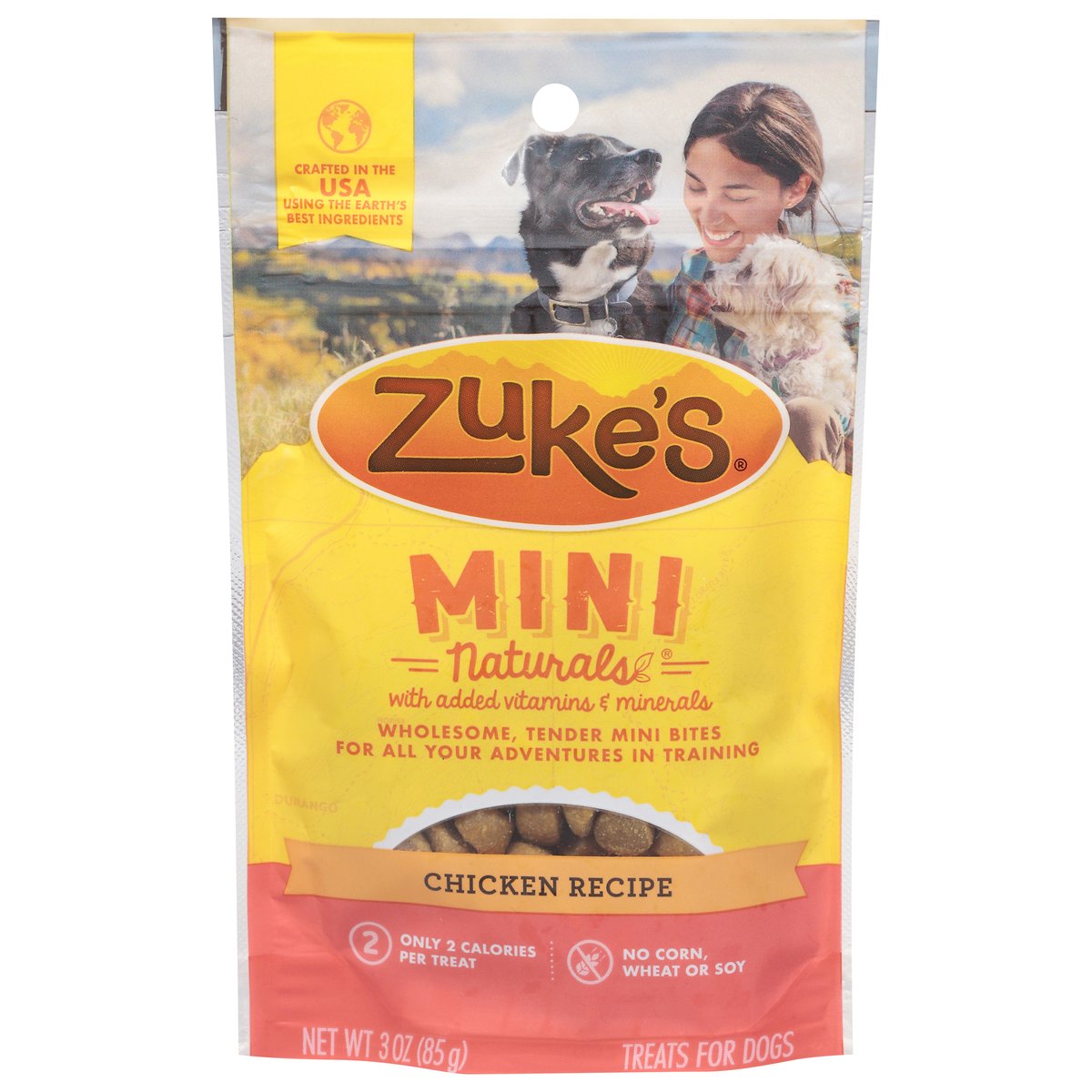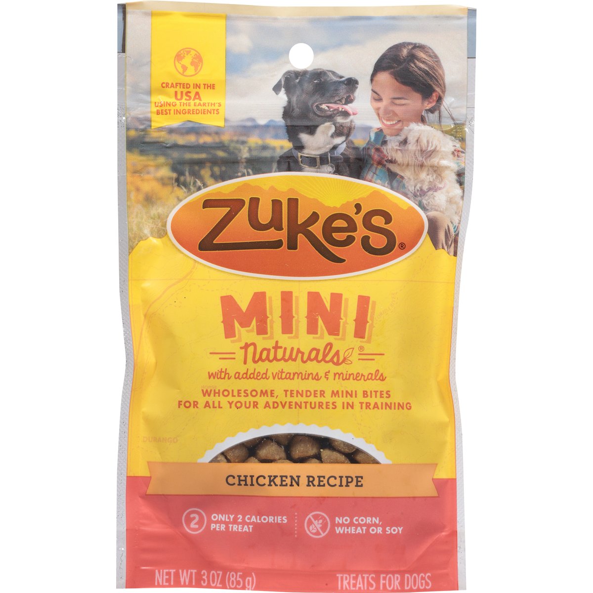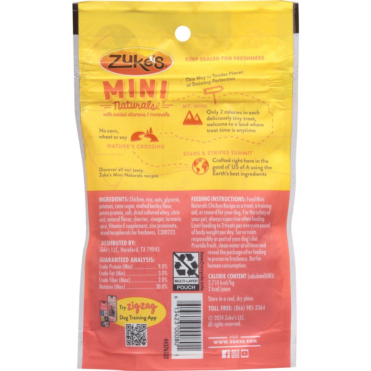 Calorie content (calculated)(ME): 2710 kcal/kg, 2 kcal/piece. Natural with added vitamins & minerals. Wholesome, tender mini bites. No corn, wheat or soy. With added vitamins & minerals. No corn, wheat or soy. This way to tender pieces of training perfection. Mt. Mini. Only 2 calories in each deliciously tiny treat, welcome to a land where treat time is anytime. Natures crossing. No corn, wheat or soy. Stars & stripes summit. Discover all our tasty Zuke's Mini Naturals recipes. www.zukes.com. how2recycle.info. Try Zigzag dog training app. Facebook. Instagram. You Tube. Toll Free: (866) 985-3364. Visit www.zukes.com. Discover all our tasty Zuke's mini naturals recipes. Keep sealed for freshness. Crafted in the USA using the Earth's best ingredients. Crafted right here in the good ol' US of A using the Earth's best ingredients.