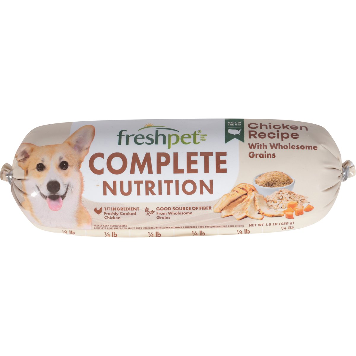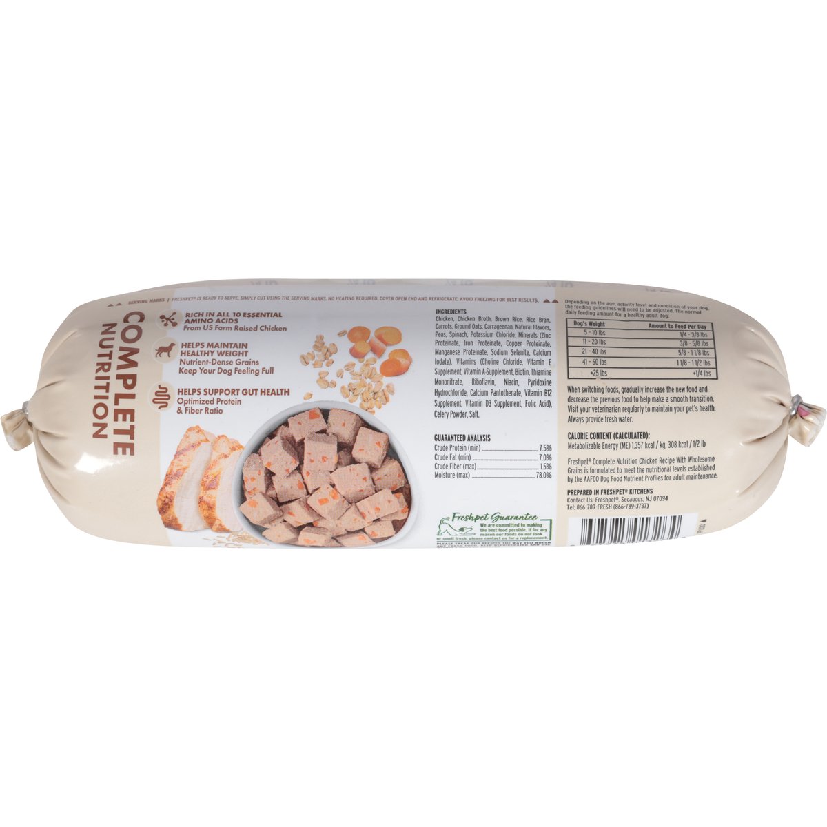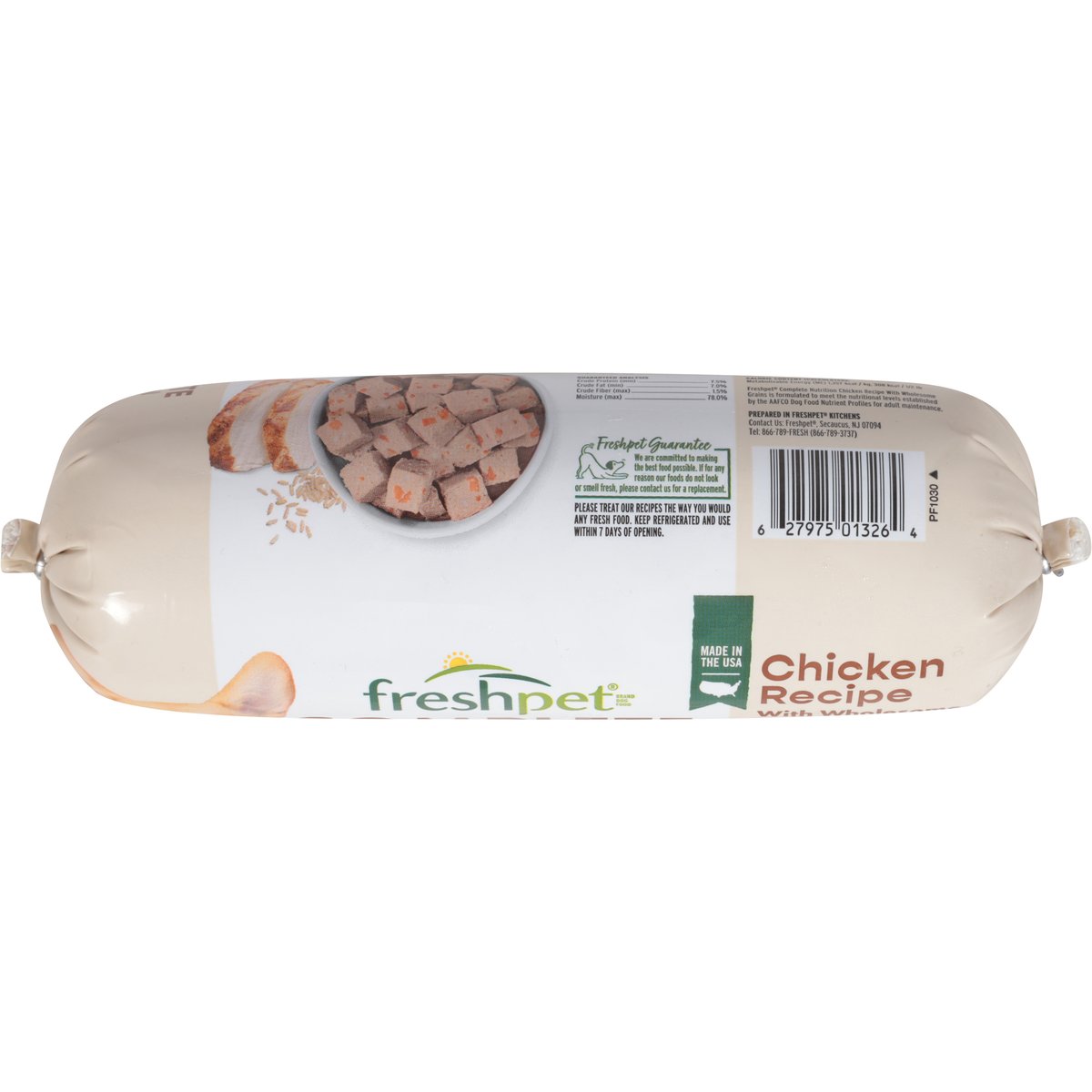 Chicken recipe with wholesome grains. Good source of fiber. From wholesome grains. Natural with added vitamins & minerals. 1st ingredient. Freshly cooked chicken. Complete & balanced for adult dogs. Rich in all 10 essential amino acids. From US farm raised chicken. Helps maintain healthy weight. Nutrient-dense grains. Keep your dog feeling full. Helps support gut health. Optimized protein & fiber ratio. Freshpet Guarantee: We are committed to making the best food possible. If for any reason our foods do not look or smell fresh, please contact us for a replacement. Prepared in Freshpet Kitchens: Contact Us: Freshpet, Secaucus, NJ 07094. Tel: 866-789-fresh (866-789-3737). Made in the USA.