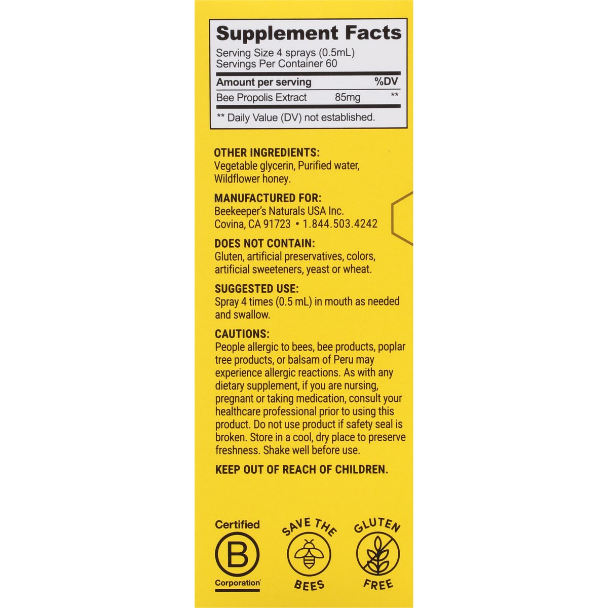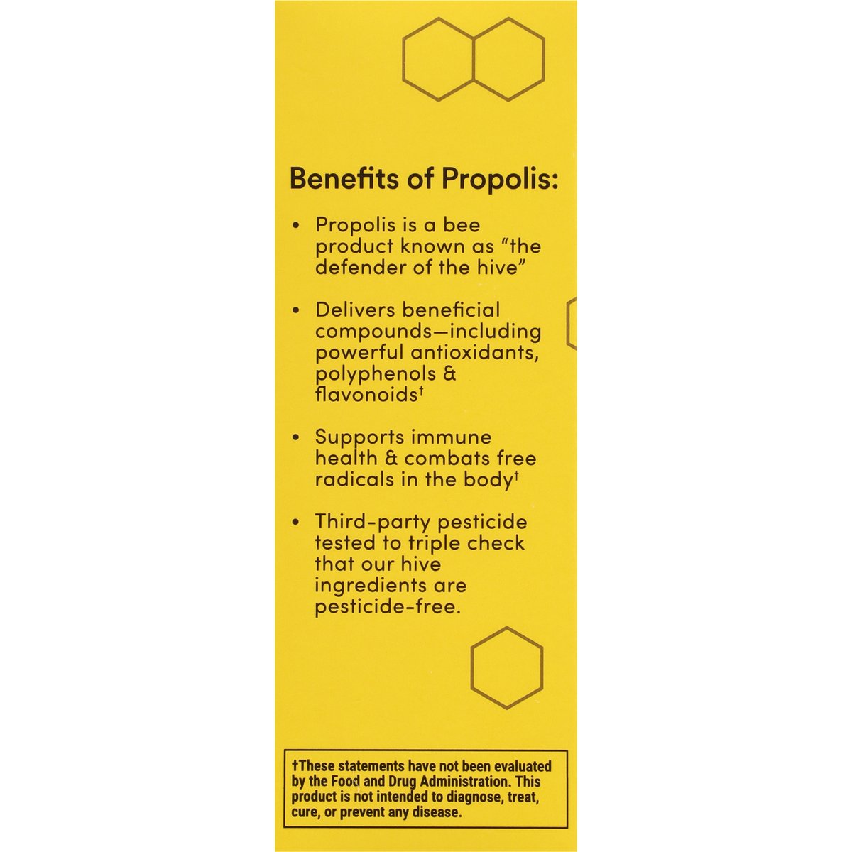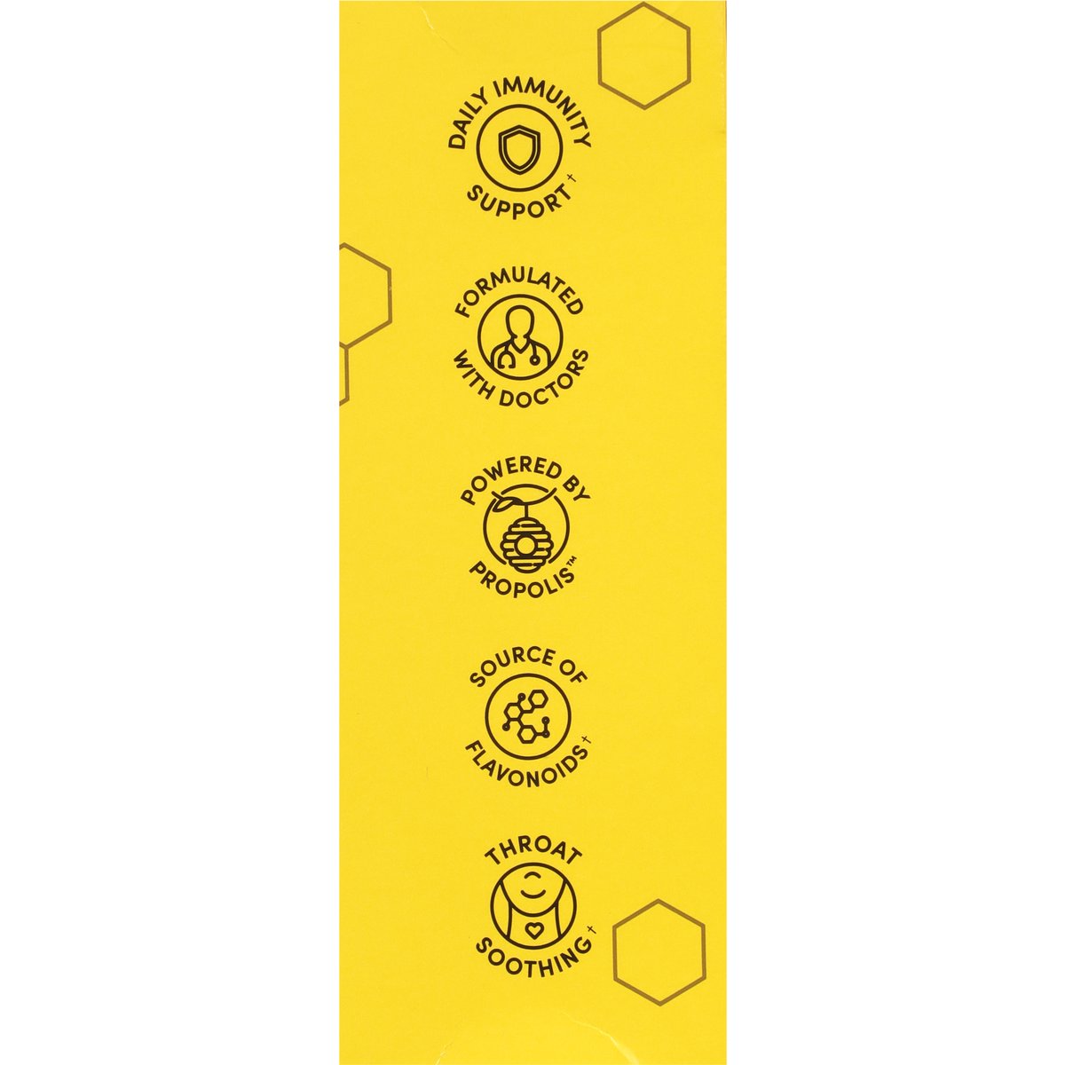 Dietary Supplement. 85 mg propolis extract per serving. Gluten free. Does Not Contain: Gluten, artificial preservatives, colors, artificial sweeteners, yeast or wheat. Immune support(a). Daily immune support(a). Formulated with doctors. Powered by Propolis. Source of flavonoids(a). Throat soothing(a). Benefits of Propolis: Propolis is a bee product known as the “defender of the hive”. Delivers beneficial compounds - including powerful antioxidants, polyphenols & flavonoids(a). Supports immune health & combats free radicals in the body(a). Third-party pesticide tested to triple check that our hive ingredients are pesticide-free. Certified B Corporation. Save the bees. (a) These statements have not been evaluated by the Food and Drug Administration. This product is not intended to diagnose, treat, cure, or prevent any disease.