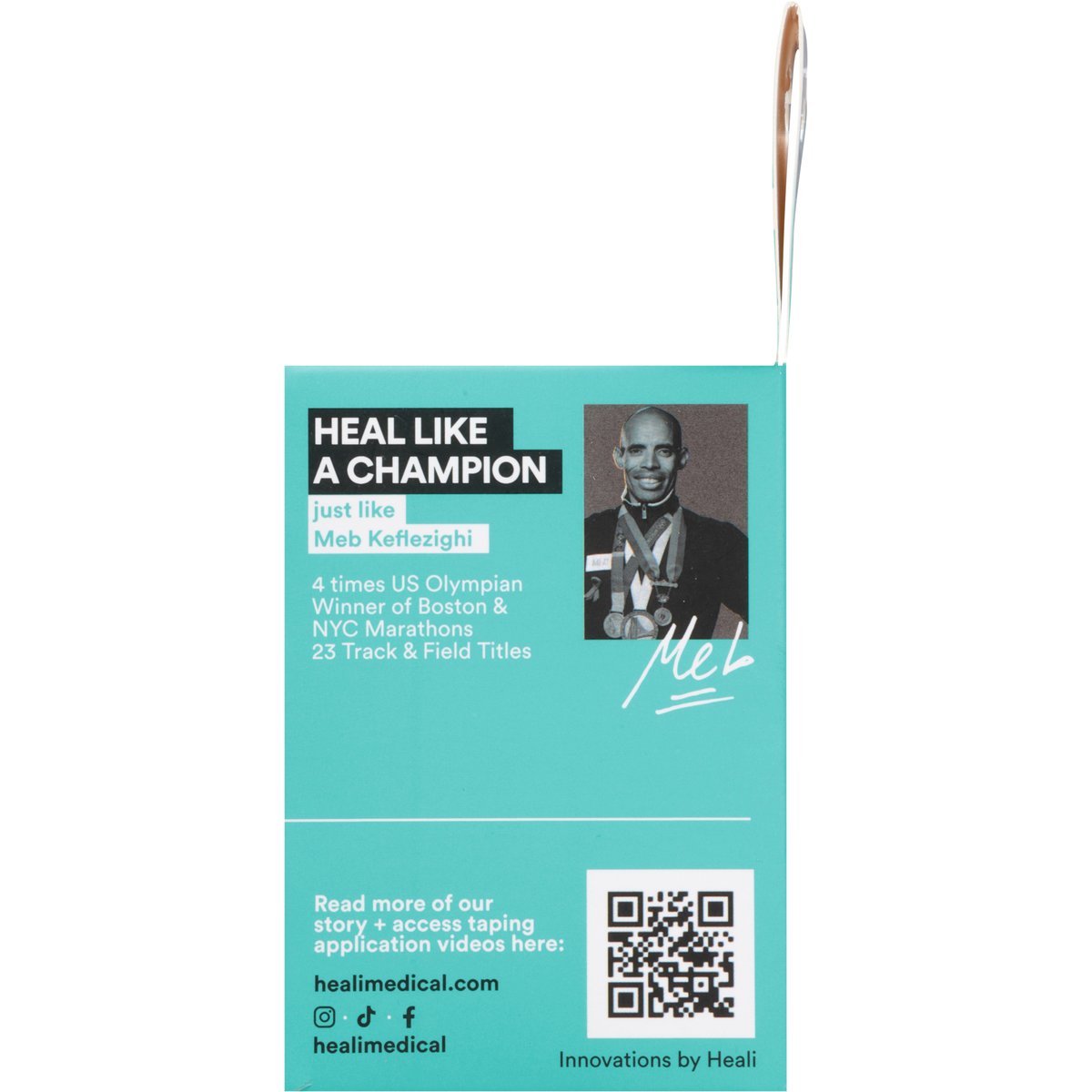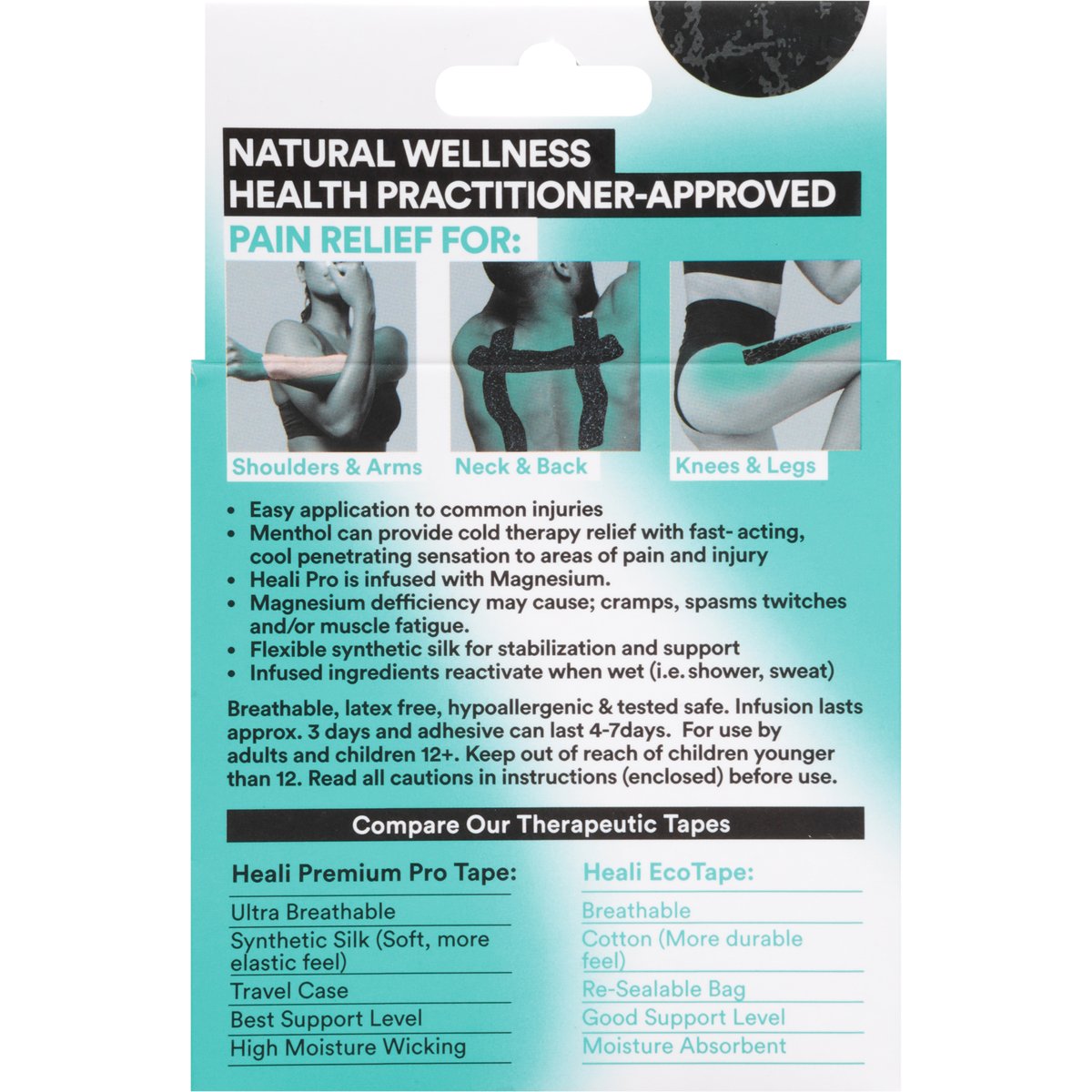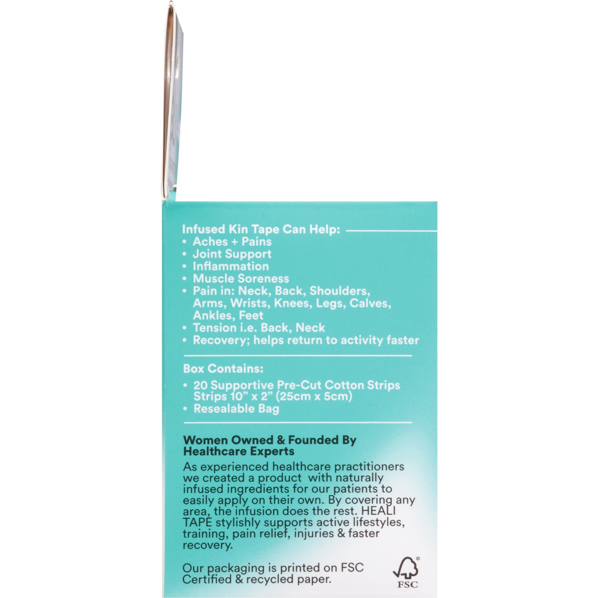 Box Contains: 20 supportive pre-cut cotton strips. Strips 10" x 2" (25cm x 5cm); Resealable bag. Created & trusted by Healthcare Practitioners. Reinventing pain relief, naturally. Kinesiology tape infused with magnesium + menthol for faster recovery & fast acting pain relief. Natural wellness health practitioner-approved pain relief for: Shoulder & arms. Neck & back. Knees & legs. Easy application to common injuries. Menthol can provide cold therapy relief with fast- acting, cool penetrating sensation to areas of pain and injury. Heali Pro is infused with Magnesium. Magnesium deficiency may cause; cramps, spasms twitches and/or muscle fatigue. Flexible synthetic silk for stabilization and support. Infused ingredients reactivate when wet (i.e.shower, sweat). Breathable, latex free, hypoallergenic & tested safe. Infusion lasts approx. 3 days and adhesive can last 4-7days. Compare Our Therapeutic Tapes: Heali Premium Pro Tape: Ultra breathable; Synthetic silk (Soft, more elastic feel); Travel case; Best support level; High moisture wicking. Heali EcoTape: Breathable; Cotton (More durable peel); Re-sealable bag; Good support Level; Moisture absorbent. Infused Kin Tape Can Help: Aches + pains; Joint support; Inflammation; Muscle soreness; Pain in: Neck, back, shoulders, arms, wrists, knees, legs, calves, ankles, feet. Tension i.e. back, neck. Recovery; helps return to activity faster. Heal like a champion just like Meb Keflezighi. 4 times US Olympian winner of Boston & NYC marathons 23 track & field titles. Warranties & remedies limited to product replacement cost. healimedical.com Read more of our story + access taping applications videos here: healimedical.com. Instagram; TikTok; Facebook: healimedical. Women Owned & Founded By Healthcare Experts: As experienced healthcare practitioners we created a product with naturally infused ingredients for our patients to easily apply on their own. By covering any area, the infusion does the rest. HEAL! TAPE stylishly supports active lifestyles, training, pain relief, injuries & faster recovery. Resealable bag. Our packaging is printed on FSC Certified & recycled paper. FSC. Tested by designed in Canada. Made in China.