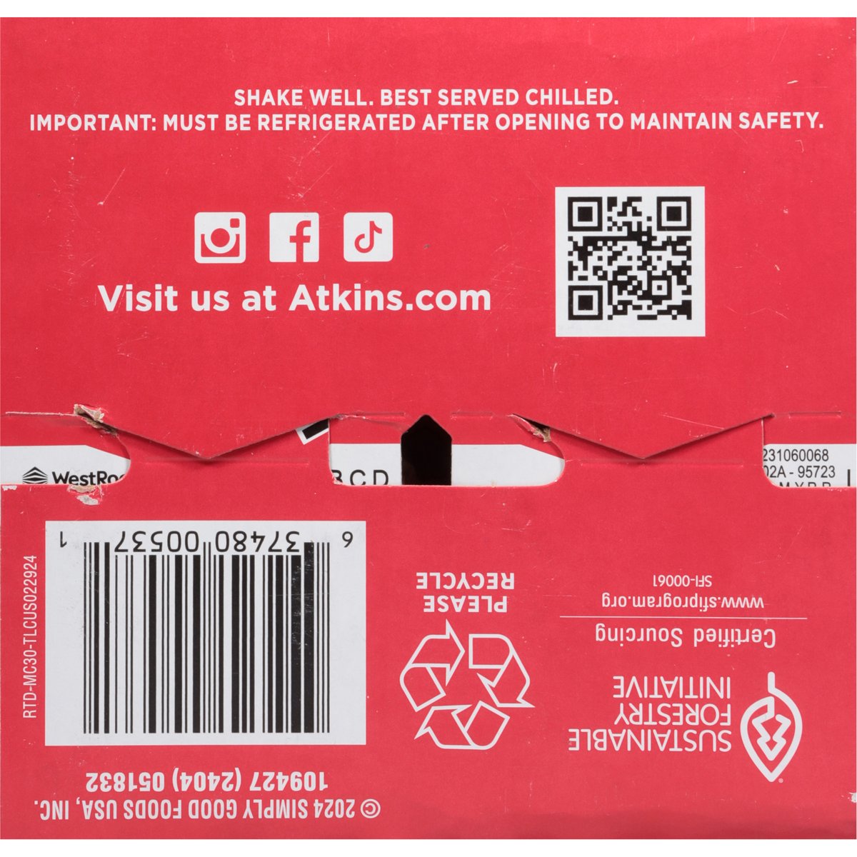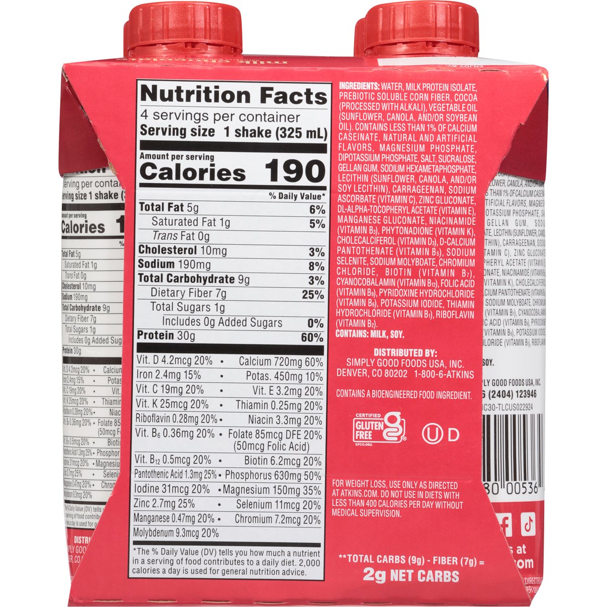 Naturally & artificially flavored. 30 g protein (per serving - see nutrition facts for calories content. 5 g of total fat). 1 g sugar (per serving - see nutrition facts for calories content. 5 g of total fat). 2 g net carbs (Total carbs (9 g) - fiber (7 g) = 2 g net carbs). 30 g sustained absorption protein & 7 g prebiotic fiber. Certified gluten free. 23 vitamins & minerals (per serving - see nutrition facts for calories content. 5 g of total fat). Contains a bioengineered food ingredient. Atkins strong (Helps maintain lean muscle mass when used in conjunction with an exercise routine). Muscle + gut health support complex. atkins.com. Instagram. Facebook. TikTok. 1-800-6-Atkins. Visit us at Atkins.com. To learn more about supporting muscle health while losing weight visit atkins.com. FSC: Mix - Board. Please recycle. recyclecartons.com. Sustainable Forestry Initiative: Certified sourcing. www.sfiprogram.org.
