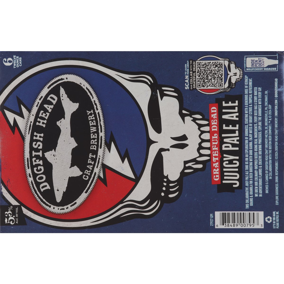 Tropical & citrus notes. This collaborative juicy pale ale took us on an exploration of goodness, starting with a generous dose of Kernza grains & granola for a beer bursting with good karma. Enjoy notes of bright citrus & tropical refreshment. We brew our culinary-inspired beers using real ingredients. Every beer has a story rooted in adventurous flavors & creative brewing processes. Explore the goodness with every sip. Explore goodness. Drink responsibly. Certified Independent Craft Brewers Association. dogfish.com. Scan to learn more about our collab with the Grateful Dead! @dogfishhead. Let's do this again, please recycle me. 5.3% alc. by vol. 10.6 Brewed & canned by Dogfish Head Craft Brewery, Milton, DE, Breinigsville, PA, Cincinnati, OH, in collaboration with the Boston Beer Company.