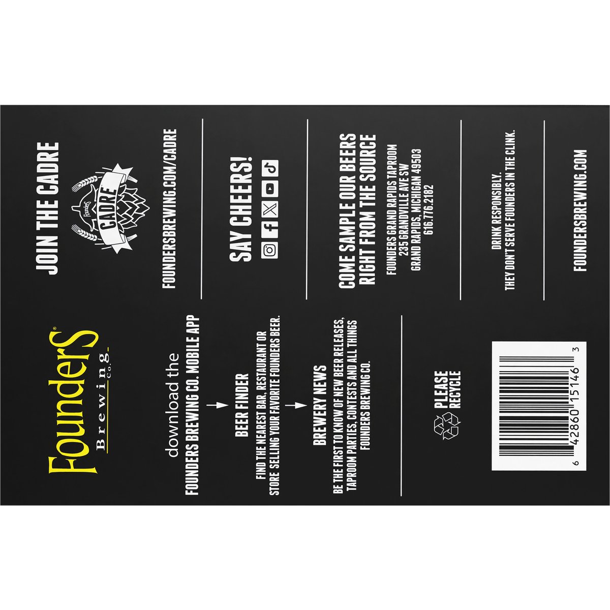 Citrusy notes with a smooth finish. Drink responsibly. They don't serve founders in the clink. foundersbrewing.com/cadre. Say cheers! Instagram. Facebook. X. YouTube. TikTok. Come sample our beers right from the source: Founders Grand Rapids Taproom 235 Grandville Ave SW Grand Rapids, Michigan 49503. 616.776.2182. Download the founders brewing co. mobile app. Beer Finder: Find the nearest bar, restaurant or store selling your favorite Founders beer. Brewery News: Be the first to know of new beer releases, taproom parties, contests and all things Founders Brewing Co. Founders Cadre: Join the Cadre. foundersbrewing.com/cadre. Please recycle. 8% abv. 16