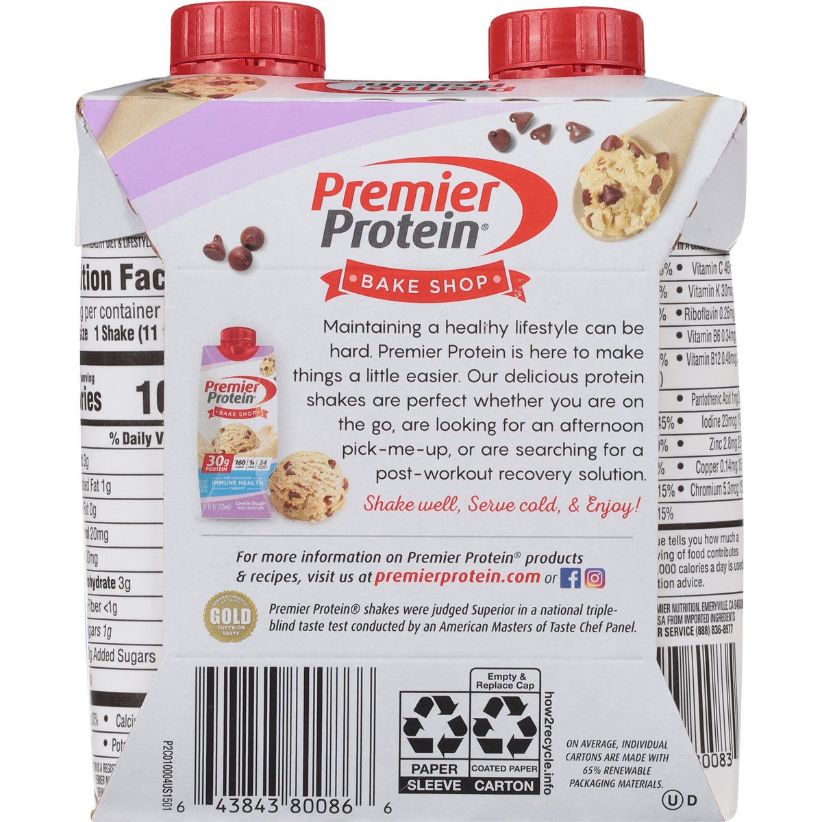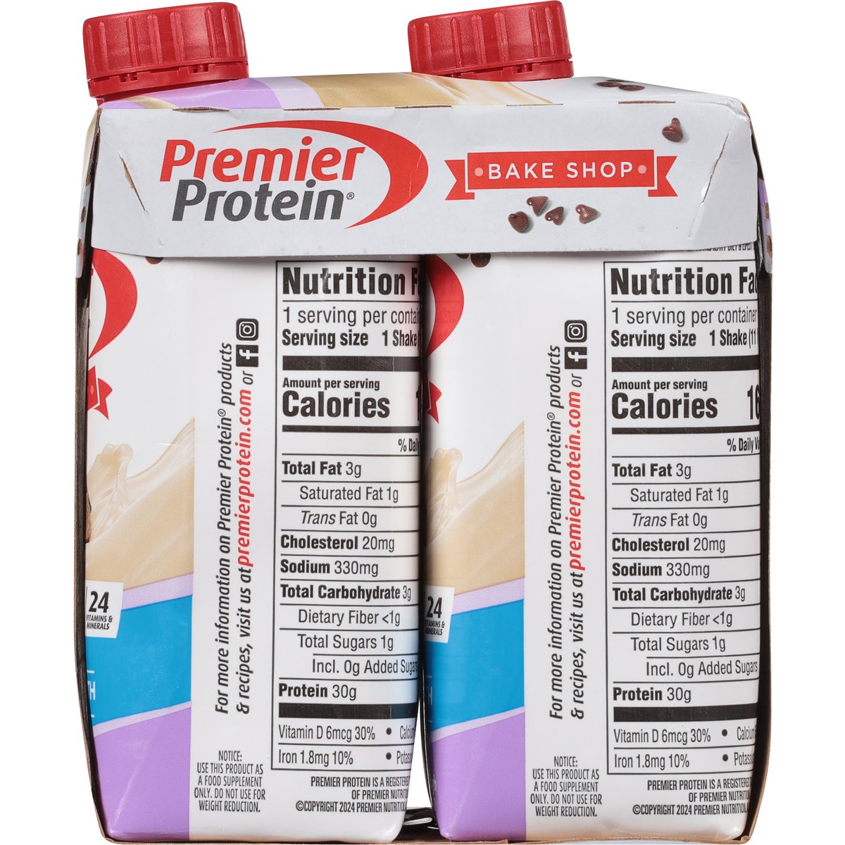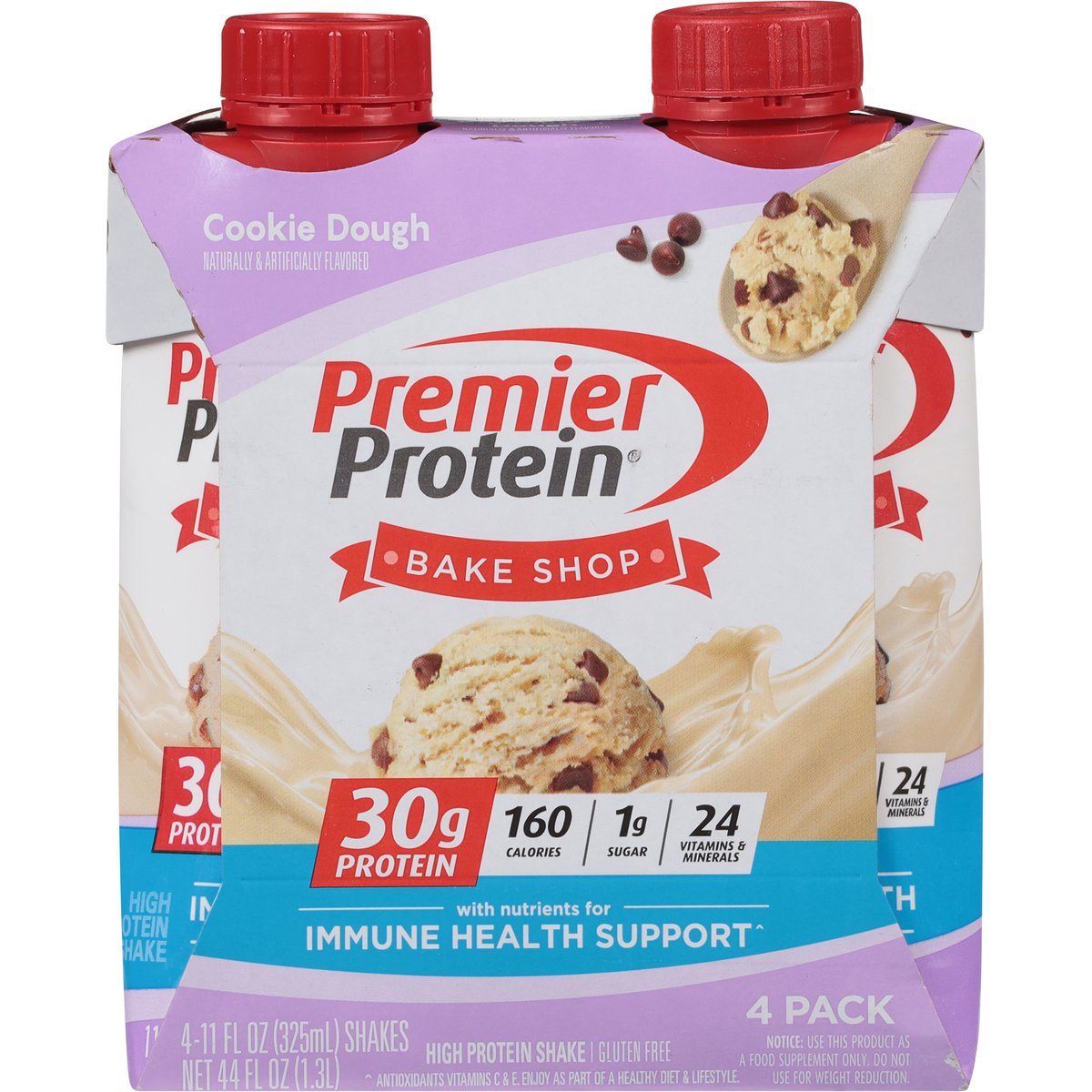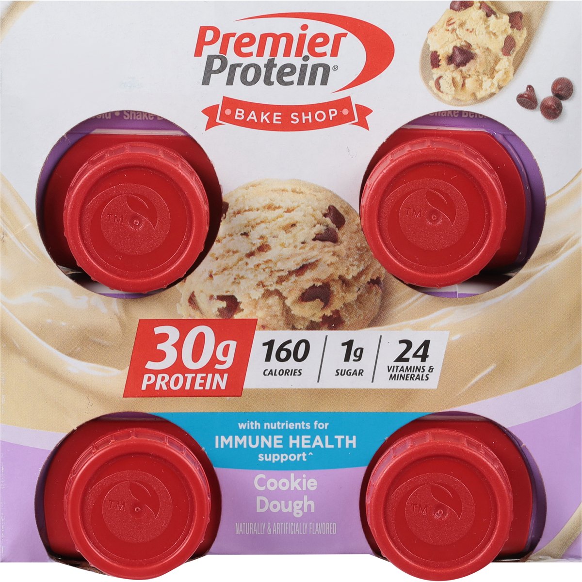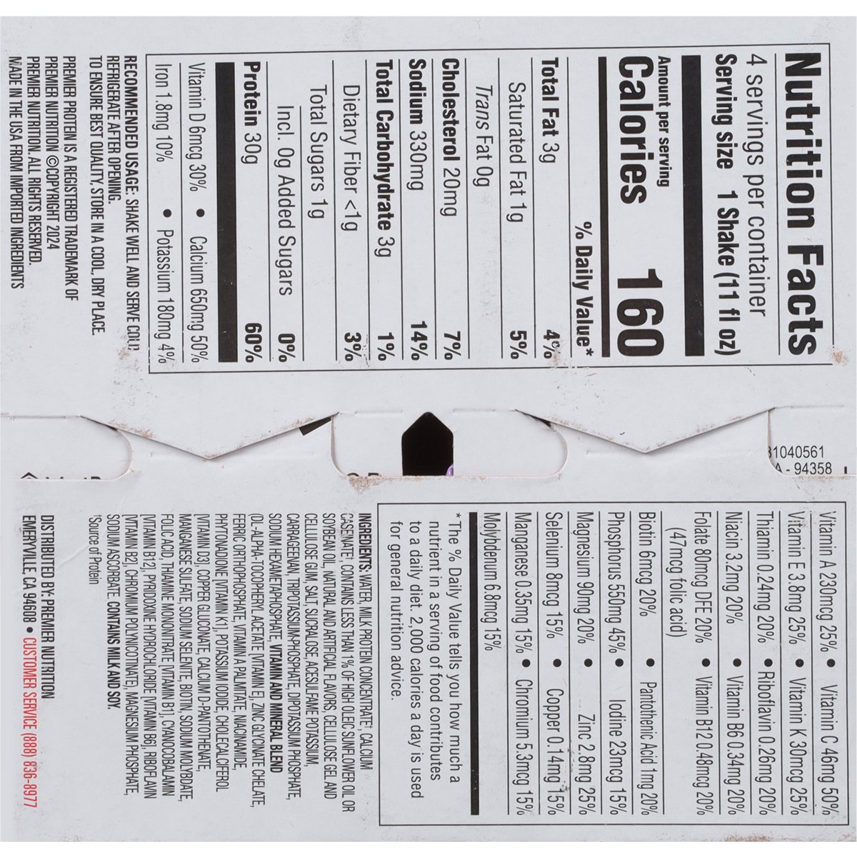 Naturally & artificially flavored. 30 g protein. 160 calories. 1 g sugar Gluten free. 24 vitamin & minerals. With nutrients for immune health support(a). Maintaining a healthy lifestyle can be hard. Premier Protein is here to make things a little easier. Our delicious protein shakes are perfect whether you are on the go, are looking for an afternoon pick-me-up, or are searching for a post-workout recovery solution. (a) Antioxidant vitamins C & E. Enjoy as part of a healthy diet & lifestyle. premierprotein.com. how2recycle.info. Facebook. Instagram. For more information on Premier Protein products & recipes, visit us at PremierProtein.com or Facebook, Instagram. Customer service (888) 836-8977. On average, individual cartons are made with 65% renewable packaging materials. Made in the USA from imported ingredients.